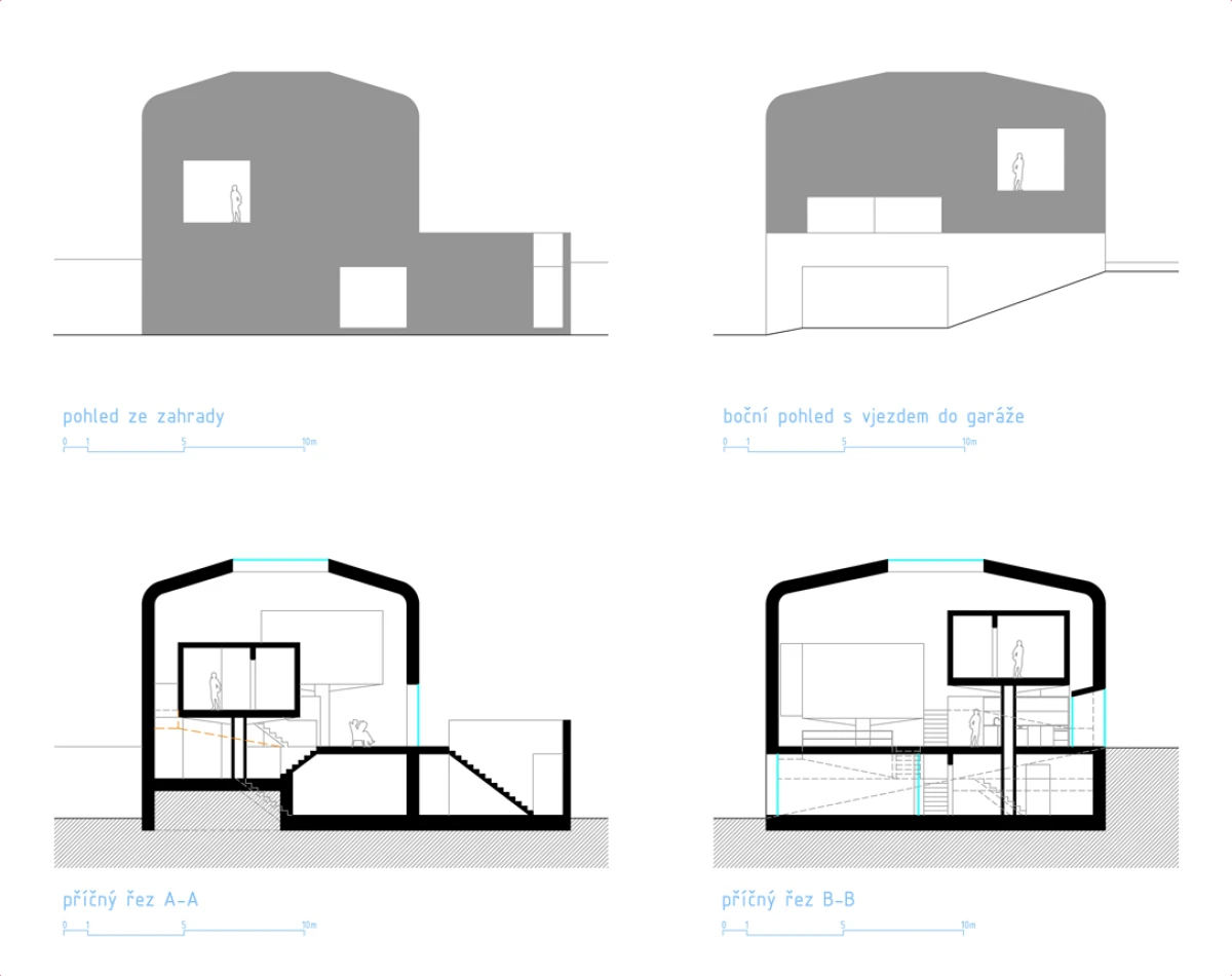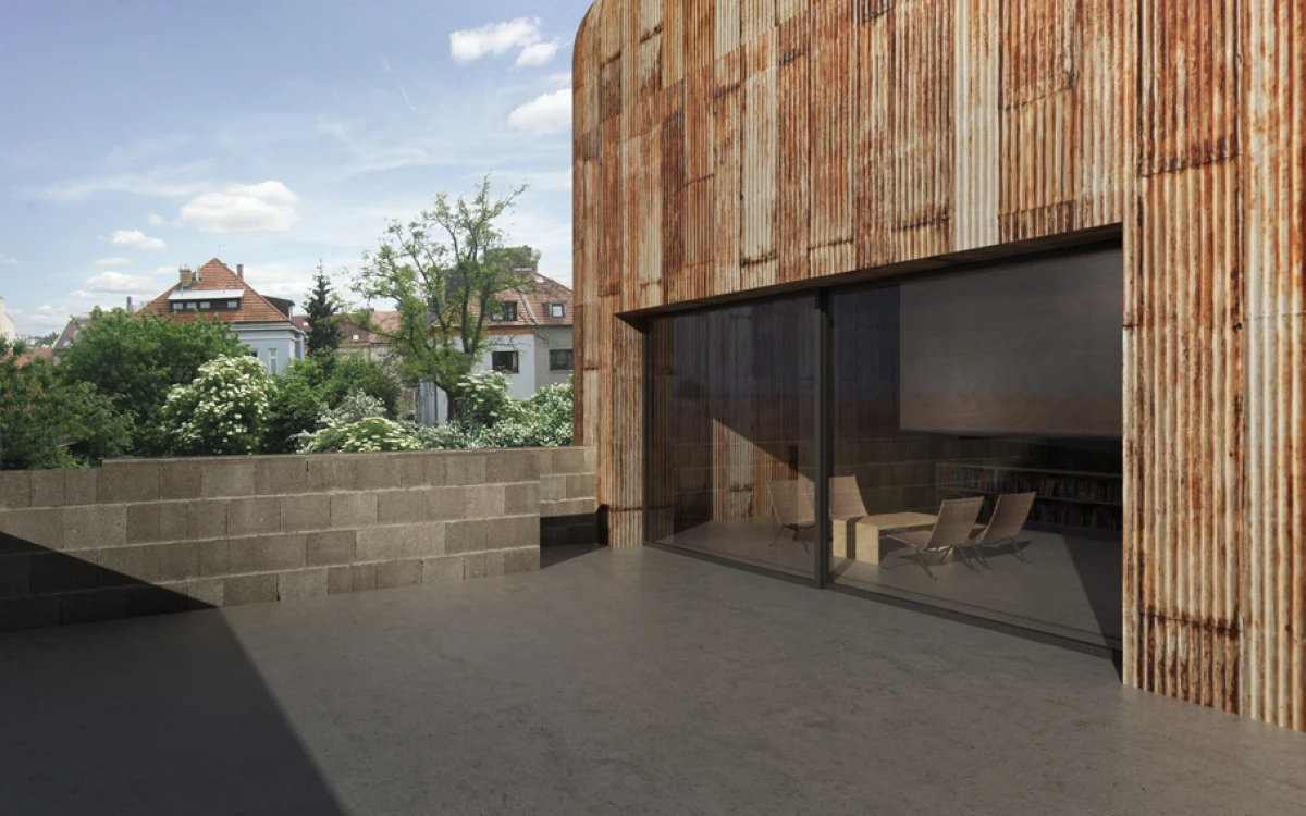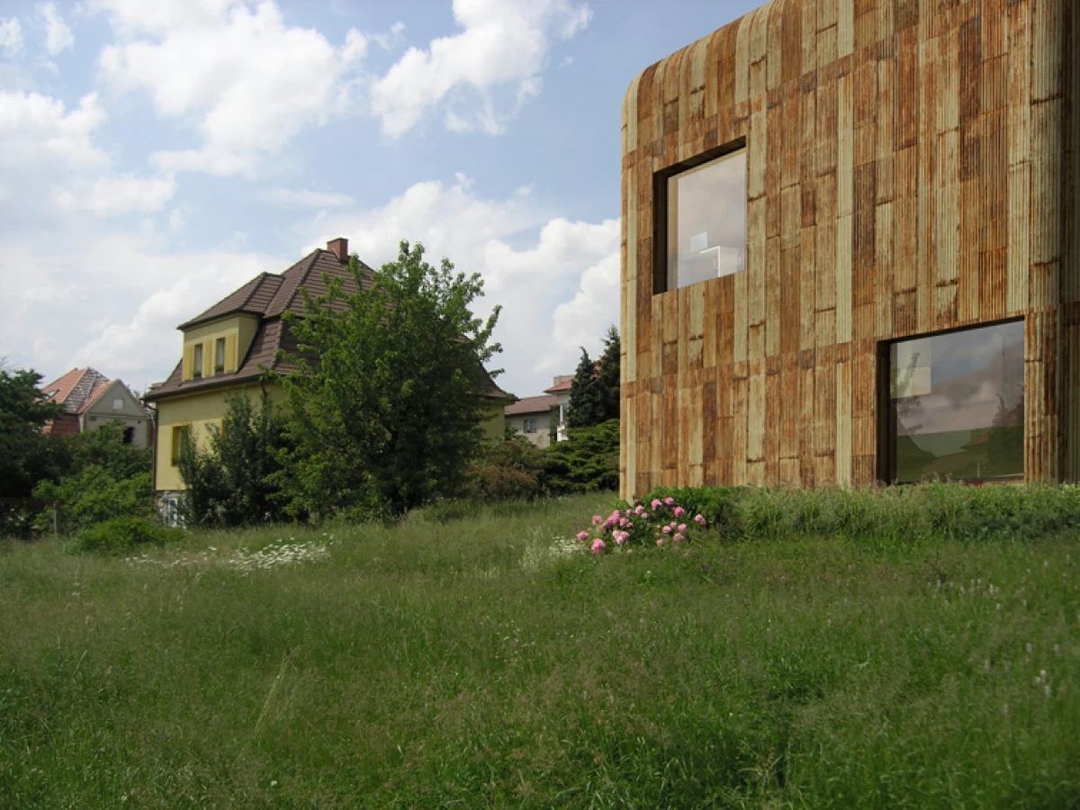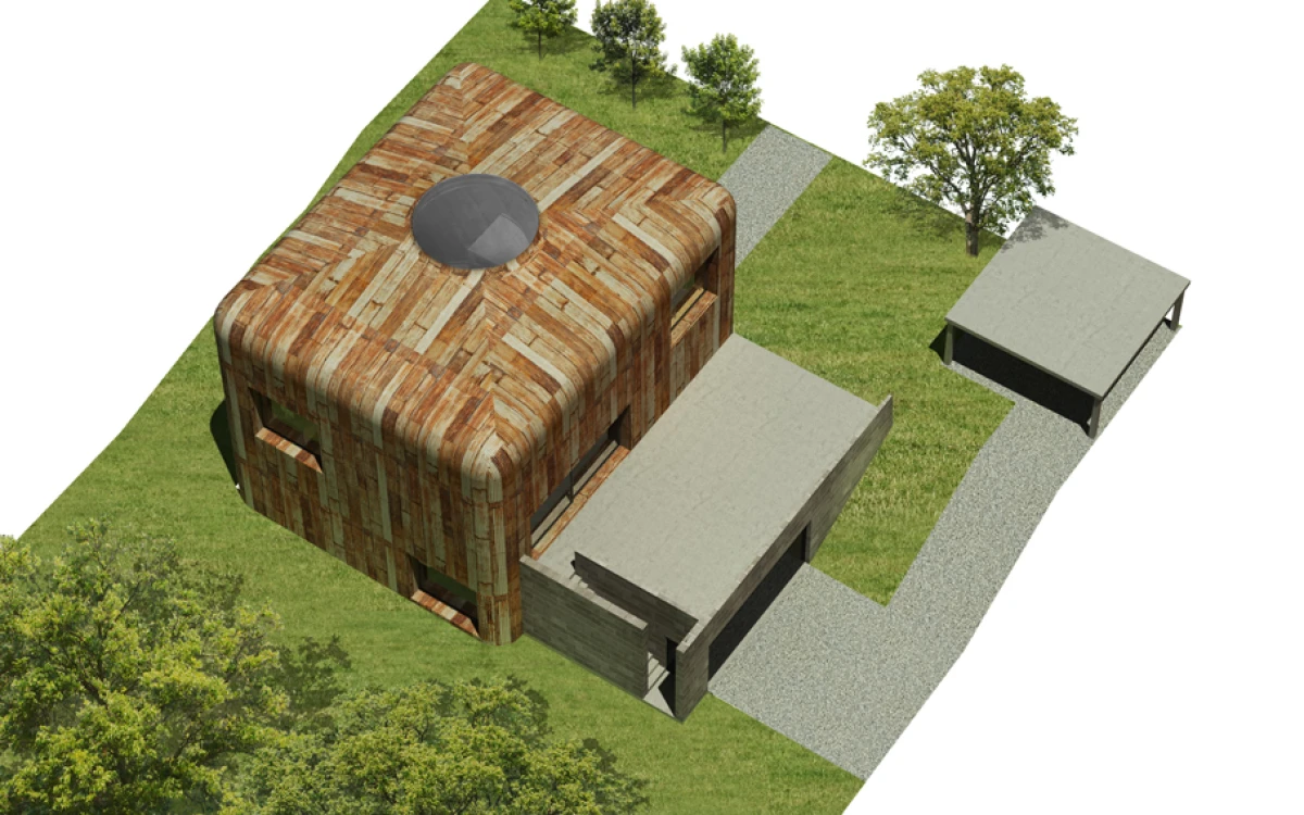 Základním rozhodnutím je odstranění nevyhovující stavby v rezidenční čtvrti v Praze Strašnicích, která nemá výjimečné kvality. Návrh dvoupodlažního kvádru na suterénní platformě se snaží navázat svým měřítkem na okolní zástavbu. Základní myšlenka stavby vychází z diskuze o výrazu a smyslu domu s jeho uživateli. Dům je jakýmsi úkrytem nebo ochranou před okolím. Pod pláštěm, který můžeme charakterizovat jako pokličku, se nachází jeden nedělený prostor – skrytý vnitřní svět. Výškové konfigurace vnitřních ploch v přízemí navazují na sklon okolního terénu. Na tuto rozčleněnou platformu jsou posazeny dva samostatné objekty na nohách, ve kterých se nachází dětské pokoje s vlastním sociálním zázemím. V jednom prostoru tak dochází jednak k separování různých funkcí, ale i k možnosti vzájemného potkávání. Velkorysost celé stavby je posílena střešním kruhovým otvorem, kterým se do vnitřních útrob dostává přirozené denní osvětlení. Koncept je v podstatě velmi jednoduchý, dalo by se říci, že jde o základní smysl stavění, kterým je ochrana v podobě střechy. Úkryt, který ve svých útrobách skrývá překvapení. Plášť stavby je navržen plechový, vnitřní prostory předpokládáme ze dřeva.