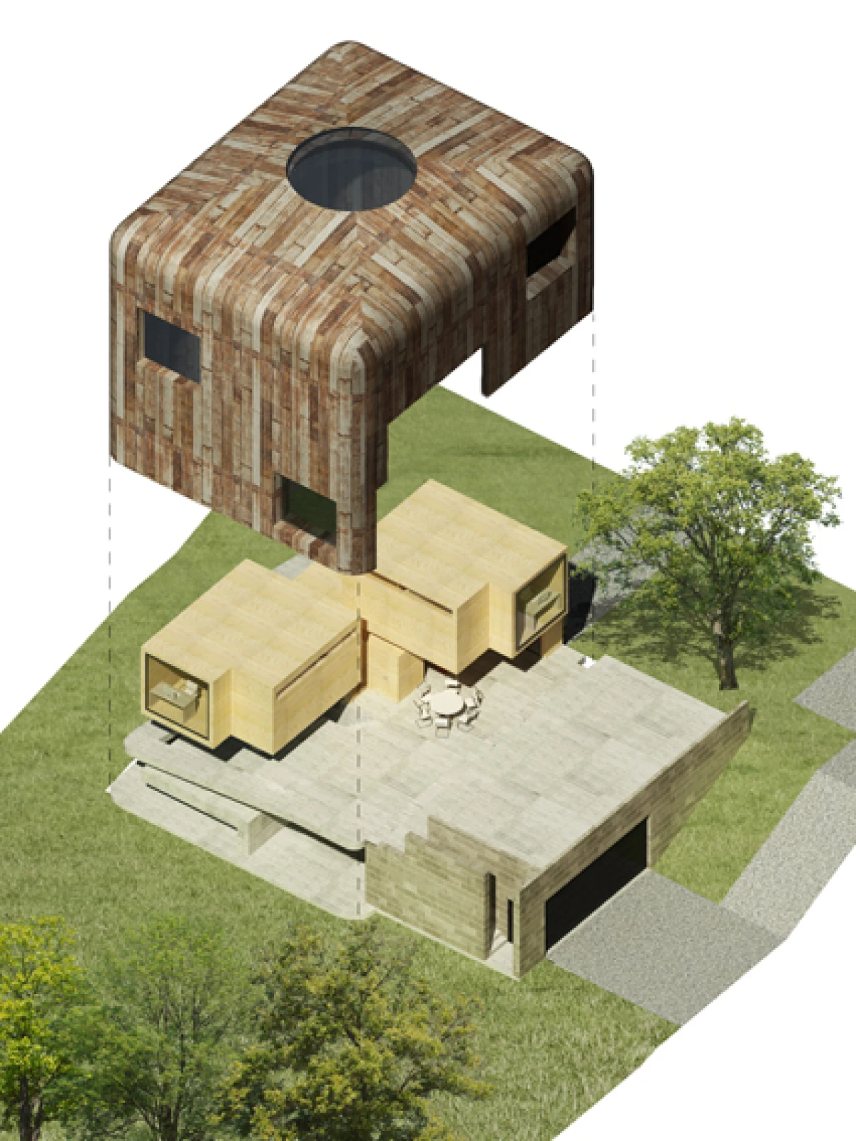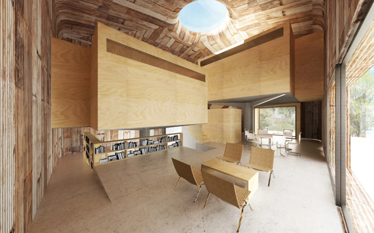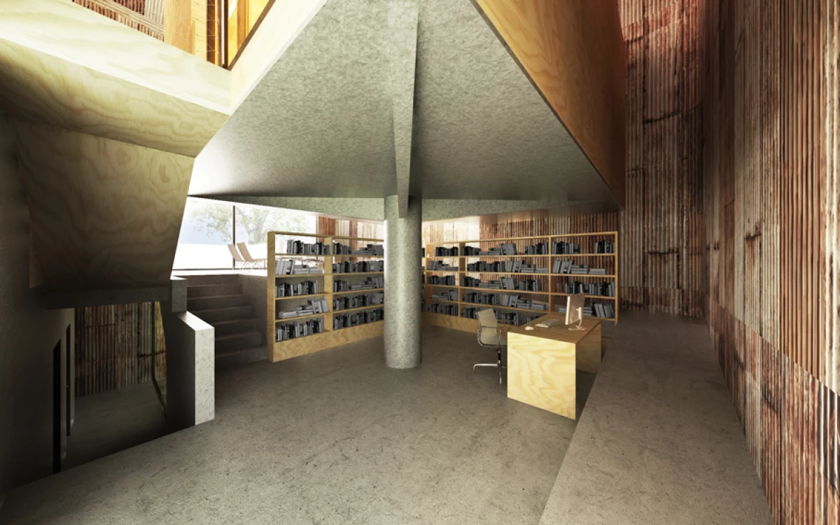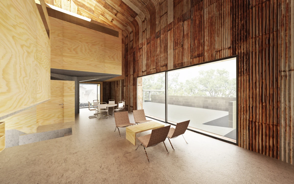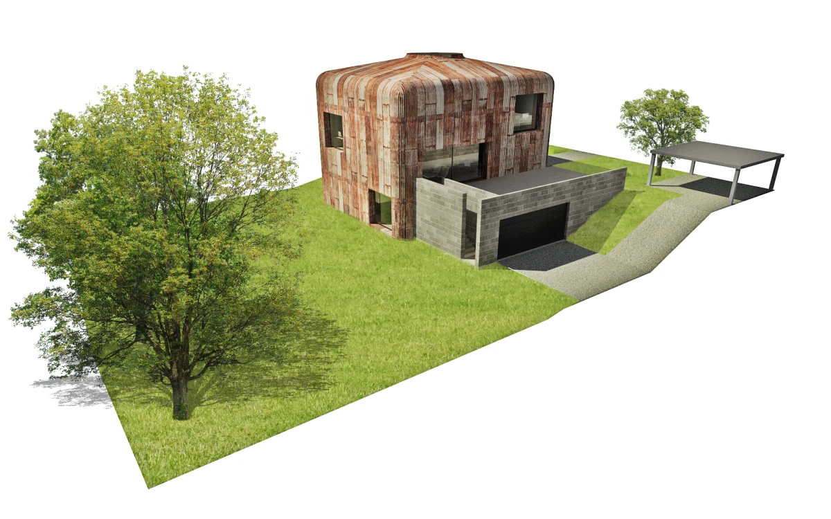 Základním rozhodnutím je odstranění nevyhovující stavby v rezidenční čtvrti v Praze Strašnicích, která nemá výjimečné kvality. Návrh dvoupodlažního kvádru na suterénní platformě se snaží navázat svým měřítkem na okolní zástavbu. Základní myšlenka stavby vychází z diskuze o výrazu a smyslu domu s jeho uživateli. Dům je jakýmsi úkrytem nebo ochranou před okolím. Pod pláštěm, který můžeme charakterizovat jako pokličku, se nachází jeden nedělený prostor – skrytý vnitřní svět. Výškové konfigurace vnitřních ploch v přízemí navazují na sklon okolního terénu. Na tuto rozčleněnou platformu jsou posazeny dva samostatné objekty na nohách, ve kterých se nachází dětské pokoje s vlastním sociálním zázemím. V jednom prostoru tak dochází jednak k separování různých funkcí, ale i k možnosti vzájemného potkávání. Velkorysost celé stavby je posílena střešním kruhovým otvorem, kterým se do vnitřních útrob dostává přirozené denní osvětlení. Koncept je v podstatě velmi jednoduchý, dalo by se říci, že jde o základní smysl stavění, kterým je ochrana v podobě střechy. Úkryt, který ve svých útrobách skrývá překvapení. Plášť stavby je navržen plechový, vnitřní prostory předpokládáme ze dřeva.
