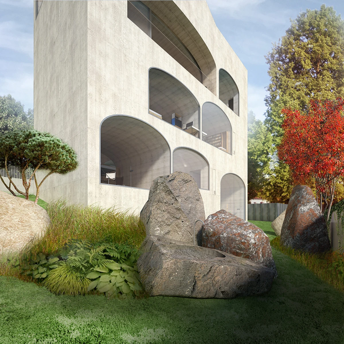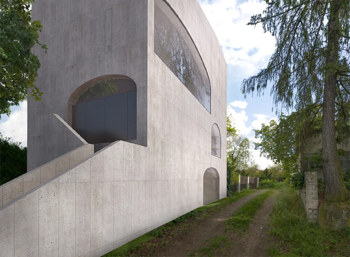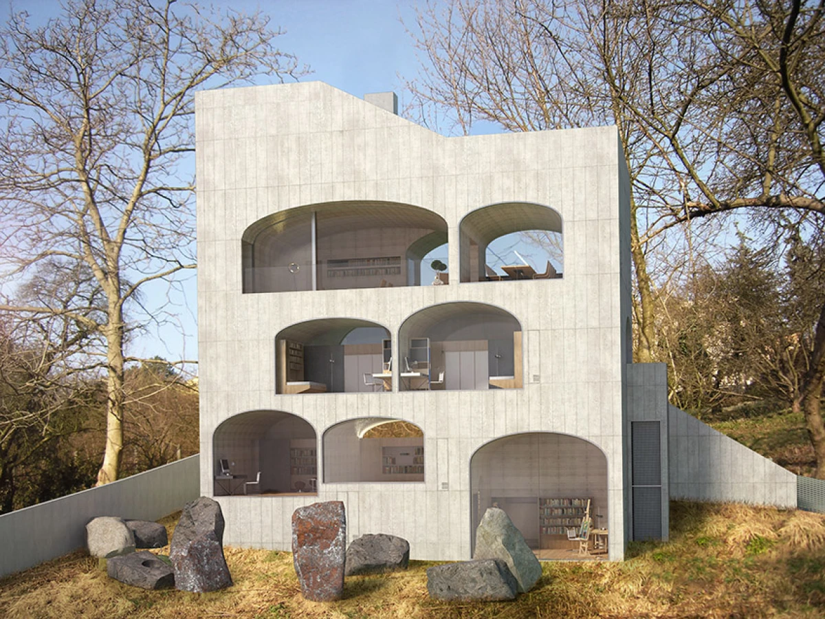 Dům s klenbami je situován do rezidenční čtvrti na Malvazinkách na pražském Smíchově, kde se v blízkosti nacházejí významné vily, například Winternitzova vila od Adolfa Loose a Karla Lhoty nebo Pickova vila od Ernsta Wiesnera. Vzhledem tomu, že stavba bude konfrontována s takto významnými objekty, vyvstala otázka, jakým způsobem lze zapojit novostavbu do tohoto prostředí? Co by mohlo v dnešní době směřovat návrh k formě, která by představovala reprezentační výraz? Co má přesně udávat charakter takové stavbě? Jedním z atributů, který se často používal v minulosti, byla klenba, která především znamenala statickou možnost zastropení prostoru. Známe množství historických palácových staveb, které vyzařují noblesu, jejíž výraz je postaven právě na použití klenby. Nicméně moderní doba s klenbou příliš nepracuje. Návrh lze tedy nazvat „Dům s klenbami“. Jedná se o důsledné uplatnění valených kleneb v místnostech, které přichází do kontaktu s denním světlem. Klenby vychází vždy od dvou metrů nad podlahou místnosti a přechází do poloviny elipsy. Všechny místnosti se svým celým profilem zřetelně propisují na fasádu a velká okna zároveň umožňují výhled do zahrady a na panorama Prahy. Díky stísněným podmínkám pozemku využívá navrhovaná novostavba možnost umístění zeleně na střeše. Z konstrukčního hlediska je objekt navržen z monolitického pohledového betonu, který bude v celém objektu ponechán jako finální pohledová úprava s otiskem letokruhů po vložených prknech. Zvolená koncepce umožnila řešit dispozici podle potřeb investora, který chtěl mít v každém patře jiný počet místností. Stěny nemusí stát na sobě, neboť nám zatížení pomáhají roznést klenby.