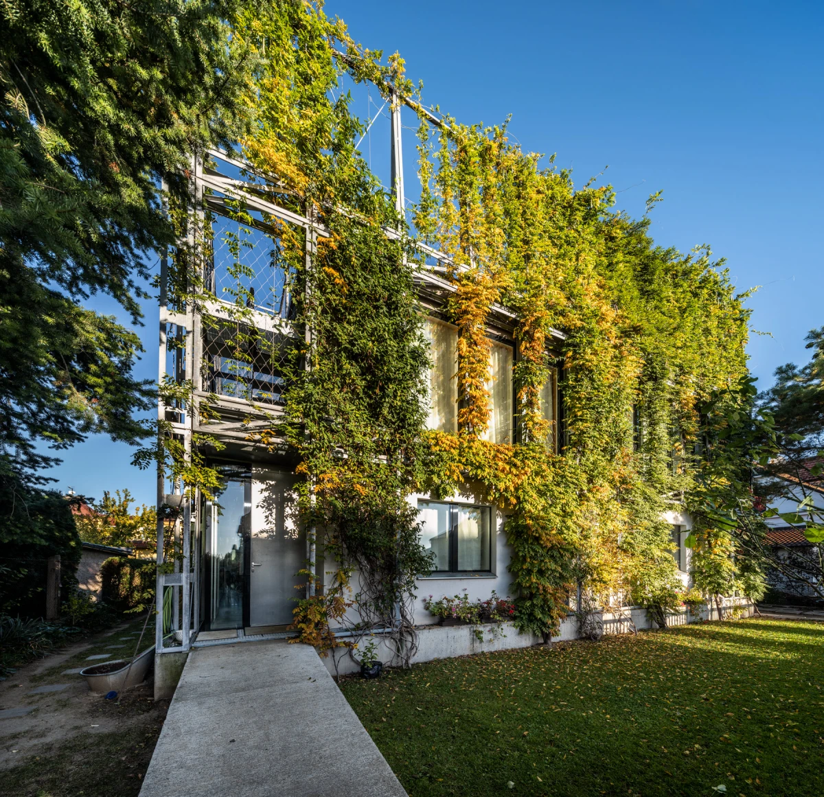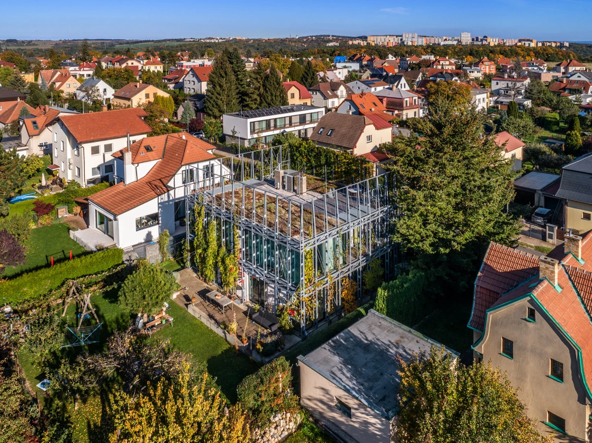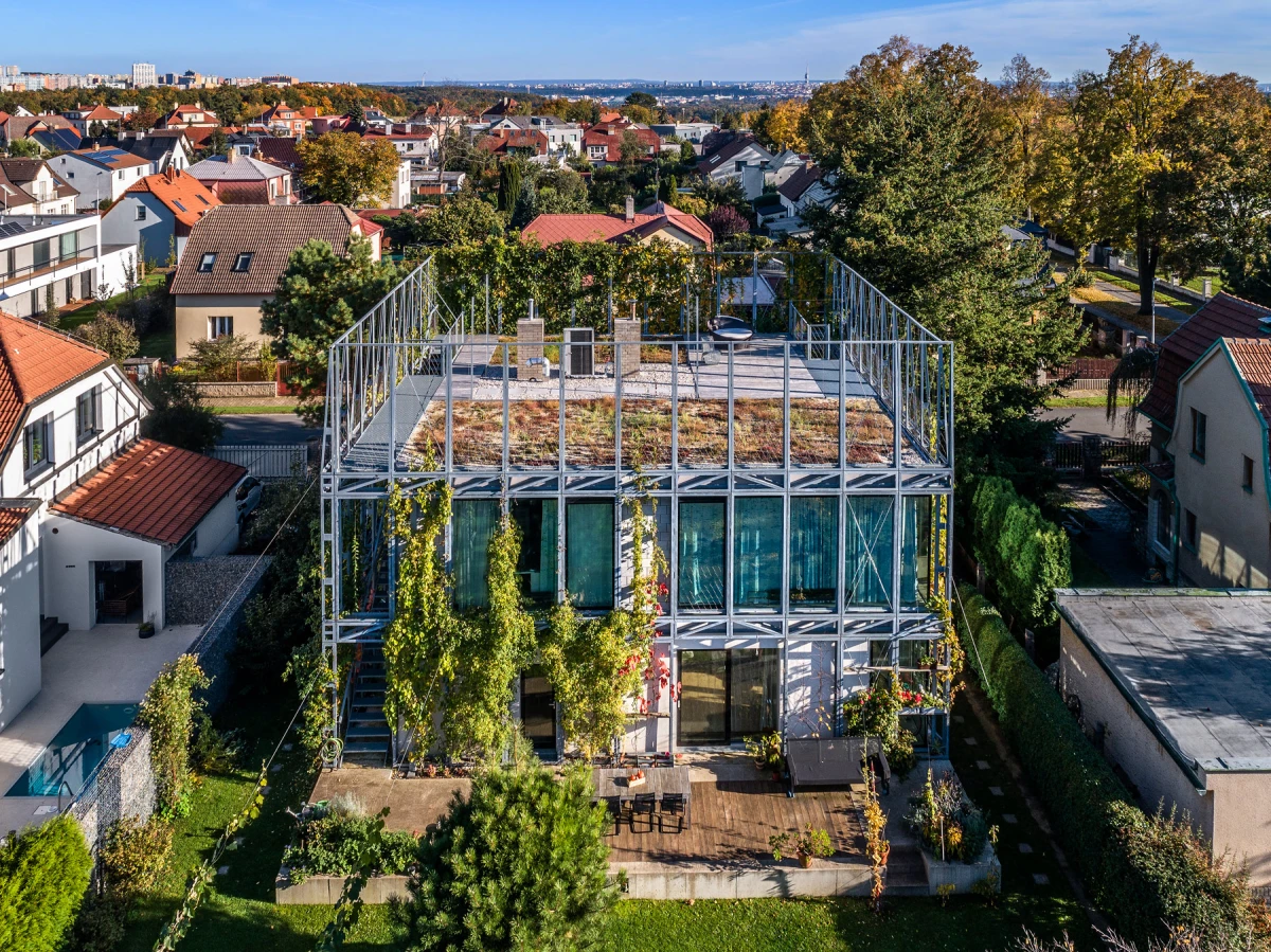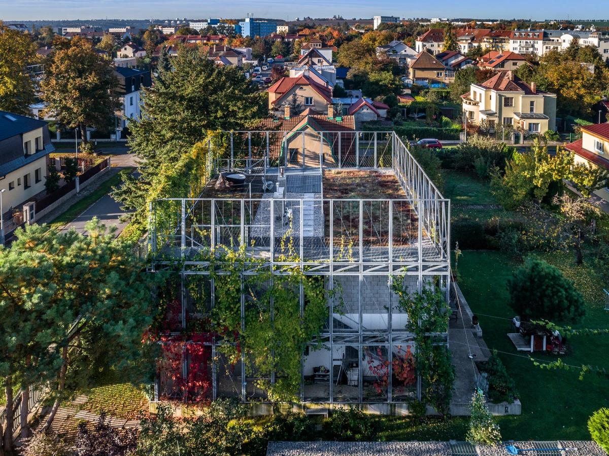 Jedná se o stavební úpravy rodinného domu v Praze, který byl jako původně rekreační objekt z třicátých let 20. století několikrát dostavován a přestavován k trvalému bydlení. Vzhledem k těmto zásahům přestala být jeho stabilita dostatečná. Základním rozhodnutím tedy bylo doplnit a celkově ztužit konstrukci ocelovým korzetem. Dalším problémem byla původní mansardová střecha, jež měla tloušťku pouhých 15 cm. Odstranění celé střechy, ke kterému jsme se nakonec rozhodli, umožnilo nejen efektivněji vyřešit problém zateplení, ale i úpravu dispozice ve druhém nadzemním podlaží tak, aby vyhovovala požadavkům investora. Druhé nadzemní podlaží je zároveň v místě bývalé terasy rozšířeno o nový pokoj. Ocelový korzet není pouze technickým prvkem, je zamýšlen i jako treláž pro popínání rostlin, a po architektonické stránce sceluje celý objekt. Zděná konstrukce druhého patra z lehkých betonových tvárnic doplňuje nosnou ocelovou část a pomáhá vynést novou střešní železobetonovou desku, která bude sloužit jako pochozí terasa se zahradní úpravou. Přístup na střechu rovnou ze zahrady umožňuje obslužné schodiště, které je navrženo z boční strany objektu v rámci ocelové konstrukce.