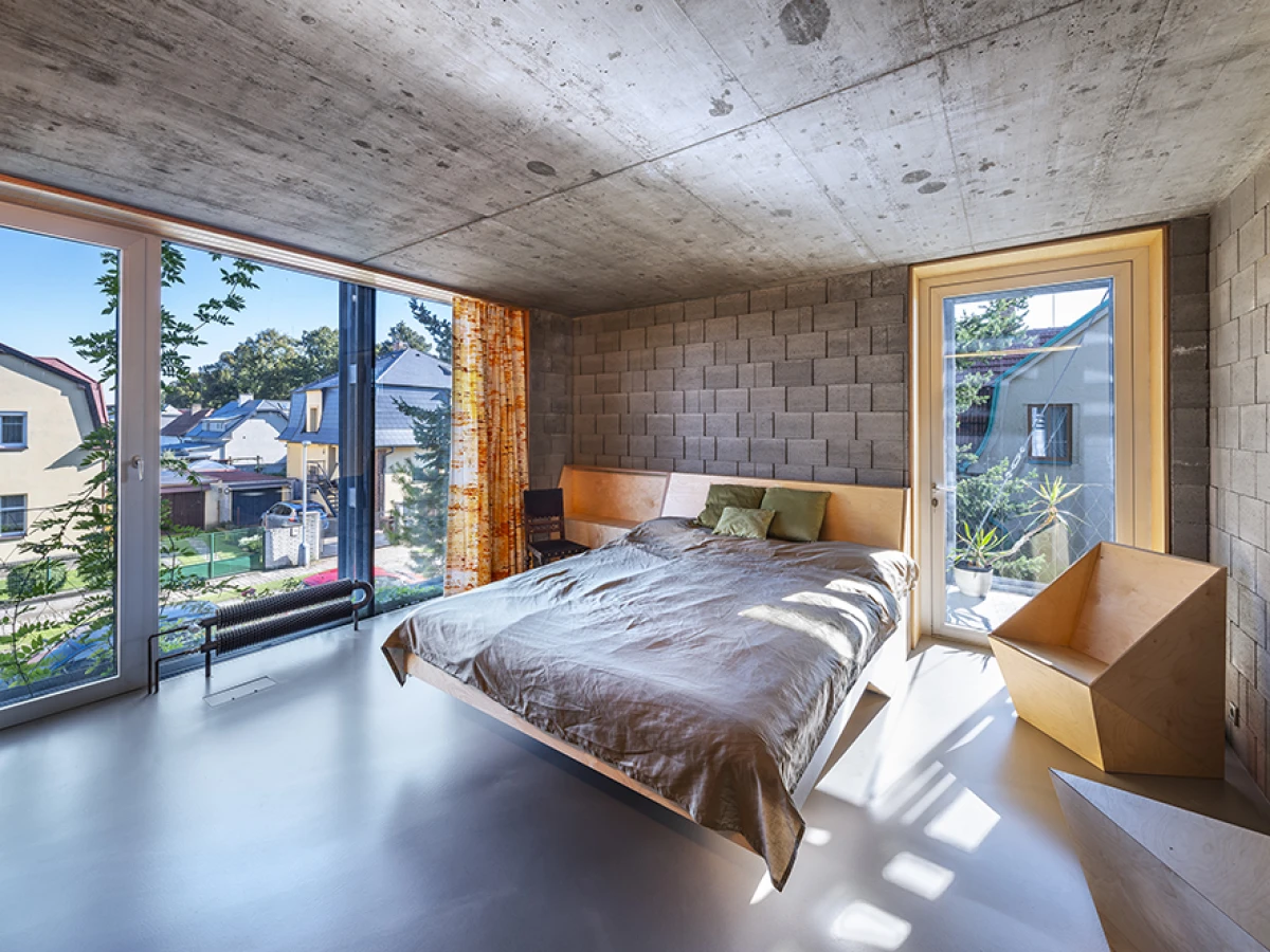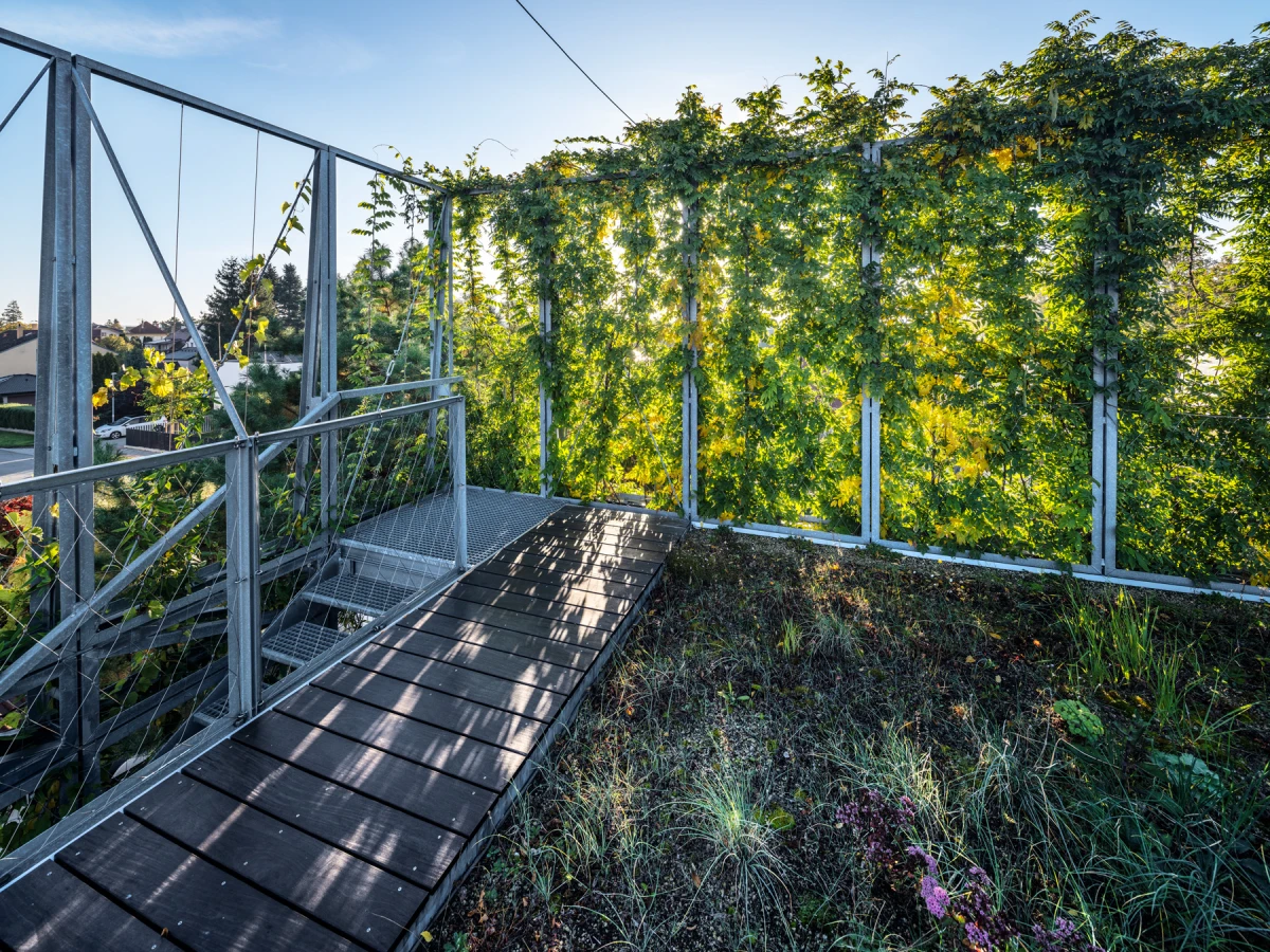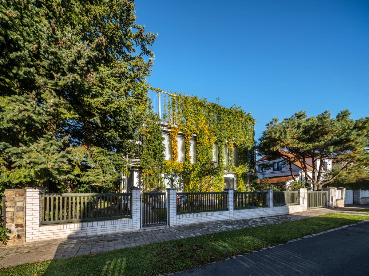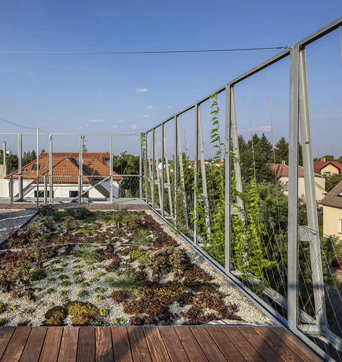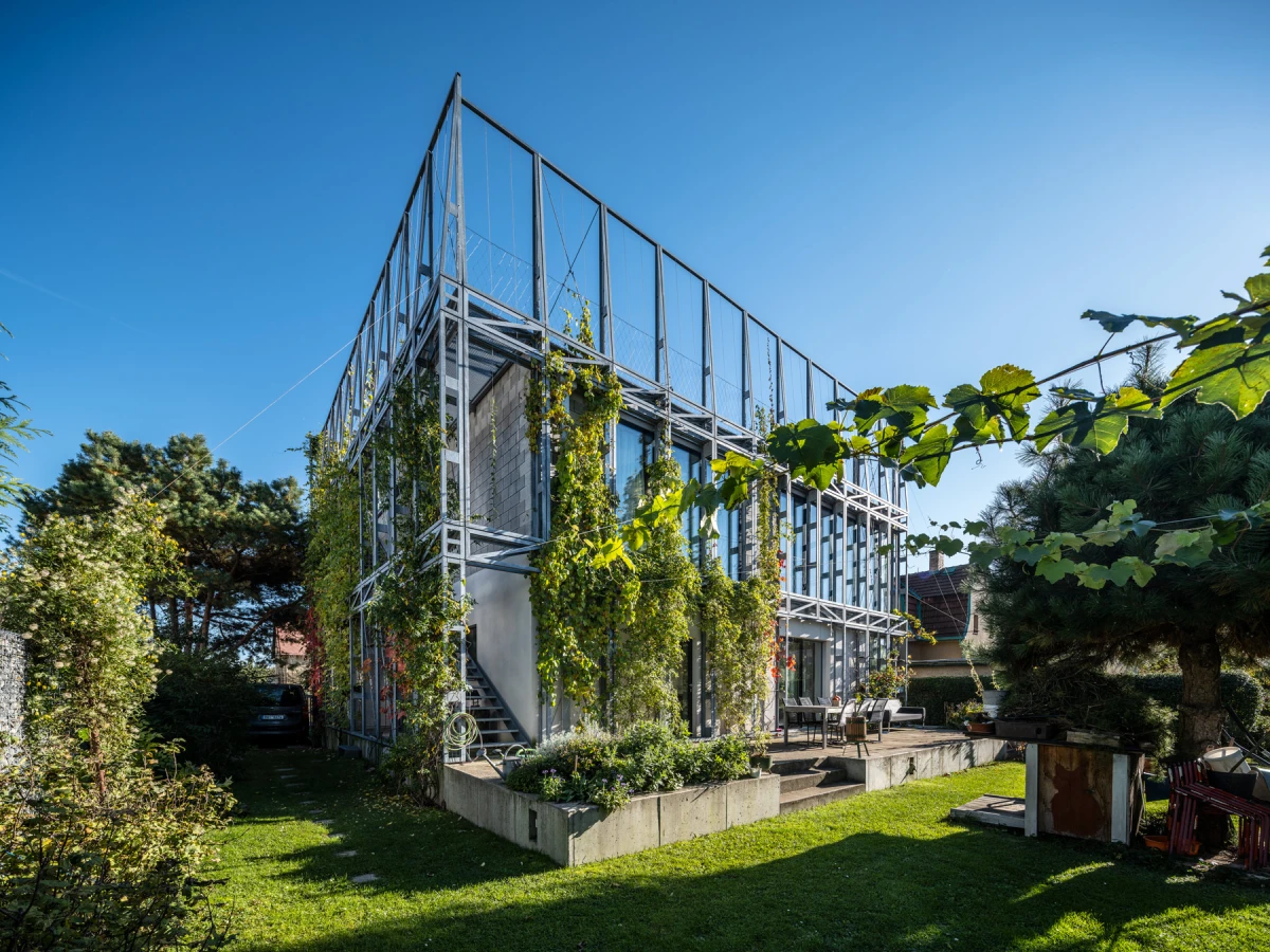 Jedná se o stavební úpravy rodinného domu v Praze, který byl jako původně rekreační objekt z třicátých let 20. století několikrát dostavován a přestavován k trvalému bydlení. Vzhledem k těmto zásahům přestala být jeho stabilita dostatečná. Základním rozhodnutím tedy bylo doplnit a celkově ztužit konstrukci ocelovým korzetem. Dalším problémem byla původní mansardová střecha, jež měla tloušťku pouhých 15 cm. Odstranění celé střechy, ke kterému jsme se nakonec rozhodli, umožnilo nejen efektivněji vyřešit problém zateplení, ale i úpravu dispozice ve druhém nadzemním podlaží tak, aby vyhovovala požadavkům investora. Druhé nadzemní podlaží je zároveň v místě bývalé terasy rozšířeno o nový pokoj. Ocelový korzet není pouze technickým prvkem, je zamýšlen i jako treláž pro popínání rostlin, a po architektonické stránce sceluje celý objekt. Zděná konstrukce druhého patra z lehkých betonových tvárnic doplňuje nosnou ocelovou část a pomáhá vynést novou střešní železobetonovou desku, která bude sloužit jako pochozí terasa se zahradní úpravou. Přístup na střechu rovnou ze zahrady umožňuje obslužné schodiště, které je navrženo z boční strany objektu v rámci ocelové konstrukce.