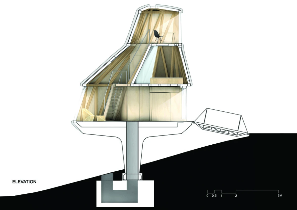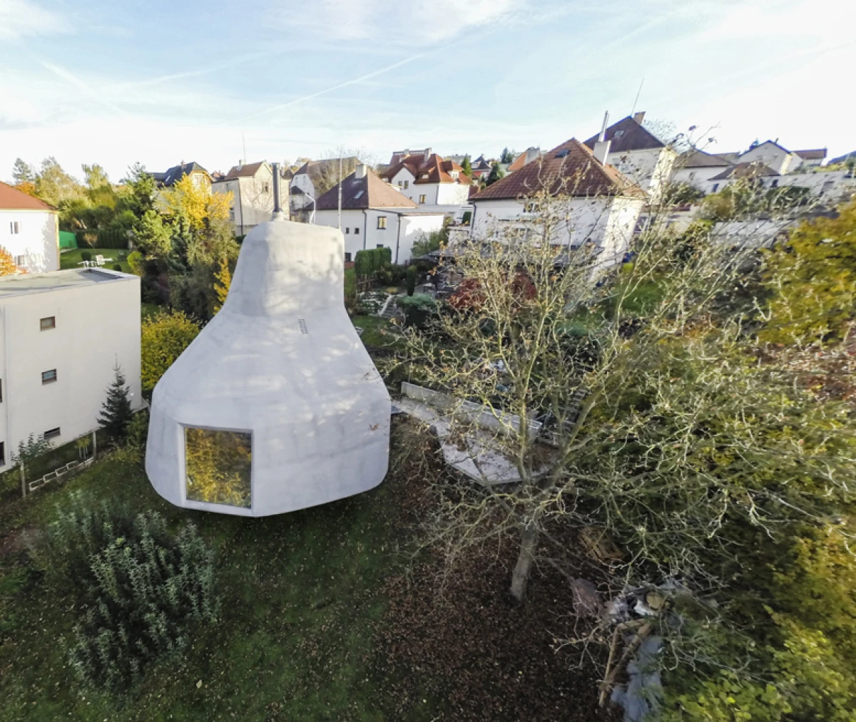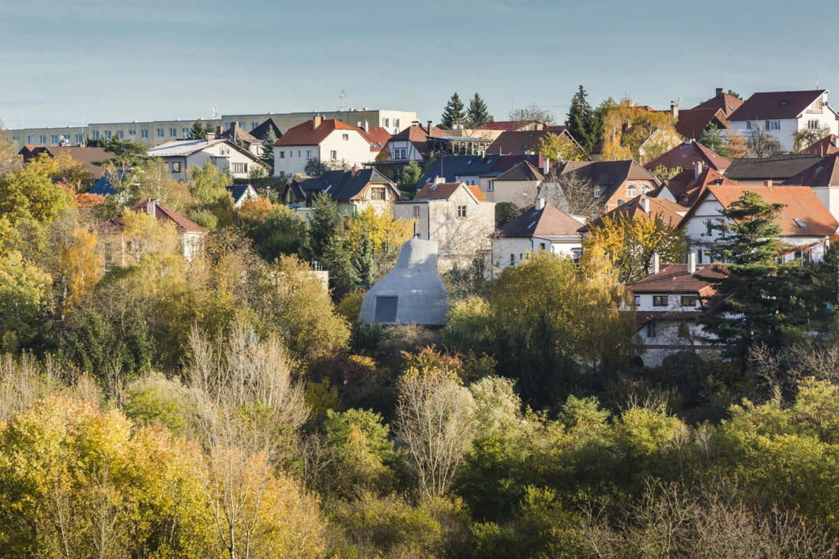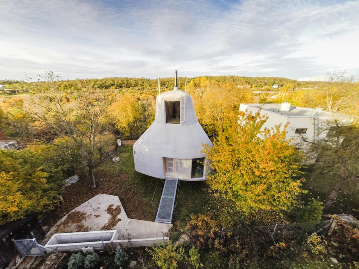Na severním svažitém pozemku v Praze - Kyjích, odkud je pěkný výhled do údolí, se nacházelo šest vzrostlých stromů. Navržená stavba rodinného domu se snaží svým malým objemem i charakterem mezi tyto stromy začlenit. Ve zkratce by se tedy dal koncept označit jako „dům v sadu“. Kromě vlivu zahrady měla výrazný podíl na výsledný tvar a dispoziční řešení také orientace ke světovým stranám a svažitost pozemku. Velké okno z obývacího pokoje pokrývá nejlepší severní pohled do údolí. Díky vrchnímu světlíku získává obývací pokoj, situovaný severně, také jižní osvětlení. Další pokoje jsou orientovány na jih, což je dětský pokoj v přízemí na východ je otočená ložnice rodičů ve druhém patře, která má i vlastní koupelnu a šatnu. Prostor obývacího pokoje přesahuje přes všechna patra a ukazuje celý dům i zevnitř. Půdorys stavby vychází z kruhu, jenž na jižní straně přechází do podoby dvou čtverců. V nich jsou situovány ložnice, kuchyň a sociální zázemí stavby. Dům je navržen jako dřevostavba se železobetonovým založením, které je v prudkém svahu minimalizováno pouze na jedinou betonovou nohu. Vzhledem k obtížným podmínkám by klasické zakládání většího objemu bylo finančně náročnější. Ocelová lávka staticky spolupůsobí a vytváří zavětrování betonové konstrukce. Dřevěná konstrukce se kompletně celá připravovala v softwaru SEMA. Trámky se před realizací přesně vyřezávaly na 3D frézce a na stavbě se konstrukce už jen vyskládala jako stavebnice. Stavba dřevěné konstrukce probíhala během letních prázdnin zhruba dva měsíce. Na trámky se z venkovní strany přišroubovala 18mm březová překližka, která konstrukci zavětrovala. Konstrukce i překližky jsou v interiéru přiznané. Na dřevěnou konstrukci je nastříkaný polyuretan v tloušťce 15 cm, který je zároveň finální pohledovou částí. Nepravidelný tvar stavby je rozložen do rovinných trojúhelníkových ploch, které zajišťují statickou tuhost dřevěné konstrukce, a zároveň umožnily i vložení březových překližkových desek.