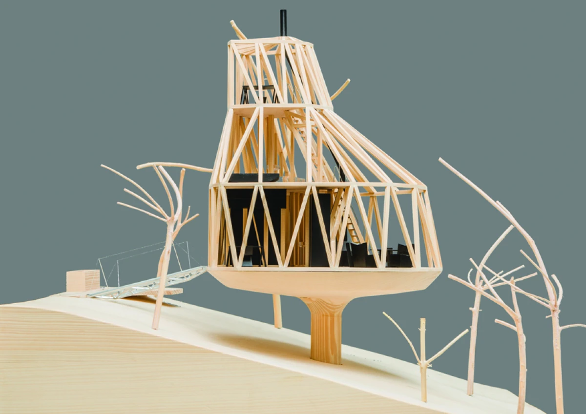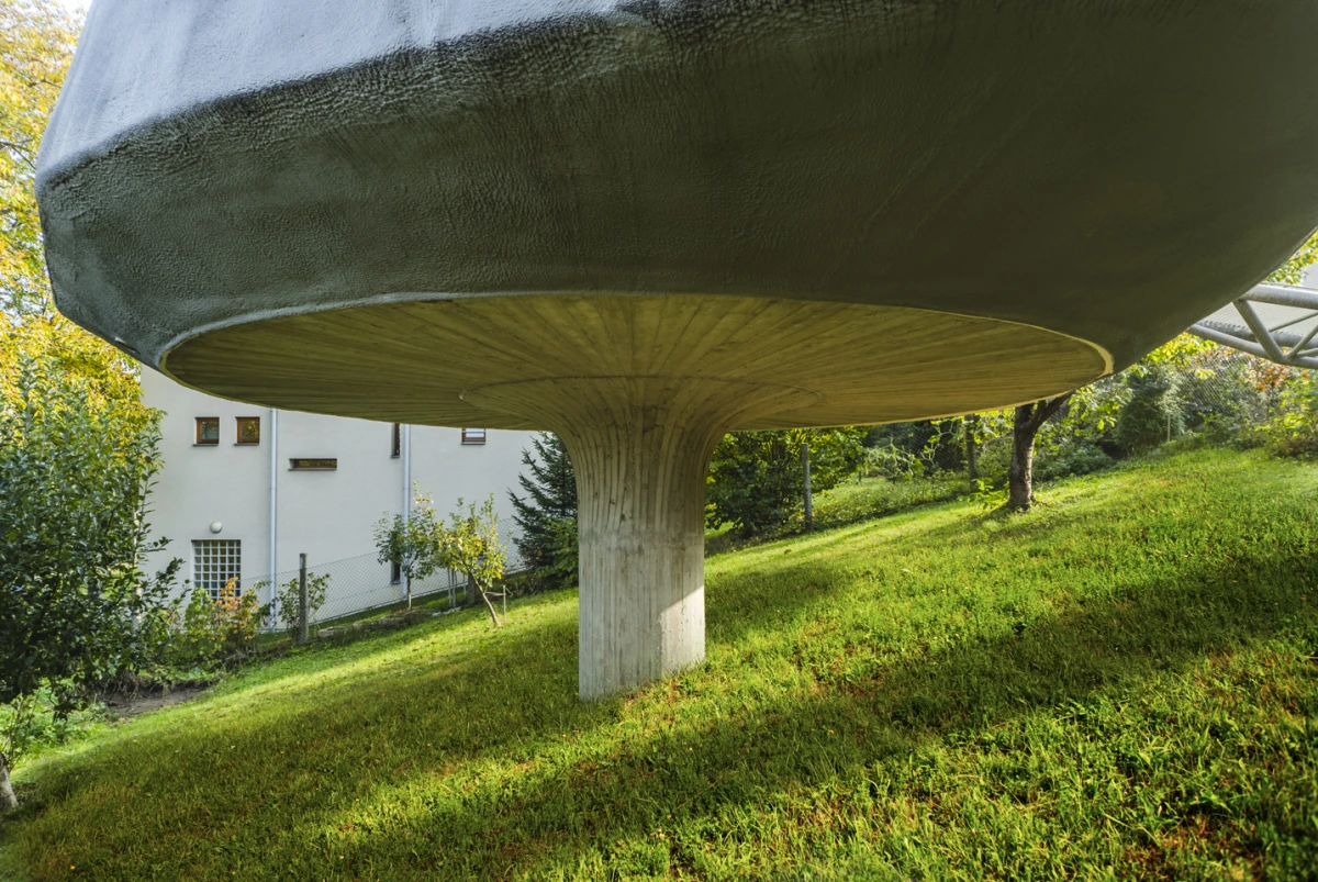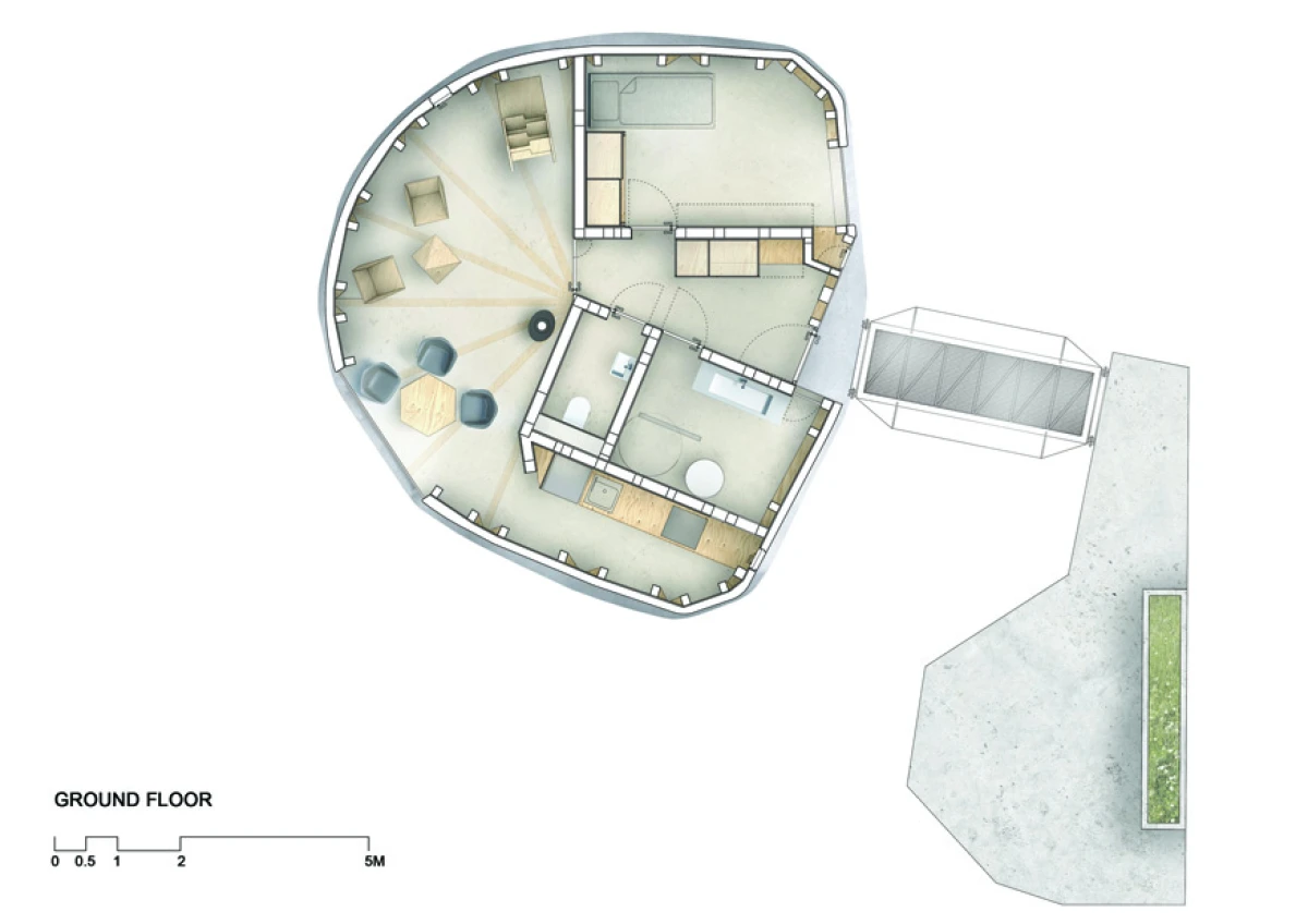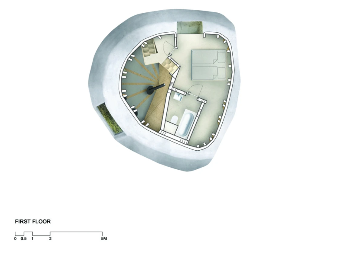 Na severním svažitém pozemku v Praze - Kyjích, odkud je pěkný výhled do údolí, se nacházelo šest vzrostlých stromů. Navržená stavba rodinného domu se snaží svým malým objemem i charakterem mezi tyto stromy začlenit. Ve zkratce by se tedy dal koncept označit jako „dům v sadu“. Kromě vlivu zahrady měla výrazný podíl na výsledný tvar a dispoziční řešení také orientace ke světovým stranám a svažitost pozemku. Velké okno z obývacího pokoje pokrývá nejlepší severní pohled do údolí. Díky vrchnímu světlíku získává obývací pokoj, situovaný severně, také jižní osvětlení. Další pokoje jsou orientovány na jih, což je dětský pokoj v přízemí na východ je otočená ložnice rodičů ve druhém patře, která má i vlastní koupelnu a šatnu. Prostor obývacího pokoje přesahuje přes všechna patra a ukazuje celý dům i zevnitř. Půdorys stavby vychází z kruhu, jenž na jižní straně přechází do podoby dvou čtverců. V nich jsou situovány ložnice, kuchyň a sociální zázemí stavby. Dům je navržen jako dřevostavba se železobetonovým založením, které je v prudkém svahu minimalizováno pouze na jedinou betonovou nohu. Vzhledem k obtížným podmínkám by klasické zakládání většího objemu bylo finančně náročnější. Ocelová lávka staticky spolupůsobí a vytváří zavětrování betonové konstrukce. Dřevěná konstrukce se kompletně celá připravovala v softwaru SEMA. Trámky se před realizací přesně vyřezávaly na 3D frézce a na stavbě se konstrukce už jen vyskládala jako stavebnice. Stavba dřevěné konstrukce probíhala během letních prázdnin zhruba dva měsíce. Na trámky se z venkovní strany přišroubovala 18mm březová překližka, která konstrukci zavětrovala. Konstrukce i překližky jsou v interiéru přiznané. Na dřevěnou konstrukci je nastříkaný polyuretan v tloušťce 15 cm, který je zároveň finální pohledovou částí. Nepravidelný tvar stavby je rozložen do rovinných trojúhelníkových ploch, které zajišťují statickou tuhost dřevěné konstrukce, a zároveň umožnily i vložení březových překližkových desek.