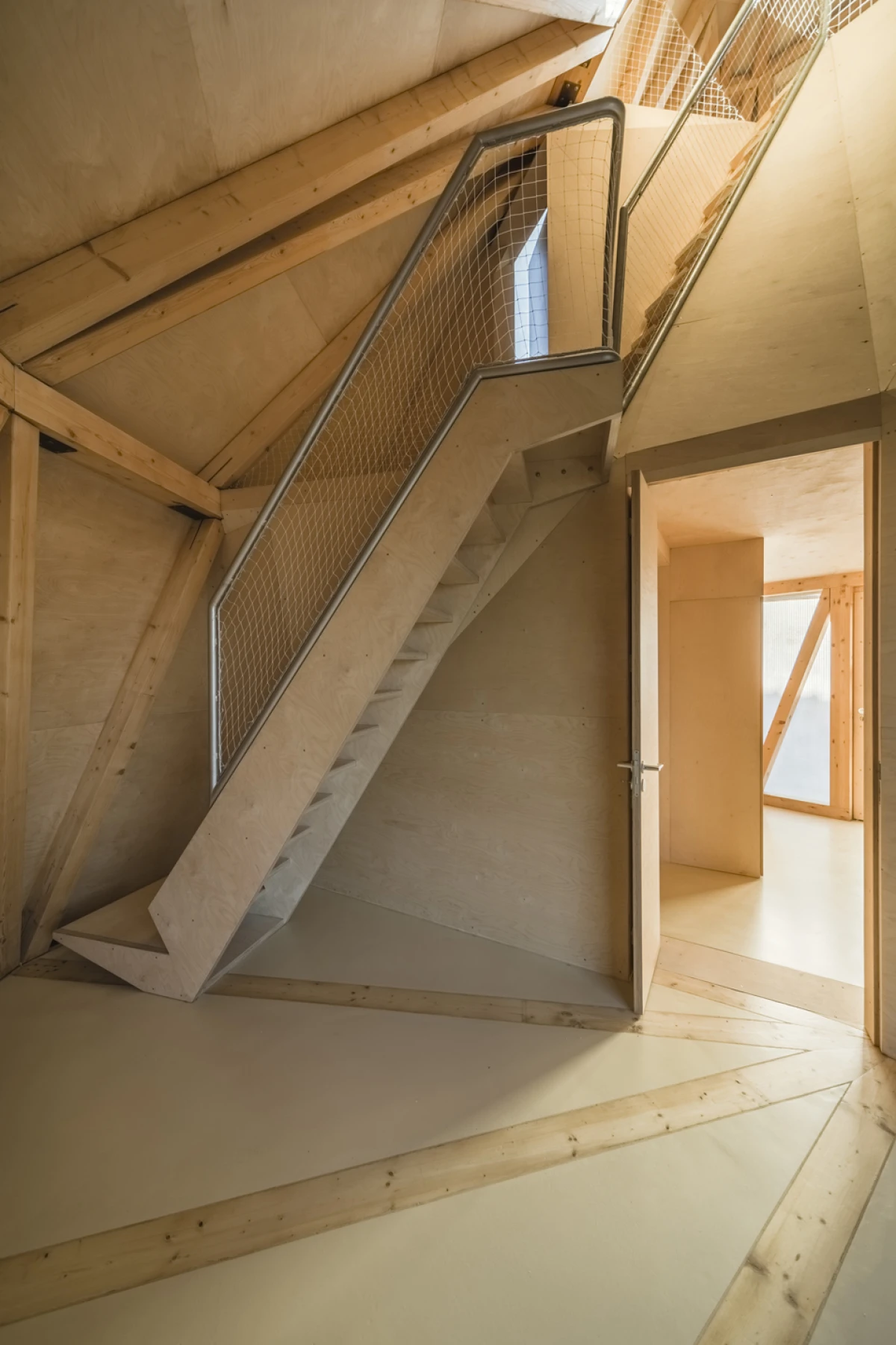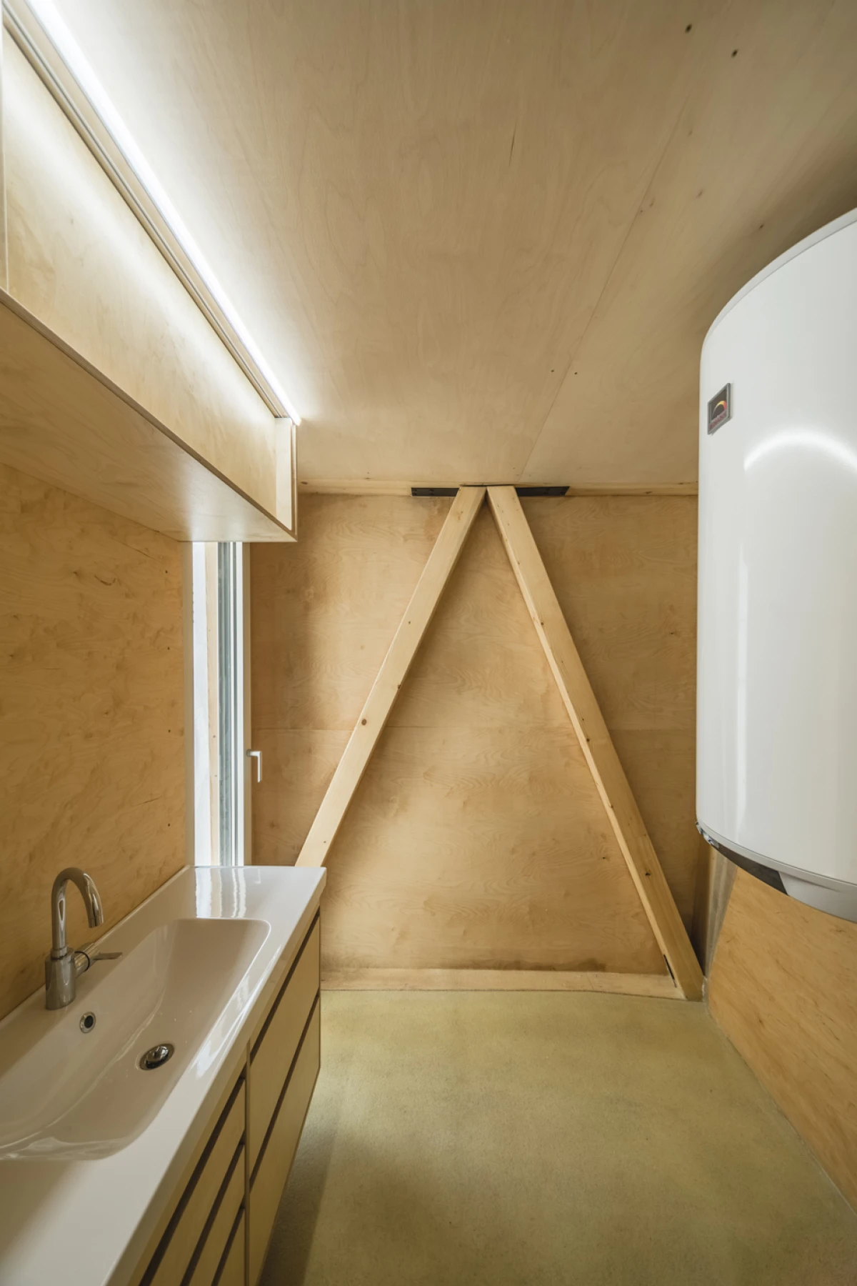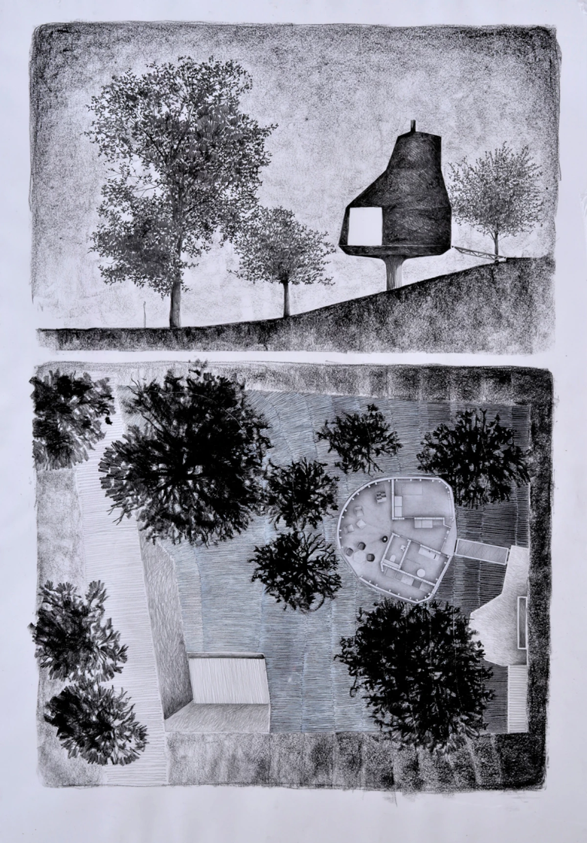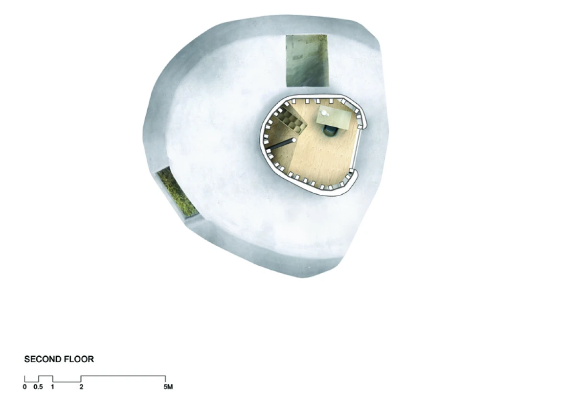 Na severním svažitém pozemku v Praze - Kyjích, odkud je pěkný výhled do údolí, se nacházelo šest vzrostlých stromů. Navržená stavba rodinného domu se snaží svým malým objemem i charakterem mezi tyto stromy začlenit. Ve zkratce by se tedy dal koncept označit jako „dům v sadu“. Kromě vlivu zahrady měla výrazný podíl na výsledný tvar a dispoziční řešení také orientace ke světovým stranám a svažitost pozemku. Velké okno z obývacího pokoje pokrývá nejlepší severní pohled do údolí. Díky vrchnímu světlíku získává obývací pokoj, situovaný severně, také jižní osvětlení. Další pokoje jsou orientovány na jih, což je dětský pokoj v přízemí na východ je otočená ložnice rodičů ve druhém patře, která má i vlastní koupelnu a šatnu. Prostor obývacího pokoje přesahuje přes všechna patra a ukazuje celý dům i zevnitř. Půdorys stavby vychází z kruhu, jenž na jižní straně přechází do podoby dvou čtverců. V nich jsou situovány ložnice, kuchyň a sociální zázemí stavby. Dům je navržen jako dřevostavba se železobetonovým založením, které je v prudkém svahu minimalizováno pouze na jedinou betonovou nohu. Vzhledem k obtížným podmínkám by klasické zakládání většího objemu bylo finančně náročnější. Ocelová lávka staticky spolupůsobí a vytváří zavětrování betonové konstrukce. Dřevěná konstrukce se kompletně celá připravovala v softwaru SEMA. Trámky se před realizací přesně vyřezávaly na 3D frézce a na stavbě se konstrukce už jen vyskládala jako stavebnice. Stavba dřevěné konstrukce probíhala během letních prázdnin zhruba dva měsíce. Na trámky se z venkovní strany přišroubovala 18mm březová překližka, která konstrukci zavětrovala. Konstrukce i překližky jsou v interiéru přiznané. Na dřevěnou konstrukci je nastříkaný polyuretan v tloušťce 15 cm, který je zároveň finální pohledovou částí. Nepravidelný tvar stavby je rozložen do rovinných trojúhelníkových ploch, které zajišťují statickou tuhost dřevěné konstrukce, a zároveň umožnily i vložení březových překližkových desek.