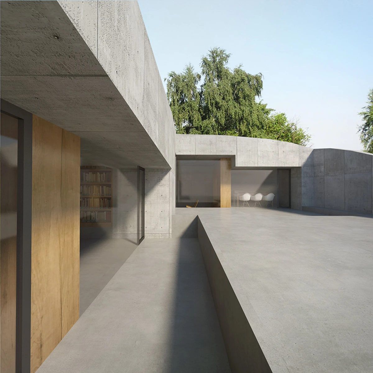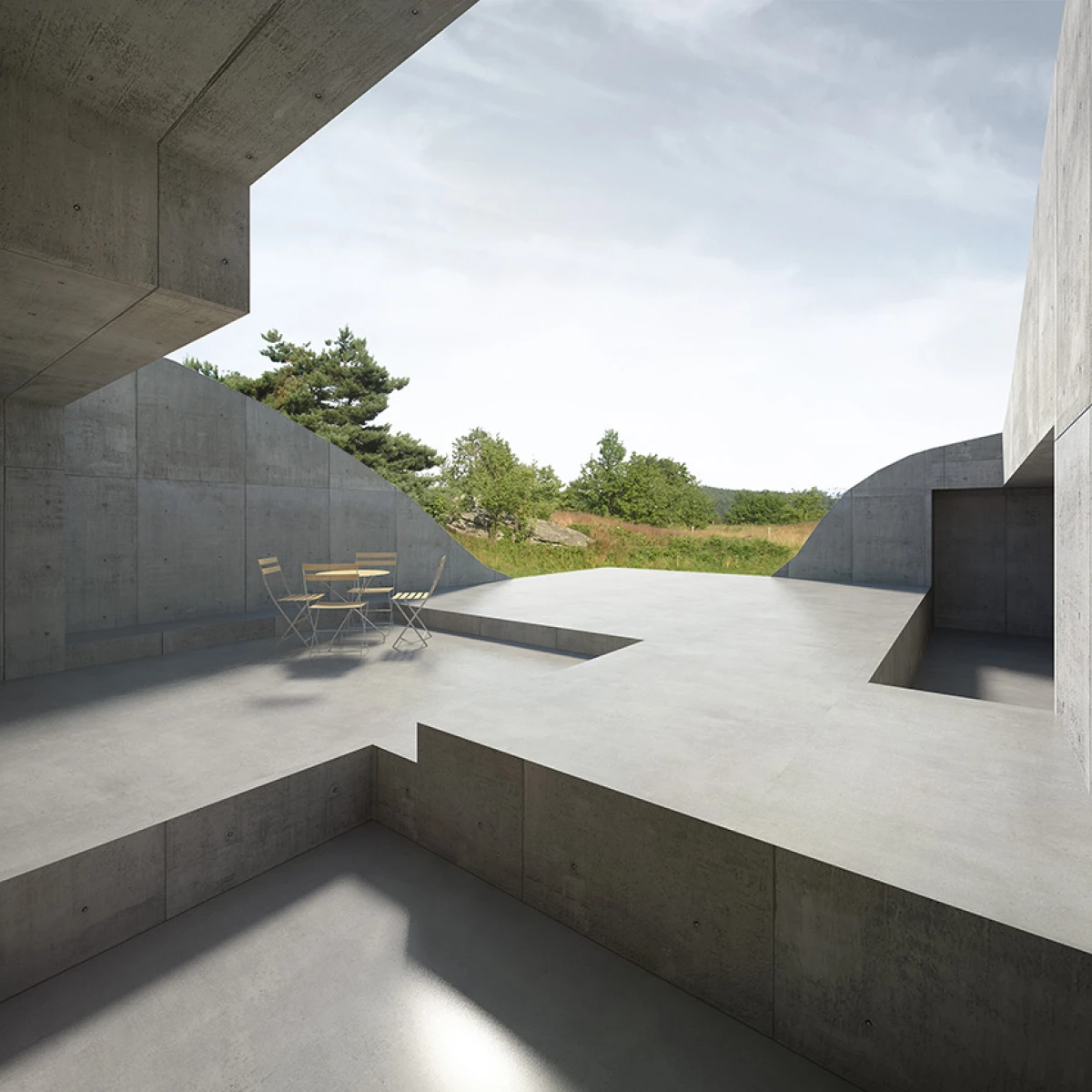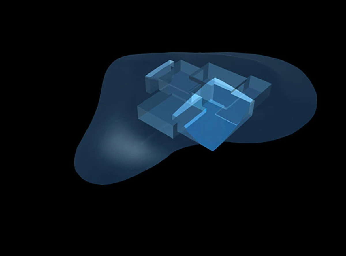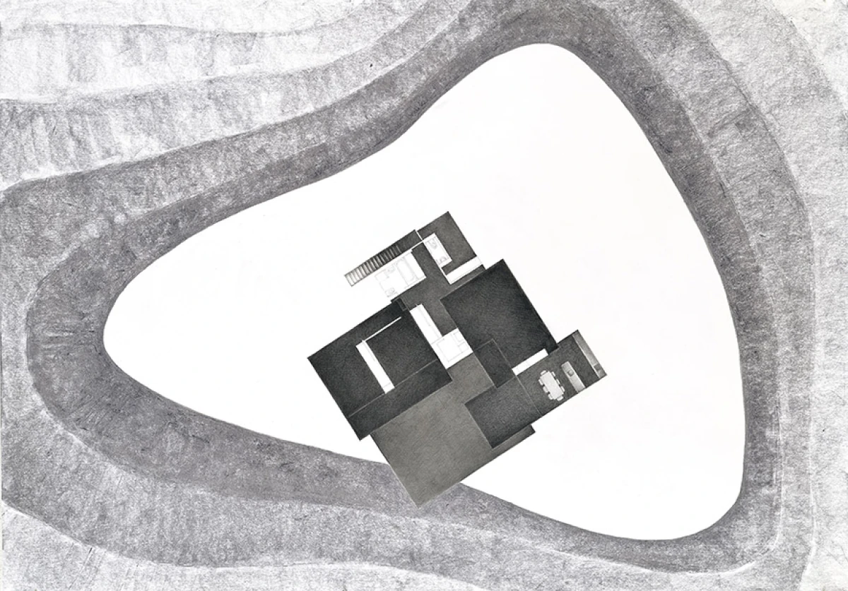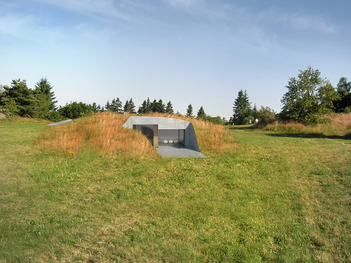 Koncepce rodinného domu ve Stálkově vychází z prostředí České Kanady, charakteristické drsnou krajinou zvlněných luk s nevelkými skalními výstupy. Do prostoru formovaného shluky kamenů a terénních nerovností vsazujeme novou muldu – dům, jako přirozený objekt zpola zakrytý porostem. Vnitřní prostory stavby jsou provedeny řadou různě velkých zářezů, které se vzájemně prolínají. Jejich vzájemné odečtení definuje hranice dutiny v substanci. Povrch stlačený velkou trojrozměrnou raznicí je ztvrdlý v podobě pohledového betonu. Výsledný prostor je dodatečně rozčleněn na jednotlivé místnosti vloženým dřevěným nábytkem nebo sklem. Největší průraz vytváří chráněný prostor atria, který se nejvýrazněji uplatňuje v konfrontaci s okolním přírodním terénem. Studie svým charakterem vychází z některých myšlenek přítomných v návrzích Prostorového domu Fredericka Kieslera a z objektů Eduarda Chillidy, které obohacuje o návaznost na krajinné okolí daného místa.