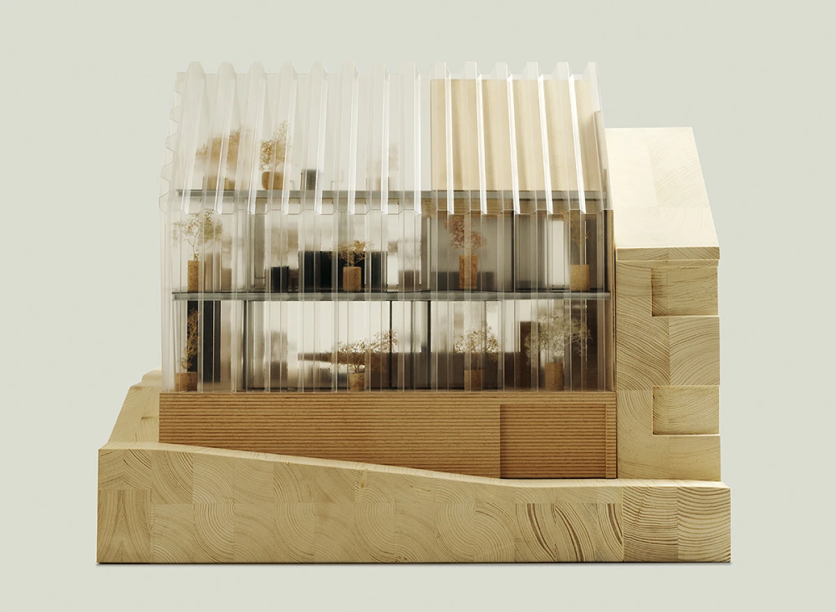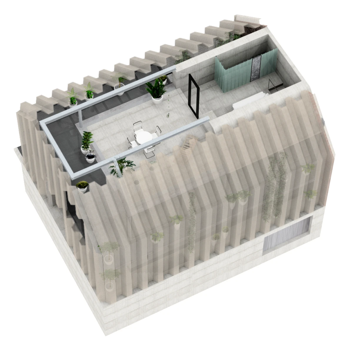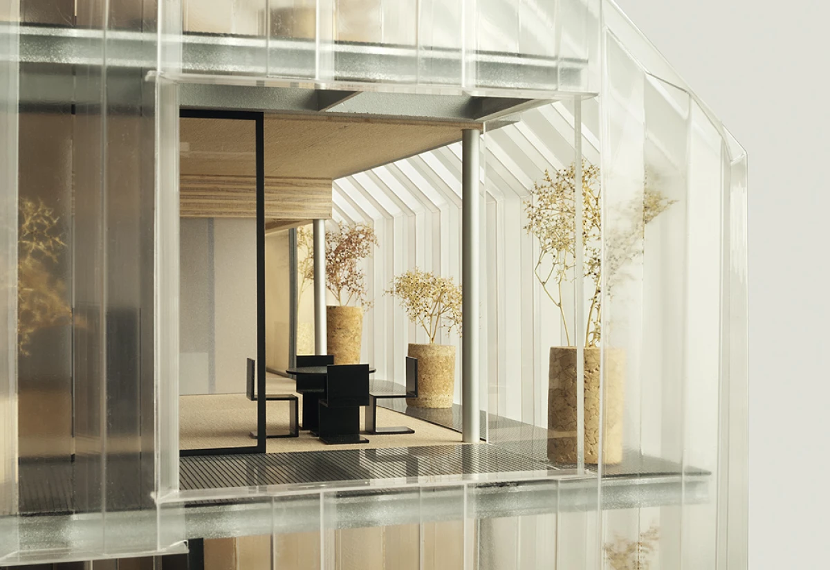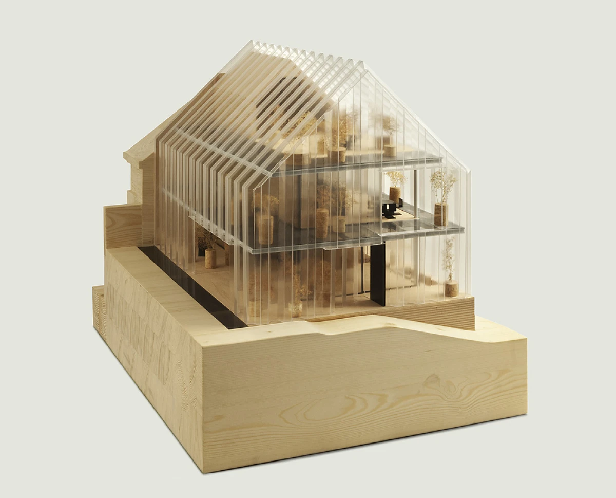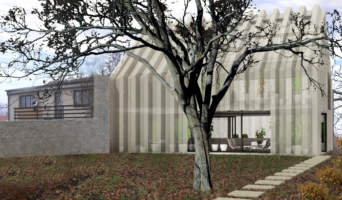 Ne příliš velký pozemek v Dolních Chabrech byl směrem do ulice zastavěn starším domkem, který nevykazoval žádné výjimečné kvality a navíc byl ve velmi špatném technickém stavu. Koncepcí celého návrhu bylo proto uvolnění pozemku pro novostavbu s větší zahradou. Architektonický návrh nové budovy vychází zhruba z objemu původní stavby se sedlovou střechou. Novostavba tak navazuje na vesnický charakter Dolních Chaber a přejímá archetypální tvar rodinných domů, které se nachází v jeho bezprostředním okolí. Koncepce stavby vychází ze záliby klientky, jejímž přáním bylo obklopit se maximálně rostlinami. Vsazením menšího objektu do hmoty novostavby tak vzniká meziprostor, který slouží jako zimní zahrada. Obytný prostor lze se zimní zahradou úplně propojit posuvnými stěnami a vytvořit tak dům – zahradu. Obvodové stěny jsou díky tomu navrženy jako průsvitné – propouštějící světlo pro dobré klima rostlin i rodinného domu. Na vnější plášť byly vyvinuty kompozitové průsvitné desky, zajišťující kromě nosné funkce, také tepelně-izolační vlastnosti stavby. Zalamovaná fasáda, vycházející svým tvarem z ocelových štětovnic, se pro účel stavby vyvíjela zhruba rok a kromě statických testů splnila i tepelně-izolační vlastnosti a světelnou pohodu pro pěstování rostlin. Proto, aby se meziprostor, kde se nacházejí rostliny, nepřehříval, jsou u paty a na vrcholu domu navrženy větrací klapky, které se při vyšší teplotě samy otevřou a umožní přirozené větrání stavby jako v případě některých skleníků.