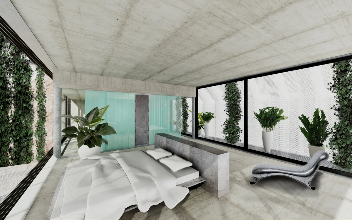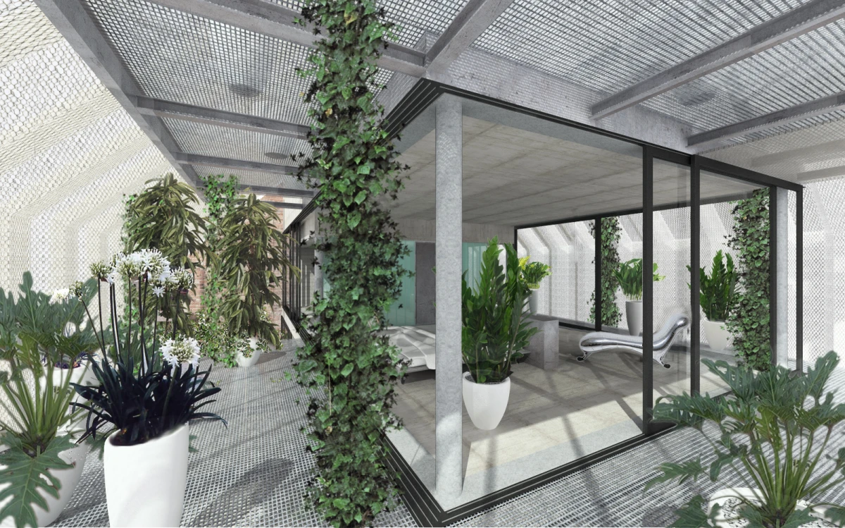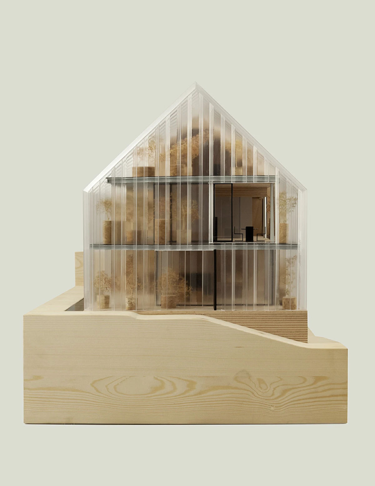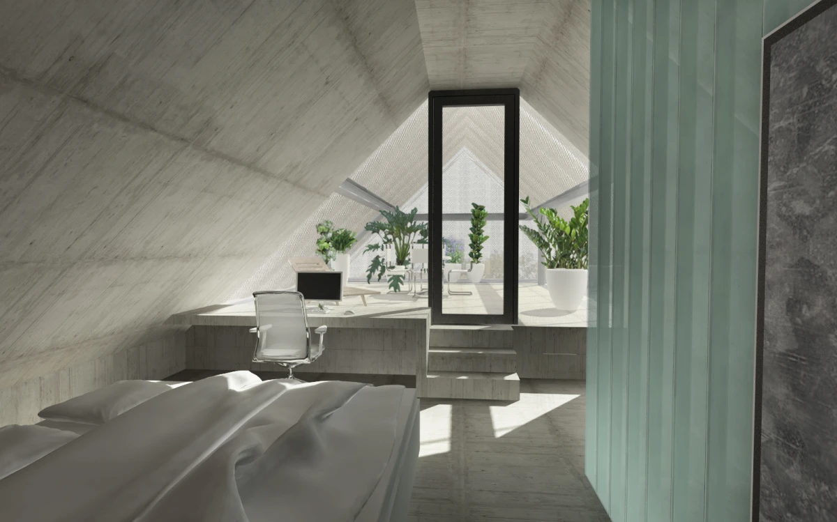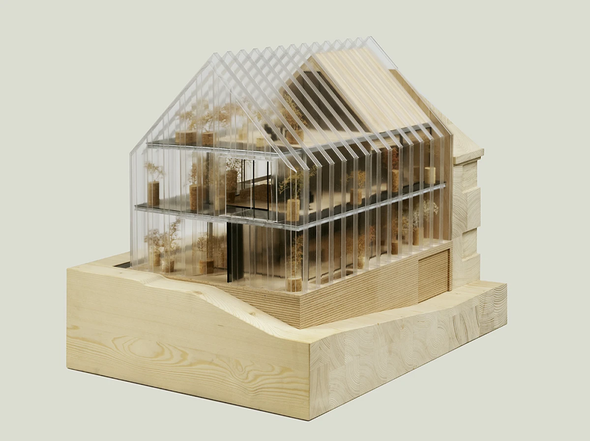 Ne příliš velký pozemek v Dolních Chabrech byl směrem do ulice zastavěn starším domkem, který nevykazoval žádné výjimečné kvality a navíc byl ve velmi špatném technickém stavu. Koncepcí celého návrhu bylo proto uvolnění pozemku pro novostavbu s větší zahradou. Architektonický návrh nové budovy vychází zhruba z objemu původní stavby se sedlovou střechou. Novostavba tak navazuje na vesnický charakter Dolních Chaber a přejímá archetypální tvar rodinných domů, které se nachází v jeho bezprostředním okolí. Koncepce stavby vychází ze záliby klientky, jejímž přáním bylo obklopit se maximálně rostlinami. Vsazením menšího objektu do hmoty novostavby tak vzniká meziprostor, který slouží jako zimní zahrada. Obytný prostor lze se zimní zahradou úplně propojit posuvnými stěnami a vytvořit tak dům – zahradu. Obvodové stěny jsou díky tomu navrženy jako průsvitné – propouštějící světlo pro dobré klima rostlin i rodinného domu. Na vnější plášť byly vyvinuty kompozitové průsvitné desky, zajišťující kromě nosné funkce, také tepelně-izolační vlastnosti stavby. Zalamovaná fasáda, vycházející svým tvarem z ocelových štětovnic, se pro účel stavby vyvíjela zhruba rok a kromě statických testů splnila i tepelně-izolační vlastnosti a světelnou pohodu pro pěstování rostlin. Proto, aby se meziprostor, kde se nacházejí rostliny, nepřehříval, jsou u paty a na vrcholu domu navrženy větrací klapky, které se při vyšší teplotě samy otevřou a umožní přirozené větrání stavby jako v případě některých skleníků.