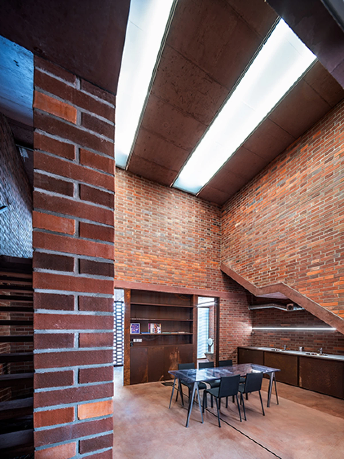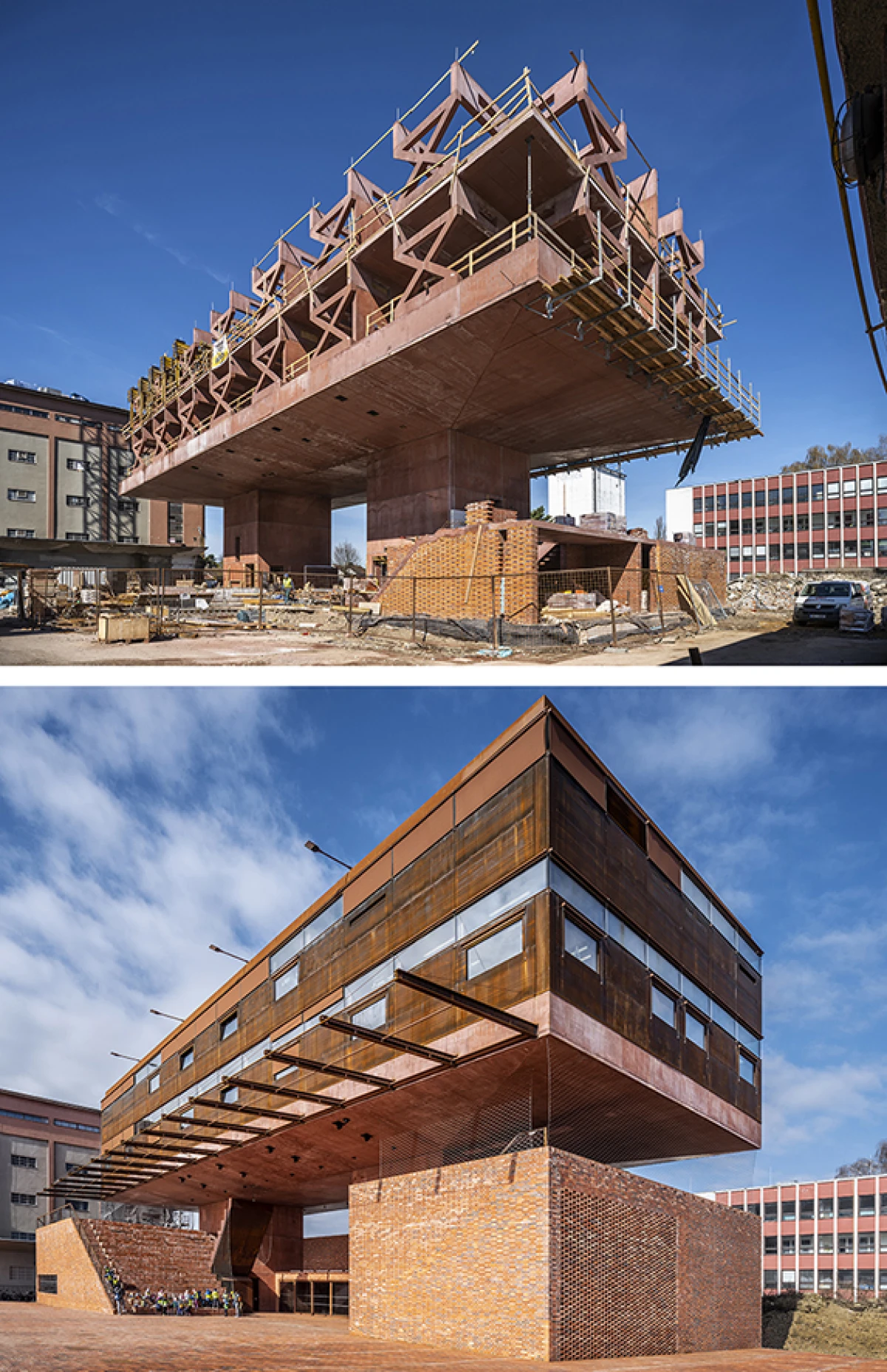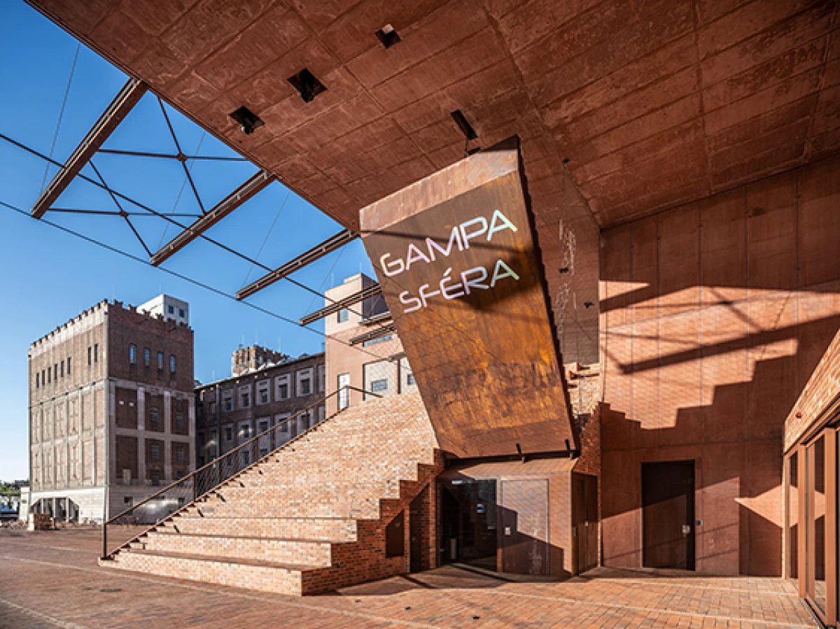 Novostavba GAMPY a Sféry uzavírá ze severní strany navrhovaný blok areálu bývalých Winternitzových automatických mlýnů v Pardubicích. Galerie města Pardubic – GAMPA – se nachází v parteru a nad ní levituje objekt Centrálních polytechnických dílen – Sféra. Mezi oběma jsme ponechali mezeru s průhledem do okolí. Cihelný objekt galerie s veřejně přístupnou střechou navazuje na veřejný prostor areálu. Je zde umístěn amfiteátr pro 250 osob. Venkovní scéna je zakryta vykonzolovanou částí hmoty dílen a je možné ji úplně zakrýt výsuvnou roletou. Zvenku se vstupuje do foyeru s recepcí, šatnami a toaletami, dále navazuje galerie obíhající celý obvod řešeného území, navržená přes dvě patra. Je rozdělena do několika místností, které lze uzavírat posuvnými a harmonikovými dveřmi. Výstavní sály mají horní přirozené osvětlení. Kanceláře ve druhém patře jsou přístupné po schodišti, v opačné části řešeného území je rezidenční ateliér pro hostující umělce. Sféra se nachází nad galerií a je přístupna dvěma schodišti, která vytvářejí zároveň i statickou podporu objektu. Dílny pro žáky ZŠ a SŠ nabízejí učebny a laboratoře k výuce technických a přírodovědných oborů. Do haly ve čtvrtém NP s recepcí a šatnami se dostaneme hlavním vstupem v přízemí. V každém ze dvou pater najdeme po stranách dvě učebny, kabinet a toalety. Ve středu objektu je dvoupatrový prostor s centrálně umístěnou koulí, na niž lze promítat a simulovat přírodní jevy. Spodní patro dílen má přirozené osvětlení okny, laboratoře v nejvyšším patře horní osvětlení střešními světlíky krytými pyramidovým stíněním. S pedagogy a studenty UMPRUM jsme navrhli výtvarně pojednané niky pro jednotlivé dílny. Naší snahou bylo pravdivé vyjádření konstrukce i použitých materiálů. Spodní část galerie je zděná, bez omítky, a odkazuje na památkově chráněný objekt. „Nahá“ zeď se nepotřebuje zahalovat, ale vyžaduje pečlivé řemeslné provedení, stejně jako další konstrukční prvky jako stropy, stěny i podlahy. Všechny materiály jsme barevně ladili k cihelnému zdivu. Konstrukce dílen je založena na nosných betonových žebrech v rastru 3 × 3 metry, podepřených při fasádě X-nosníky. Devítimetrové rozpony překlenují metrové nosníky s otvory, jež umožňují instalovat rozvody přiznané v interiéru. Zvenku jsou lehké panely se zateplením kryté cortenovým plechem.