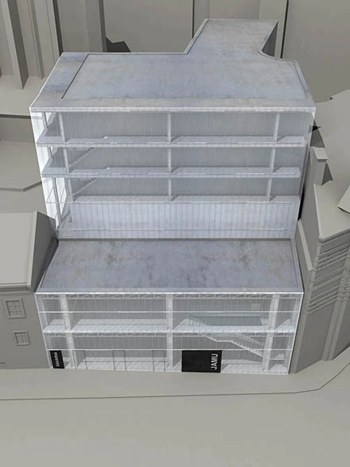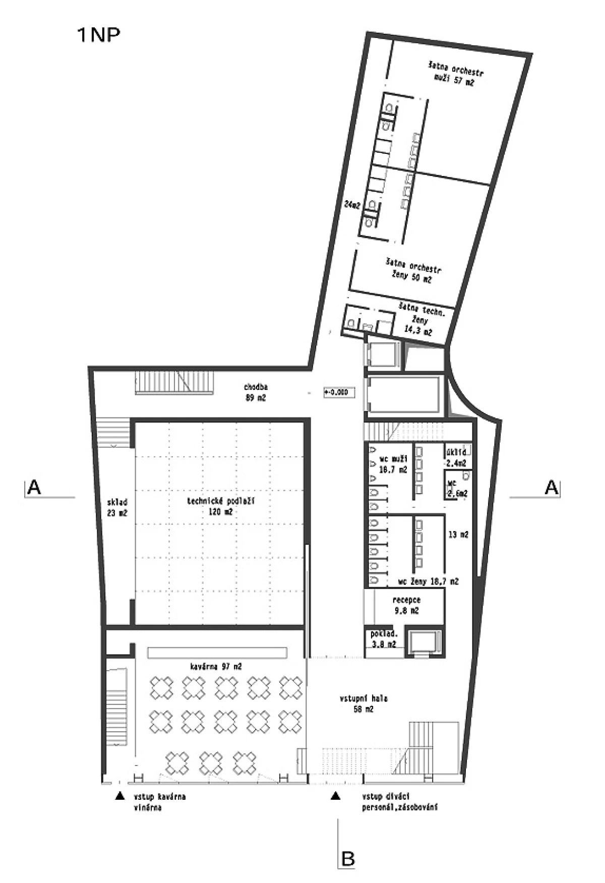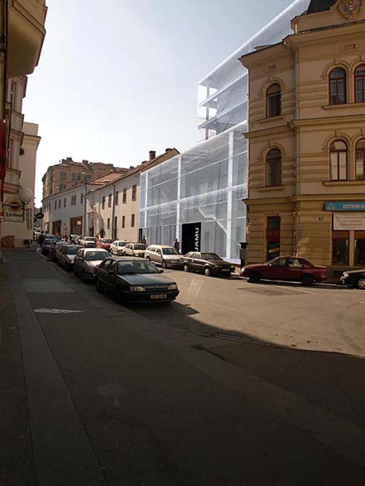 Stavba díky experimentálnímu a školnímu provozu nemusí působit majestátním dojmem, který je charakteristický spíše pro městská divadla, ale může být především svobodným uměleckým prostředím. Tyto úvahy směřovaly náš návrh k inspiraci dílnou-továrnou „na výrobu umění“s méně „škrobenou“ a okázalou divadelní atmosférou. Rozvody a instalace jsou po vzoru průmyslových hal přiznány a vedeny účelně po povrchu. Stavba je zabalena do průsvitného obalu, který poodkrývá její útroby. Naším záměrem bylo docílit zajímavé atmosféry objektu laboratoře JAMU za použití levných a neokázalých prostředků.