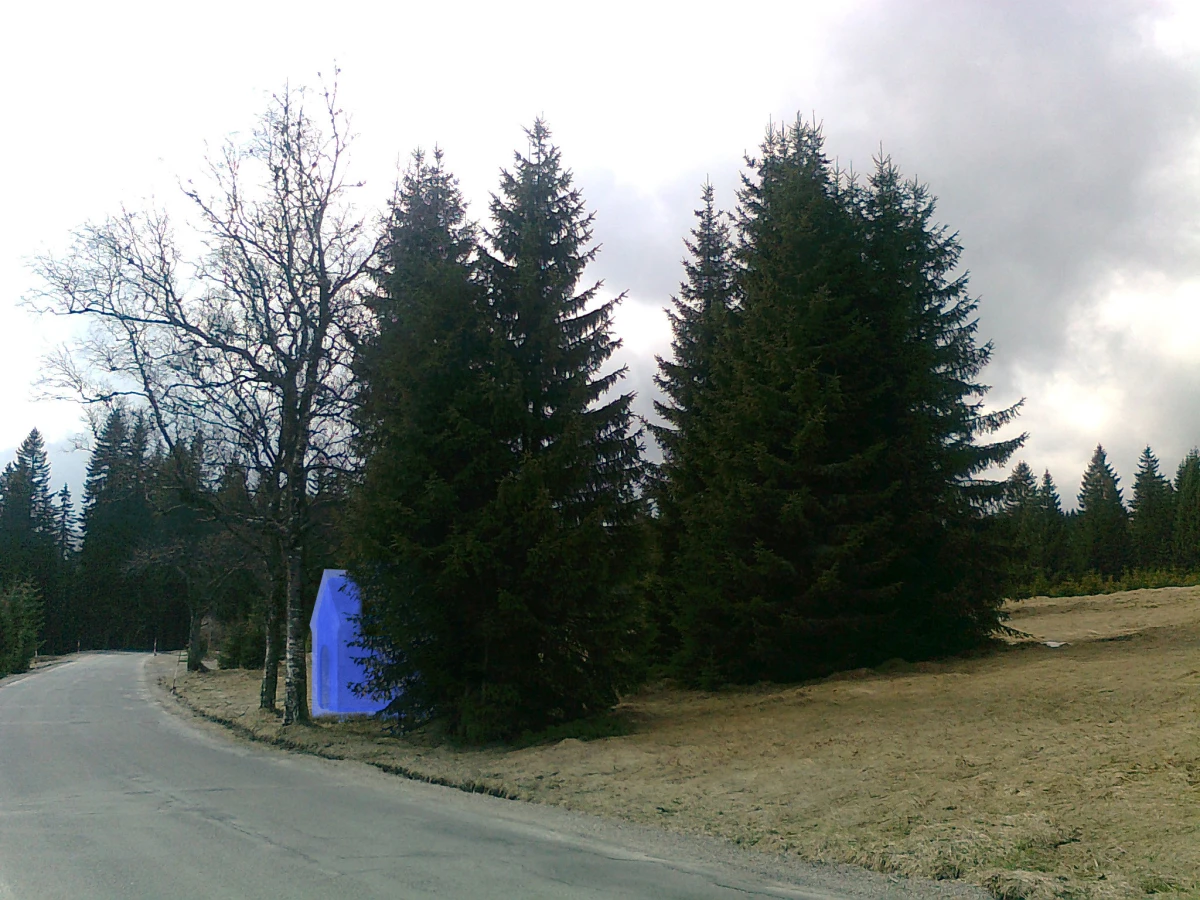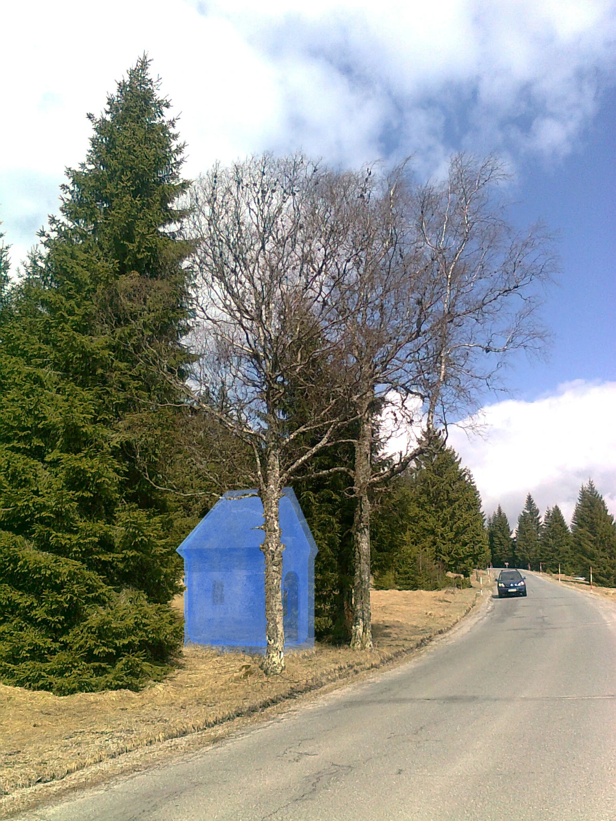 Zhruba v polovině cesty mezi Modravou a Filipovou Hutí se nacházela kaplička, která ale bohužel měla stejný osud jako řada těchto drobných sakrálních staveb na Šumavě. Celkovým motivem je snaha navrátit na dané místo novou kapli o podobné velikosti. Protože se do současné doby nedochovala kresba ani fotografie přesného vzhledu původní kaple, není možné se pokoušet o repliku nebo rekonstrukci někdejšího stavu. Návrh proto počítá se soudobým ztvárněním kaple. Pro Šumavu byl celkem typický velmi lapidární tvar se zaoblenou oltářní stěnou. Lze předpokládat, že eventuelně tento typ kaple mohl stát právě i na tomto místě. Navržený tvar se přesně inspiruje geometrií jakési archetypální kaple, ale díky zvolenému materiálu je jasně zřejmé, že se jedná o ryze soudobou stavbu. Jde tedy v jistém smyslu o dialog mezi tradicí a současností. Zvoleným materiálem je průsvitná pryskyřice se směsí drceného skla v lehce modré barvě. Barevné tónování stěn bude vytvářet neopakovatelnou světelnou atmosféru uvnitř kaple. Tak jako měla tradiční sakrální stavba malý oltář s jednoduchou výzdobou, tak i zde se počítá s umístěním bronzové sochy na čelní zaoblené stěně. Způsob stavby kaple bude vyžadovat značné úsilí při realizaci, protože se jedná o první aplikaci lité pryskyřice do bednění.