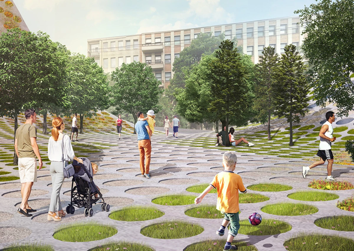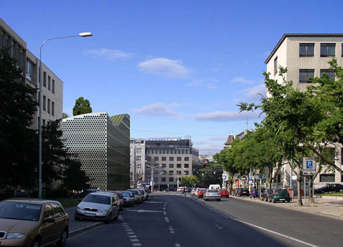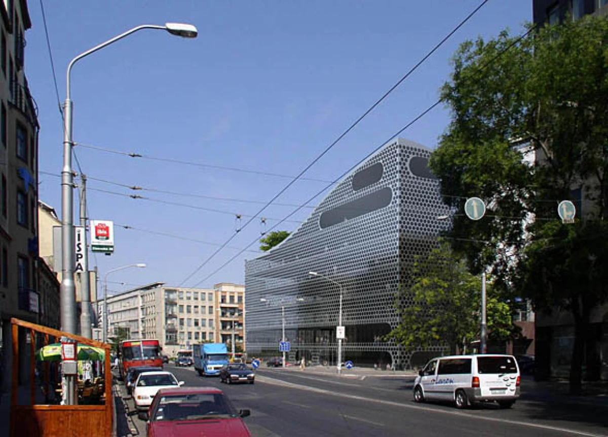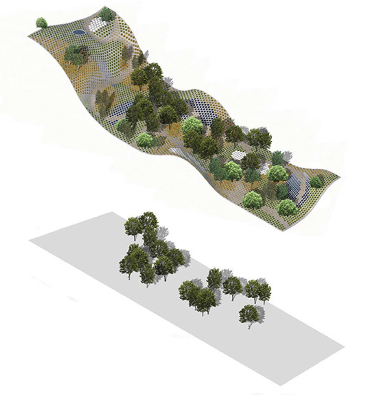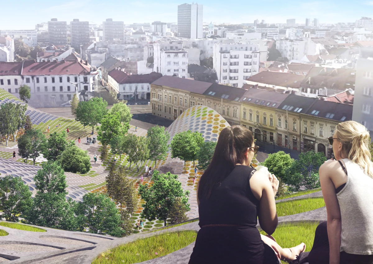 Kollárovo náměstí, tak jak ho známe dnes je především parkem. Zastavění části parku solitérní stavbou je podle našeho názoru možné ovšem za předpokladu, že nová budova bude veřejnou dominantou (radnice, kostel), jejíž význam by odpovídal pozici v srdci náměstí. Polyfunkční budova s převahou nájemních kancelářských ploch nemá význam prvního domu na náměstí, a proto by na sebe neměla strhávat nadměrnou pozornost. Z uvedených důvodů jsme zvolili koncept skloubení nové budovy se stávající funkcí prostoru. Prvořadou úlohu v tomto vztahu hraje právě park, který nově tvarujeme do výrazně zvlněné krajiny. Povrch parku je rozčleněn rastrem kruhů, které prorůstají různými povrchy a materiály (tráva, zpevněný povrch, sklo, písek). Tyto materiály reagují na různé funkce parku (relaxační plochy, cesty, prosvětlení objektů pod parkem, dětské hřiště, restaurace). Snažili jsme se o výraz umělé krajiny, jakýsi organizovaný displej, který určuje přesnou polohu pro jmenované funkce. Park je tedy v poloze ústředního prvku náměstí a tvarováním terénu je doslova odkloněn od rušných tříd v jeho bezprostředním okolí. Koncept zeleně se přitom v maximální možné míře snaží ponechat stávající stromy v místech, které zůstávají na původní niveletě terénu. Obě části, jak budovy samotné, tak i vrchní koberec parku vytvářejí celistvý objekt vyplňující střed Kollárova náměstí při zachování jeho snadné pěší průchodnosti. Parter polyfunkční budovy je věnován obchodům a službám. Nejvyšší patra využívá restaurace s možností venkovního posezení na střešní terase. Zbytek ploch tvoří pronajímatelné kanceláře. Vzhledem k tomu, že zástavba ve všech částech pozemku je koncipována jako jeden celek, mají jednotný charakter i fasády, které svou abstraktní strukturou podporují dojem „řezu hmotou parku“.