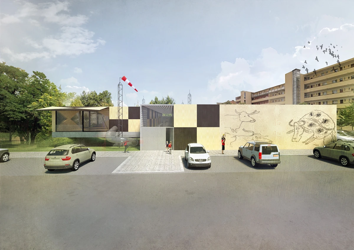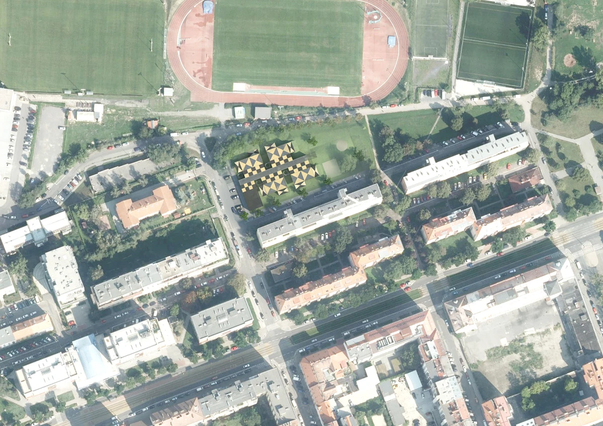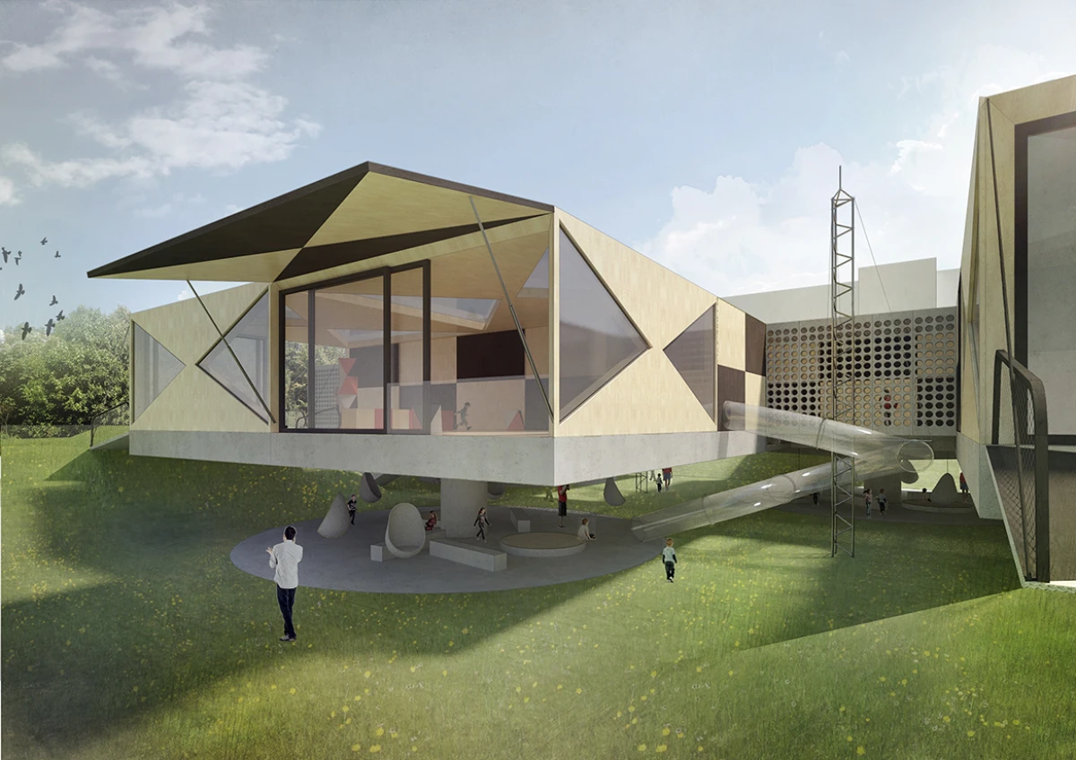 Pro stavbu mateřské školy je vymezeno územním plánem celkem malé území. Ze zahraničních příkladů, kde byl objekt nově budované školky také situován na malý pozemek, známe převážně řešení umístění zahrady na střeše stavby. V našem případě získáme plochu pro potřeby zahrady vyzvednutím větší části stavby o úroveň výš. Tím necháváme krajinu probíhat pod naším objektem. Na základě doporučení inženýrskogeologickým průzkumem, který prokázal velkou mocnost navážky, se v našem návrhu snažíme minimalizovat zakládání celé stavby. Školku jsme proto rozdělili do čtyř samostatných pavilonů, které jsou ve svém středu podepřeny masivní betonovou podpěrou s deskou. Založení uvažujeme na vrtaných pilotách. Z architektonického hlediska jsme si kladli otázku, jaký charakter mateřské školce propůjčit. Naší inspirací se staly obrazy Kamila Lhotáka, především jeho létající papírový draci, atmosféra letišť, kde vidíme jeho vztah k dětskému světu. Dřevěné krabičky jsou jakousi parafrází právě na Lhotákův svět, ale i na svět dětských hraček. Objekt školky pro nás představuje v přeneseném smyslu hračku, která stojí na jedné noze, a může tak být ve své spodní části nosičem houpaček a skluzavek. Celému řešení má také napomoci vstupní průčelí z Kovářské ulice, kde uvažujeme přenést na fasádu vybraný motiv dětské kresby. Provoz školky je situován jen do jednoho patra. Z ulice Kovářské vstupujeme do centrální chodby, na kterou jsou po obou stranách navěšeny pavilony tříd i víceúčelová tělocvična. Chodba umožňuje projít na zadní část zahrady přímo pomocí lávky na terénní val. V chodbě navrhujeme schody a rampu pro bezbariérový vstup. Do zahrady, která je pod pavilonem, mohou děti sjet na skluzavce přímo ze šatny. Kryté prostory zahrady je možné využít i při deštivém počasí. Při dobrém počasí má každá třída také možnost vyjít ven do vrchní zahrady přímo po vyklopeném dílu stěny. Po konstrukční stránce je celá stavba rozdělena do dvou částí. Vrchní část pavilonů je lehká prefabrikovaná dřevostavba, která má z exteriérové strany dřevěný plášť ochráněný laminátem. Spodní část představuje betonovou platformu s centrální betonovou podpěrou a nosníky.