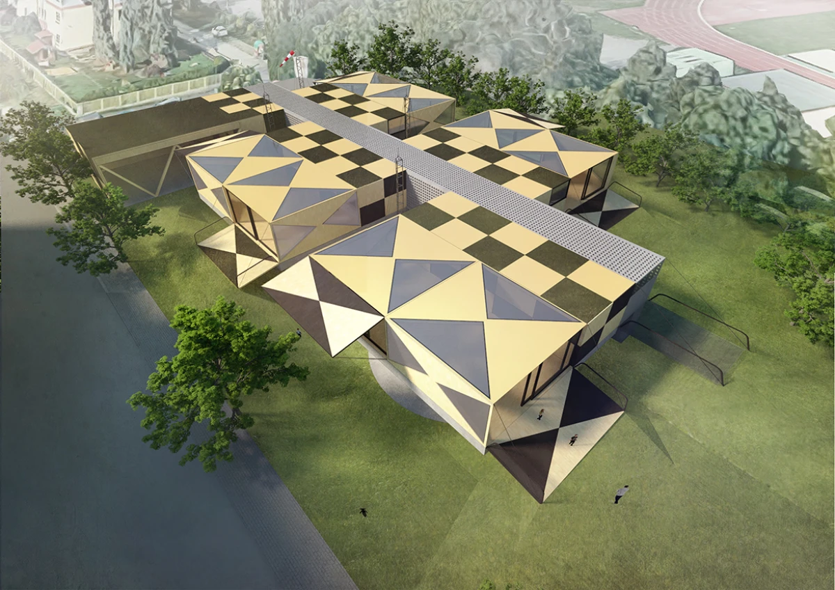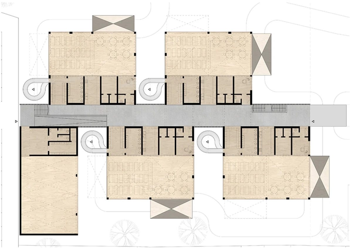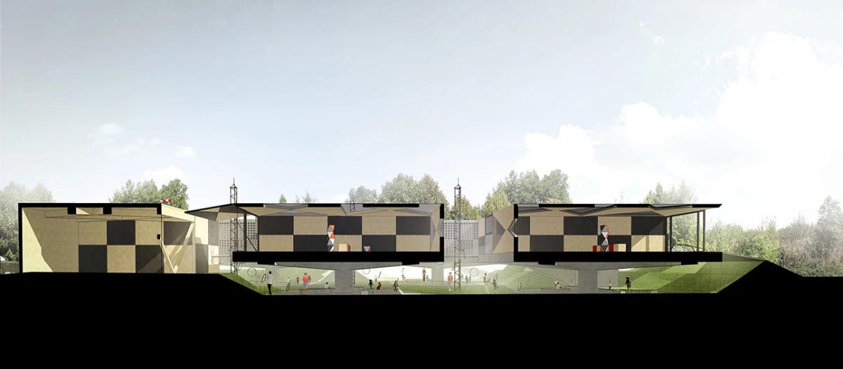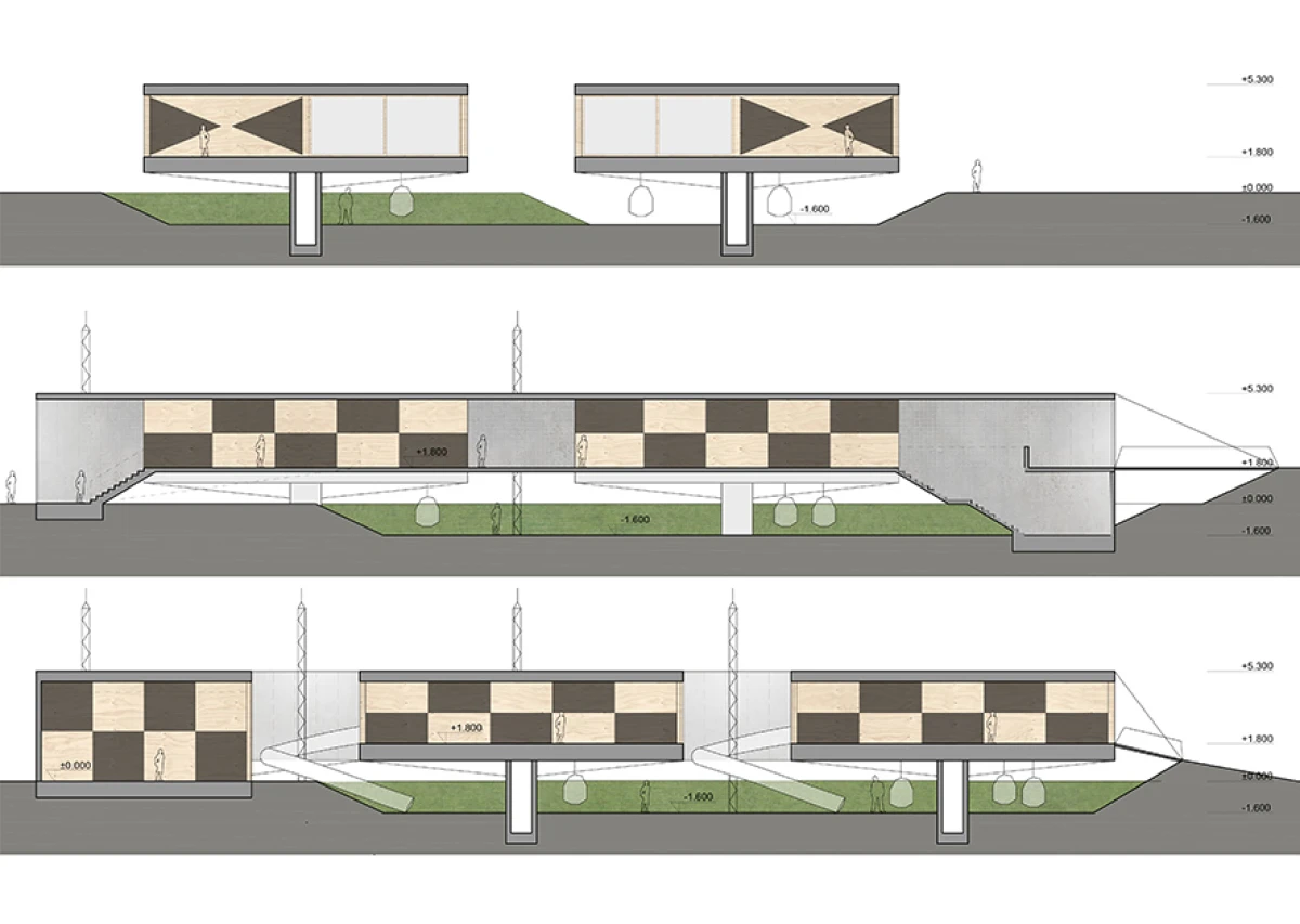 Pro stavbu mateřské školy je vymezeno územním plánem celkem malé území. Ze zahraničních příkladů, kde byl objekt nově budované školky také situován na malý pozemek, známe převážně řešení umístění zahrady na střeše stavby. V našem případě získáme plochu pro potřeby zahrady vyzvednutím větší části stavby o úroveň výš. Tím necháváme krajinu probíhat pod naším objektem. Na základě doporučení inženýrskogeologickým průzkumem, který prokázal velkou mocnost navážky, se v našem návrhu snažíme minimalizovat zakládání celé stavby. Školku jsme proto rozdělili do čtyř samostatných pavilonů, které jsou ve svém středu podepřeny masivní betonovou podpěrou s deskou. Založení uvažujeme na vrtaných pilotách. Z architektonického hlediska jsme si kladli otázku, jaký charakter mateřské školce propůjčit. Naší inspirací se staly obrazy Kamila Lhotáka, především jeho létající papírový draci, atmosféra letišť, kde vidíme jeho vztah k dětskému světu. Dřevěné krabičky jsou jakousi parafrází právě na Lhotákův svět, ale i na svět dětských hraček. Objekt školky pro nás představuje v přeneseném smyslu hračku, která stojí na jedné noze, a může tak být ve své spodní části nosičem houpaček a skluzavek. Celému řešení má také napomoci vstupní průčelí z Kovářské ulice, kde uvažujeme přenést na fasádu vybraný motiv dětské kresby. Provoz školky je situován jen do jednoho patra. Z ulice Kovářské vstupujeme do centrální chodby, na kterou jsou po obou stranách navěšeny pavilony tříd i víceúčelová tělocvična. Chodba umožňuje projít na zadní část zahrady přímo pomocí lávky na terénní val. V chodbě navrhujeme schody a rampu pro bezbariérový vstup. Do zahrady, která je pod pavilonem, mohou děti sjet na skluzavce přímo ze šatny. Kryté prostory zahrady je možné využít i při deštivém počasí. Při dobrém počasí má každá třída také možnost vyjít ven do vrchní zahrady přímo po vyklopeném dílu stěny. Po konstrukční stránce je celá stavba rozdělena do dvou částí. Vrchní část pavilonů je lehká prefabrikovaná dřevostavba, která má z exteriérové strany dřevěný plášť ochráněný laminátem. Spodní část představuje betonovou platformu s centrální betonovou podpěrou a nosníky.