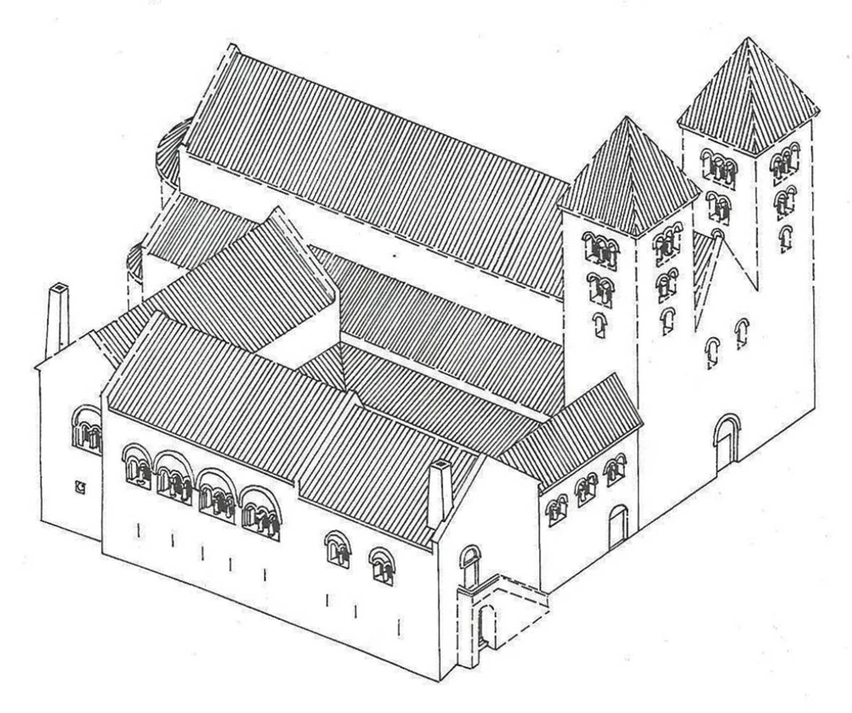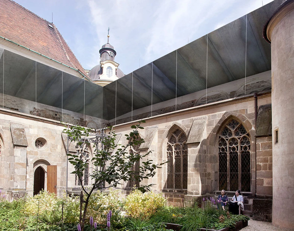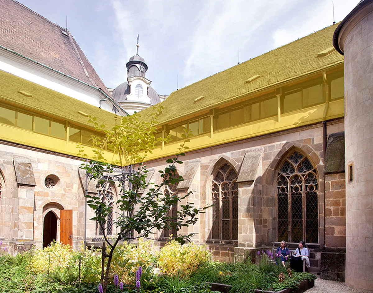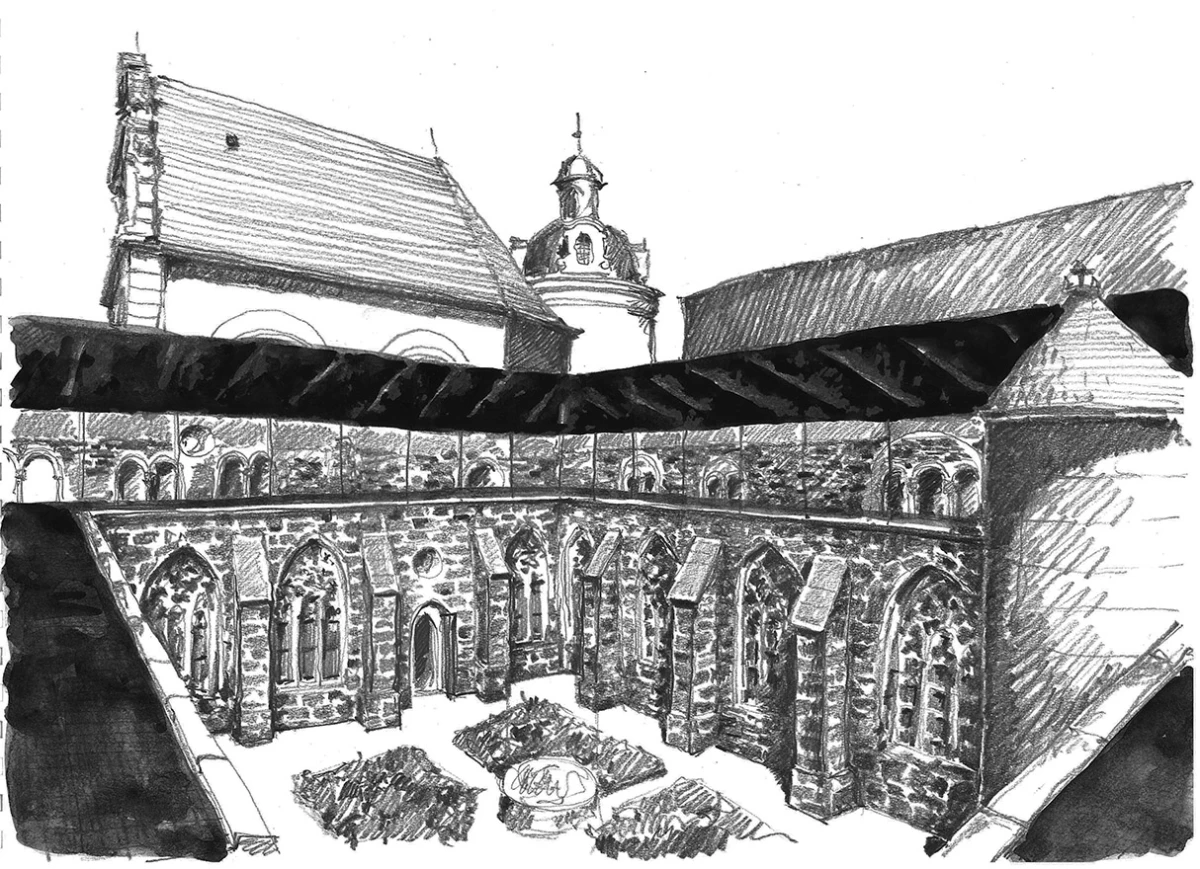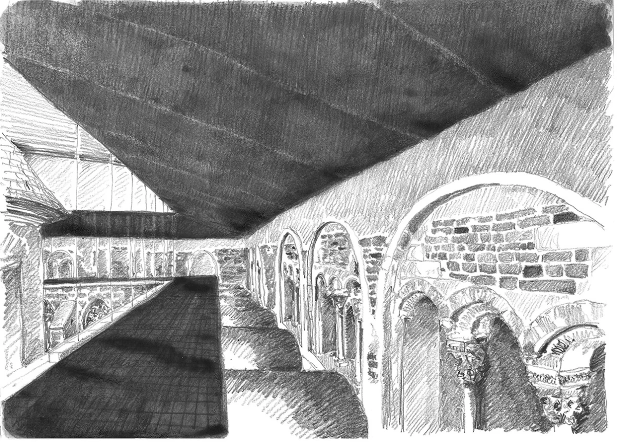 Románský biskupský palác tvoří jeden celek s Arcidiecézním muzeem od roku 2006. Palác se řadí mezi nejvýznamnější vrcholně románské obytné stavby v Evropě. Architektura rezidence neměla v českých zemích 12. století obdoby. Jednalo se o patrovou stavbu obdélníkového půdorysu, kdy se v prvním patře nacházela soukromá rezidence biskupů. Dokladem vyspělosti románského umění jsou dochovaná románská okna. Jedinečný románský areál se však po smrti biskupa Zdíka dlouho neudržel. Objekt vyhořel a následně byla část stavby začleněna do dnešní křížové chodby. Pro veřejnost byl objekt zpřístupněn v 80. letech 20. století. Severní i západní křídlo bylo zastřešeno a vložená pochozí lávka umožnila prohlídku románských oken. Tyto stavební úpravy nebyly provedeny příliš citlivě a odpovídají době, kdy rekonstrukce i atypické detaily nebylo možné dobře řemeslně provést. Naše koncepce počítá s odstraněním střechy a jejím nahrazením pultovou střechou, která se otvírá směrem k ambitu. Tím by bylo možné docílit průhledu na okna bez nutnosti použít sloupky. Ocelové plechy se opírají o horní líc dnešní stěny s románskými okny, kde bude střecha staticky namáhána na tlak. Naopak horní část pultové střechy bude zavěšena a držena ocelovými táhly. Toto řešení umožní návštěvníkům maximálně se soustředit pouze na zeď s románskými okny, přičemž část oken bude možné vidět i z rajského dvora. Převrácením střechy oproti stávajícímu stavu se dostávají do samozřejmé logiky jak románská okna, tak i jiné stavební prvky i otvory, které nemají s románským biskupským palácem nic společného. Dřevěnou lávku nahrazujeme kovovým roštem se zábradlím. Toto transparentní řešení zkvalitní optický kontakt návštěvníka s instalací i s klenbami pod lávkou. Dřevěná okna zaměňujeme za skleněné tabule větší výšky bez rámů