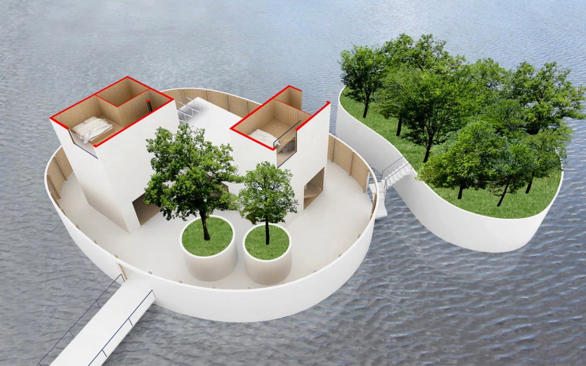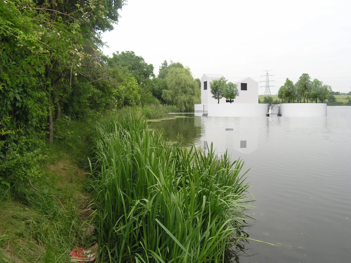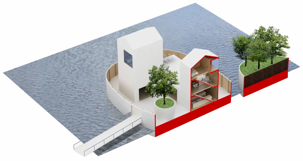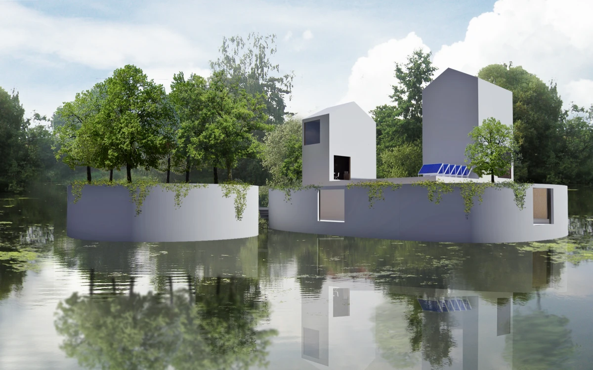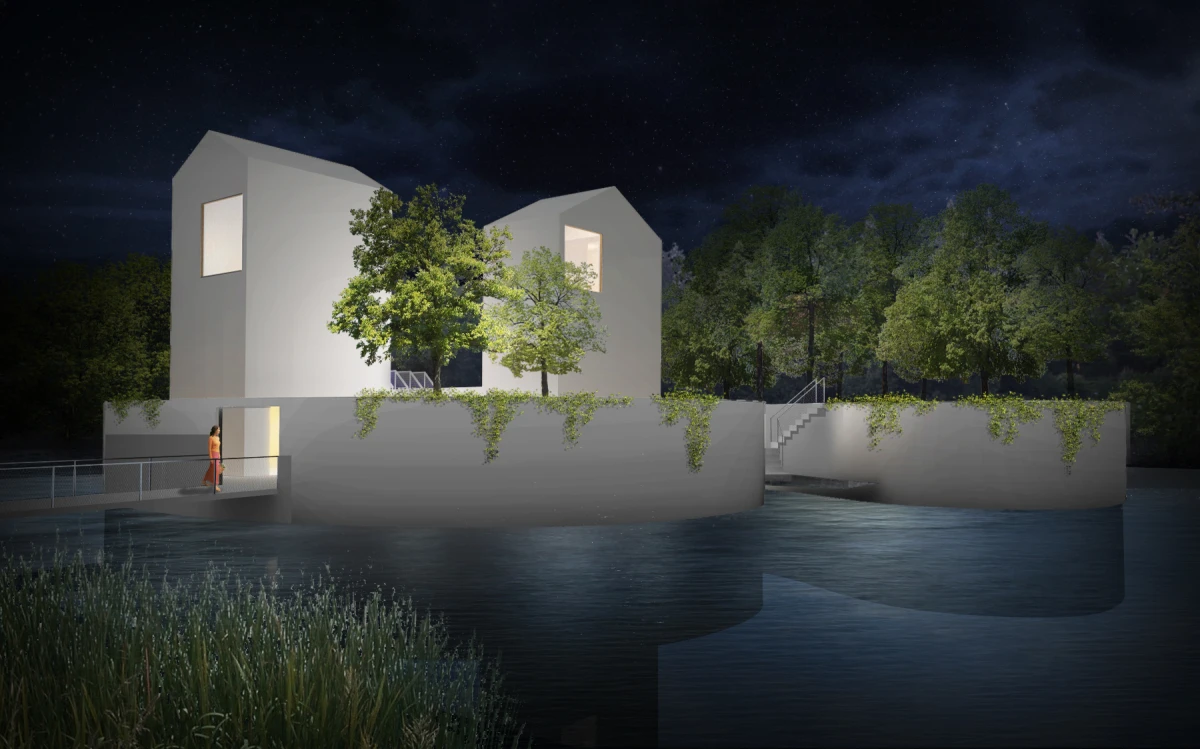 Bydlení na vodě nemá v našem prostředí velkou tradici. Přesto se jedná o jedinečnou příležitost, jak žít v bezprostředním kontaktu s vodním prvkem. Jednou z možností, jak takové bydlení vytvořit, je návrh umělého ostrovu. Inspirace ostrovy znamená formu izolovaných útvarů, které poskytují platformu pro stavbu standardních objektů. Ostrovy jsou záměrně rozděleny do dvou částí. Jedna by se využila pro samotnou stavbu domu, zatímco druhá by měla sloužit jako zahrada. Zastavěný ostrov představuje díky umístění dvou věží za vymezující plot jakousi malou usedlost. Ohrada poskytuje intimitu, ale díky oknům je zde umožněn i výhled na vodní hladinu a okolní krajinu. Oba ostrovy jsou propojeny lávkou. Nepravidelnost ostrovů i lapidární tvary domů se sedlovou střechou vytváří obraz naivních dětských kreseb. Archetypální tvary staveb sice vychází z tradice, ale díky tomu, že nemají klasické detaily jako je např. okap, apod., tak si zachovávají abstraktní podobu. Na vnější straně objektu je jako zateplení použit polyuretanový nástřik. Vnitřní prostory včetně vnitřku stěny ohrady je navržen z vodovzdorné překližky. Dispozičně je celý objekt řešen jako jedna stavba, která má v přízemí umístěny společné obytné místnosti, tedy obývací pokoj společně s jídelnou a kuchyní. Ložnice a pracovna jsou naopak situovány do pater obou věží. Každá ze tří ložnic má i svoje sociální zázemí.