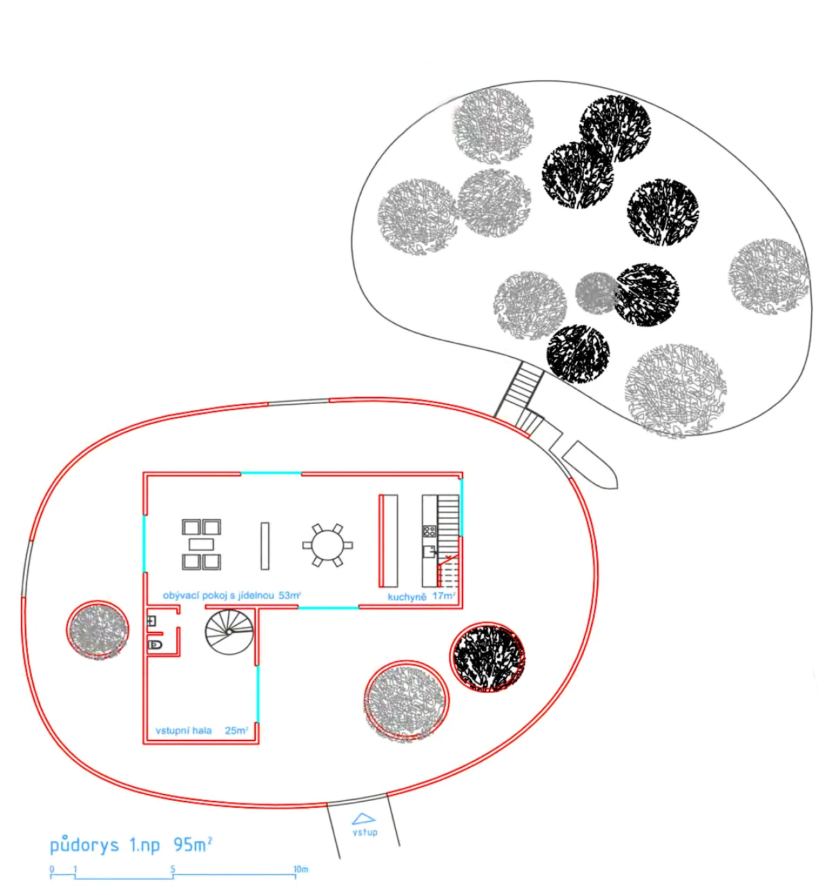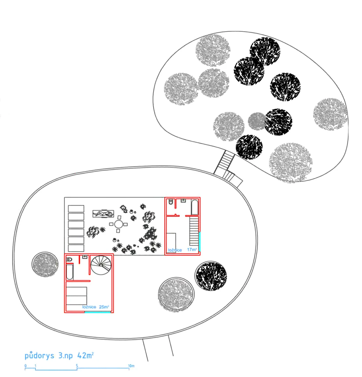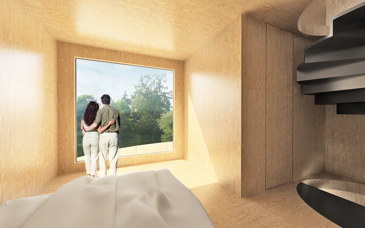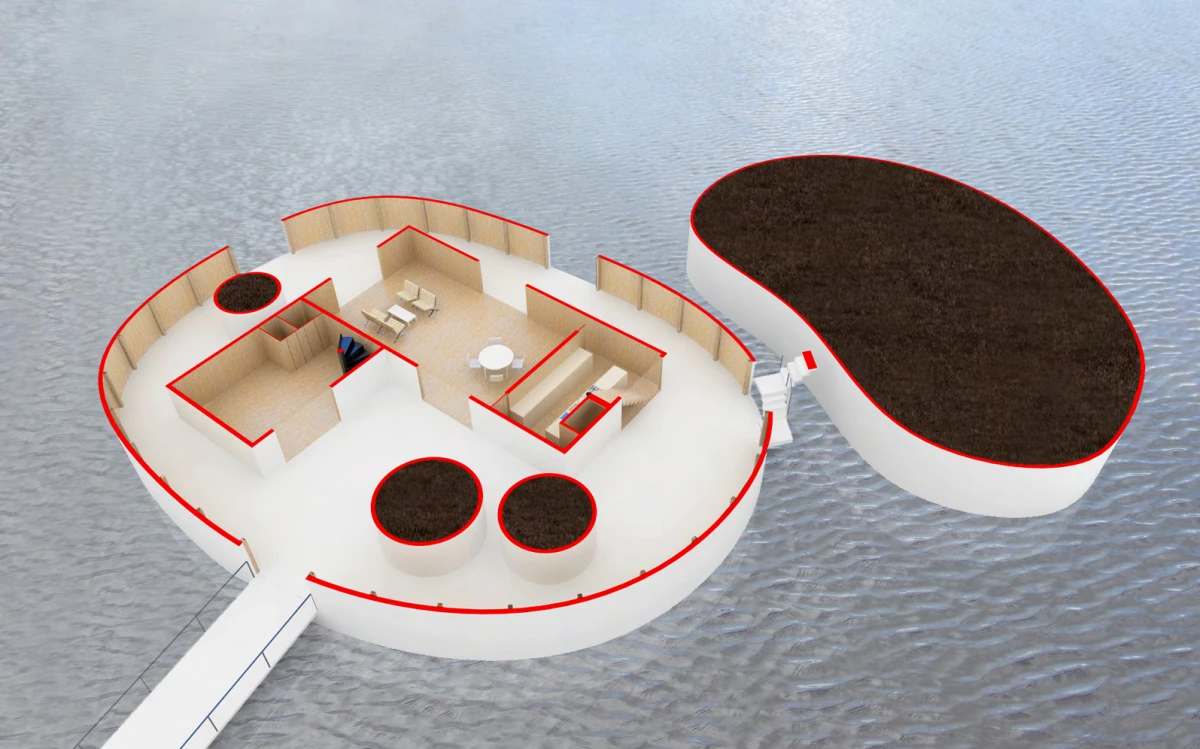 Bydlení na vodě nemá v našem prostředí velkou tradici. Přesto se jedná o jedinečnou příležitost, jak žít v bezprostředním kontaktu s vodním prvkem. Jednou z možností, jak takové bydlení vytvořit, je návrh umělého ostrovu. Inspirace ostrovy znamená formu izolovaných útvarů, které poskytují platformu pro stavbu standardních objektů. Ostrovy jsou záměrně rozděleny do dvou částí. Jedna by se využila pro samotnou stavbu domu, zatímco druhá by měla sloužit jako zahrada. Zastavěný ostrov představuje díky umístění dvou věží za vymezující plot jakousi malou usedlost. Ohrada poskytuje intimitu, ale díky oknům je zde umožněn i výhled na vodní hladinu a okolní krajinu. Oba ostrovy jsou propojeny lávkou. Nepravidelnost ostrovů i lapidární tvary domů se sedlovou střechou vytváří obraz naivních dětských kreseb. Archetypální tvary staveb sice vychází z tradice, ale díky tomu, že nemají klasické detaily jako je např. okap, apod., tak si zachovávají abstraktní podobu. Na vnější straně objektu je jako zateplení použit polyuretanový nástřik. Vnitřní prostory včetně vnitřku stěny ohrady je navržen z vodovzdorné překližky. Dispozičně je celý objekt řešen jako jedna stavba, která má v přízemí umístěny společné obytné místnosti, tedy obývací pokoj společně s jídelnou a kuchyní. Ložnice a pracovna jsou naopak situovány do pater obou věží. Každá ze tří ložnic má i svoje sociální zázemí.