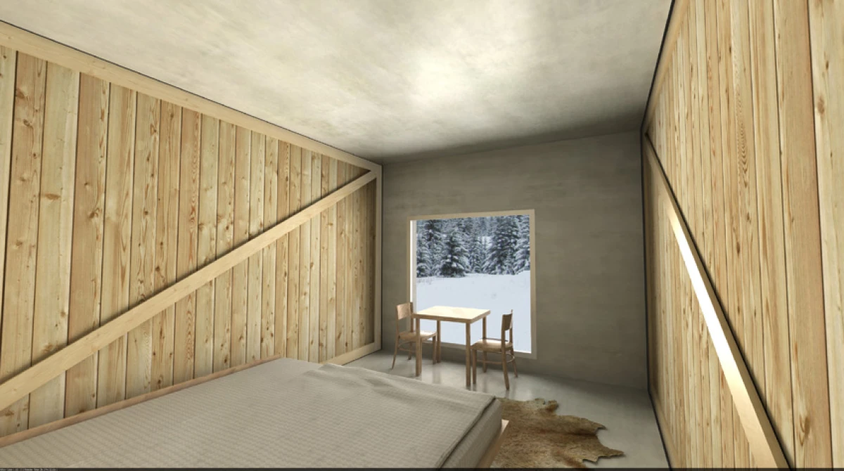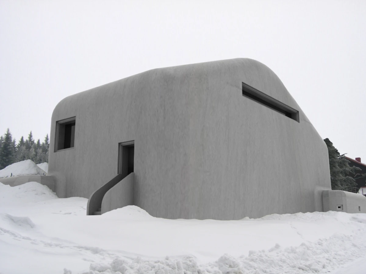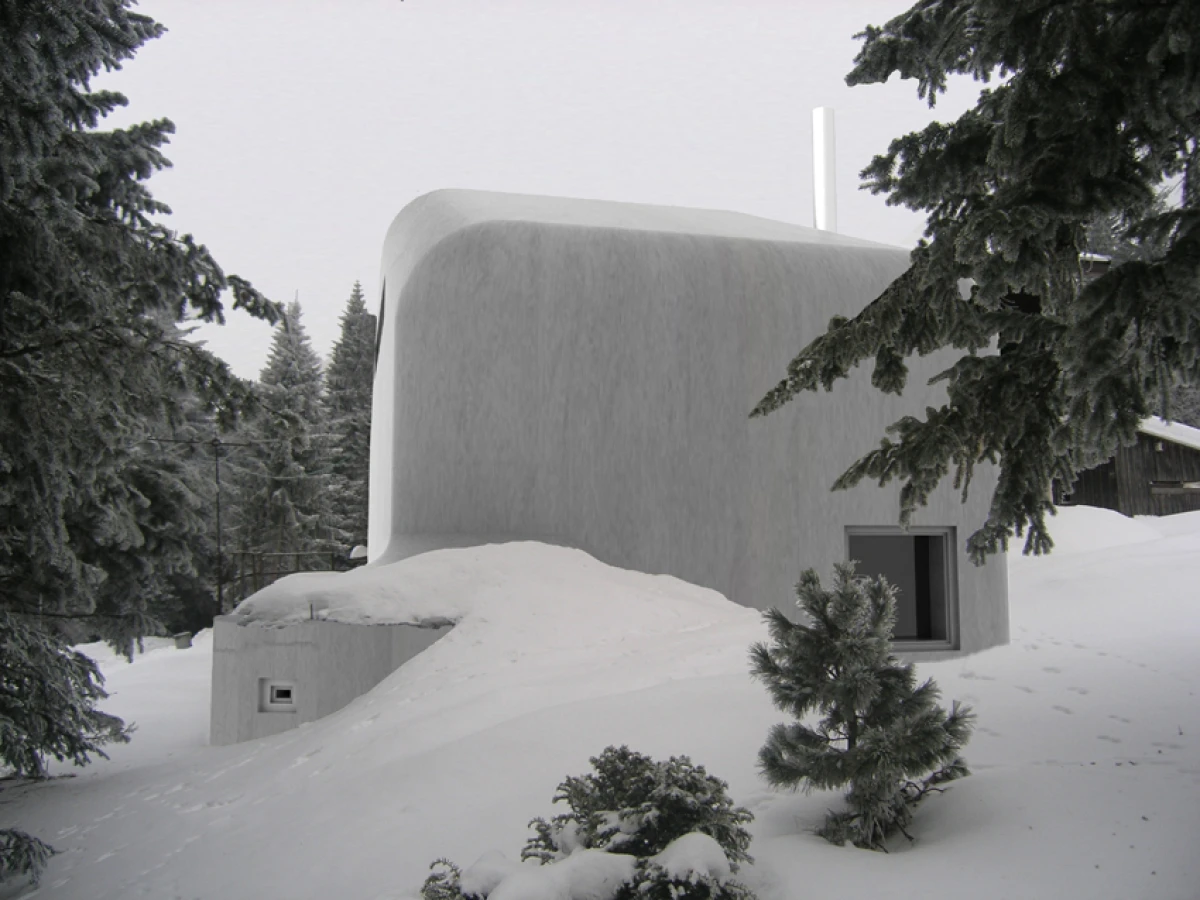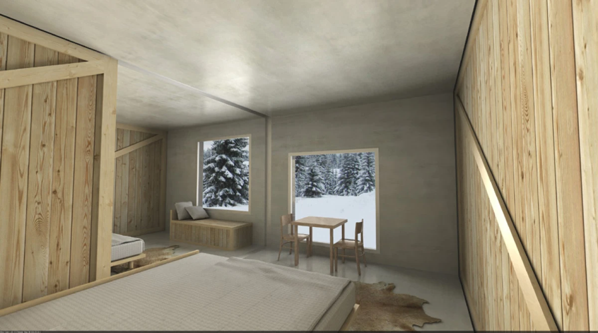 Významné místo, které zakončuje osu cesty směřující z Filipovy Hutě, je definováno existujícím bytovým domem. Ten je vystavěn na dvojici předválečných pevnostních bunkrech. Základním rozhodnutím je odstranění stávající nevyhovující stavby, ale při současném zachování obou bunkrů. Nový návrh přebírá obrys původní budovy a zároveň design bunkrů. Vzniká tak zajímavý kompilát obou prvků – klasické štítové stavby s oblými rohy a zalamovaným ostěním v oknech a dveřích. Nová stavba vytváří společně s bunkry jednu hmotu. Inspirace pohraničním opevňovacím systémem je díky existenci dvou bunkrů jakousi poklonou našemu předválečnému fortifikačnímu systému. Významným prvkem návrhu je horizontální, deset metrů široké okno umístěné ve společenské místnosti, které umožňuje nevšední panoramatický pohled na celé údolí Modravy. Objekt je kompletně celý navržen z litého pohledového a tepelně izolačního betonu. Interiérové prvky, jako jsou například posuvné stěny nebo vestavěné sociální zázemí pokojů, jsou řešeny z masivního dřeva.