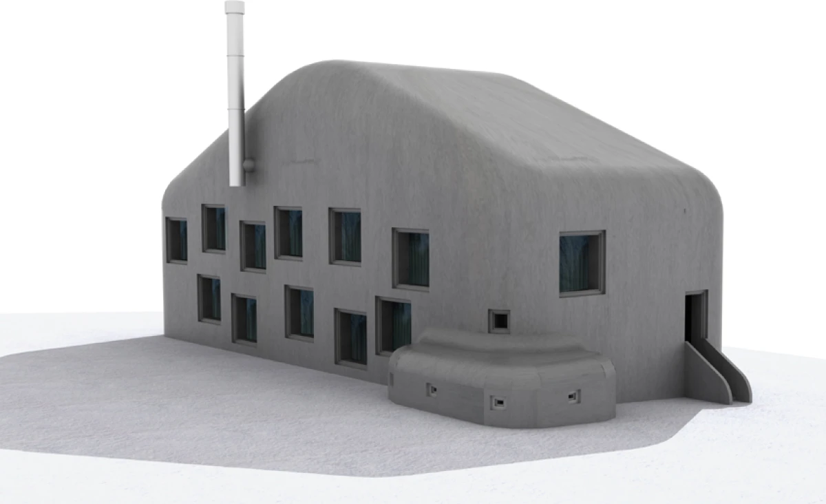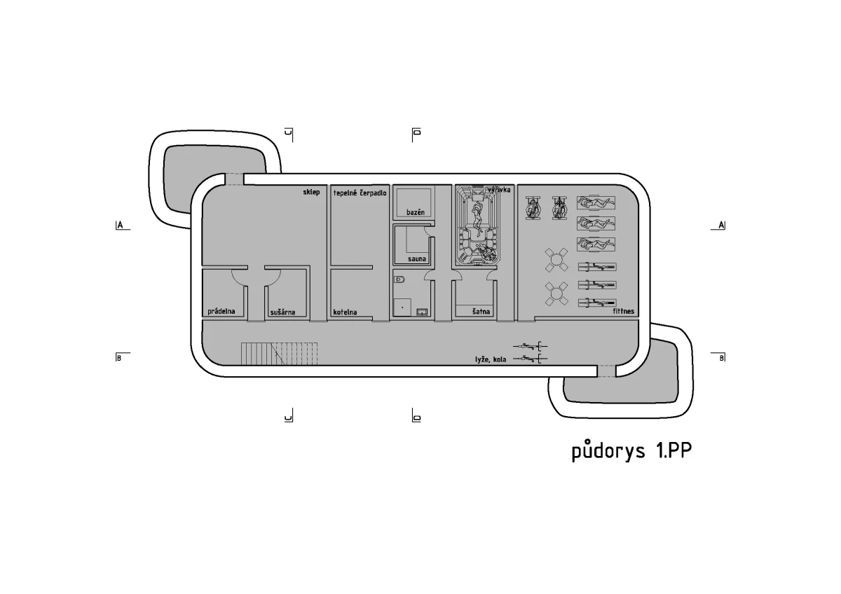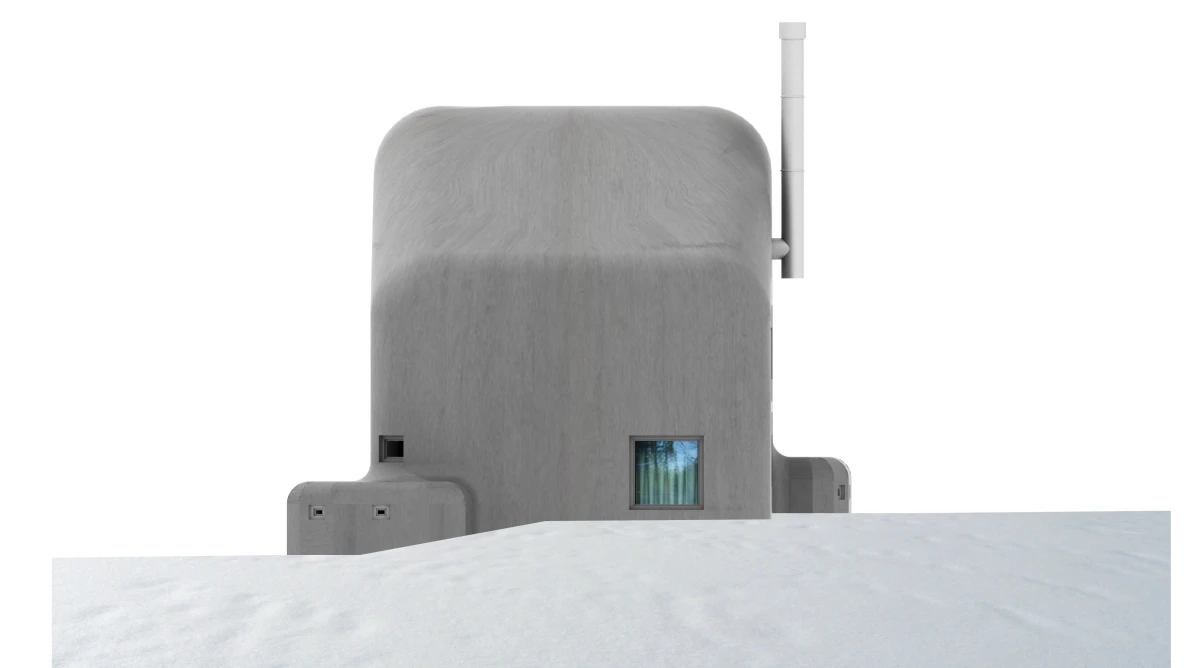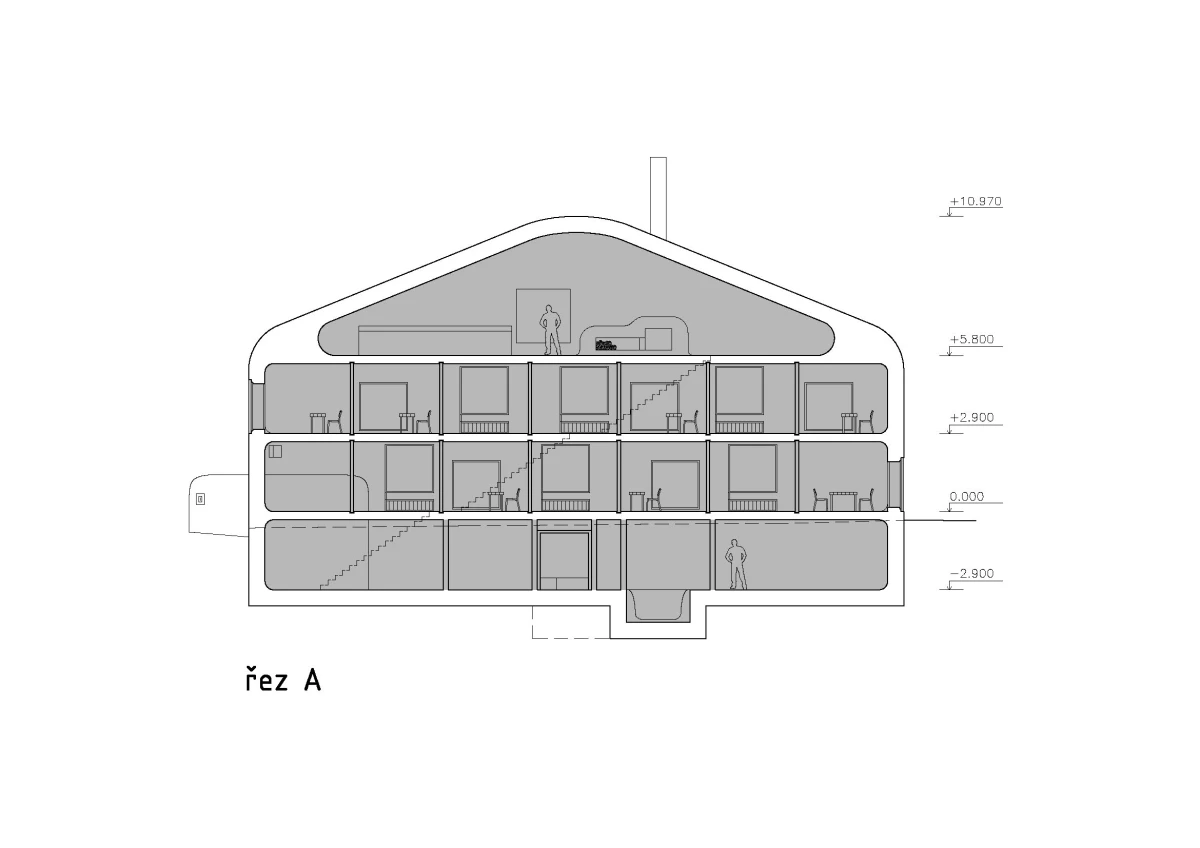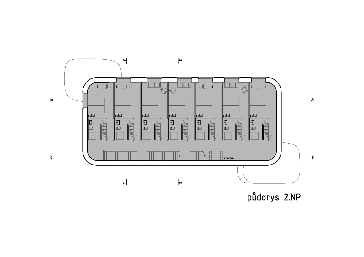 Významné místo, které zakončuje osu cesty směřující z Filipovy Hutě, je definováno existujícím bytovým domem. Ten je vystavěn na dvojici předválečných pevnostních bunkrech. Základním rozhodnutím je odstranění stávající nevyhovující stavby, ale při současném zachování obou bunkrů. Nový návrh přebírá obrys původní budovy a zároveň design bunkrů. Vzniká tak zajímavý kompilát obou prvků – klasické štítové stavby s oblými rohy a zalamovaným ostěním v oknech a dveřích. Nová stavba vytváří společně s bunkry jednu hmotu. Inspirace pohraničním opevňovacím systémem je díky existenci dvou bunkrů jakousi poklonou našemu předválečnému fortifikačnímu systému. Významným prvkem návrhu je horizontální, deset metrů široké okno umístěné ve společenské místnosti, které umožňuje nevšední panoramatický pohled na celé údolí Modravy. Objekt je kompletně celý navržen z litého pohledového a tepelně izolačního betonu. Interiérové prvky, jako jsou například posuvné stěny nebo vestavěné sociální zázemí pokojů, jsou řešeny z masivního dřeva.