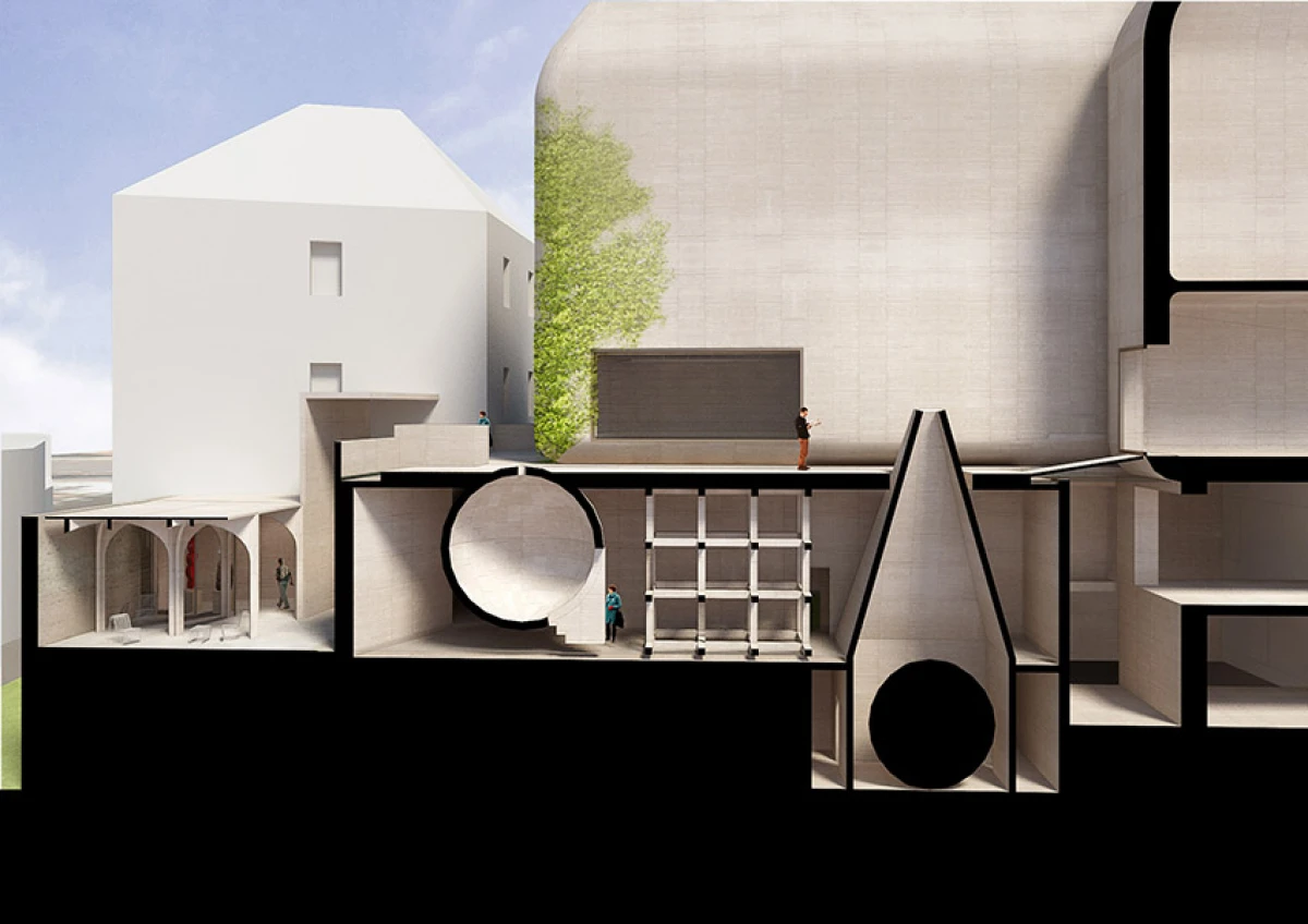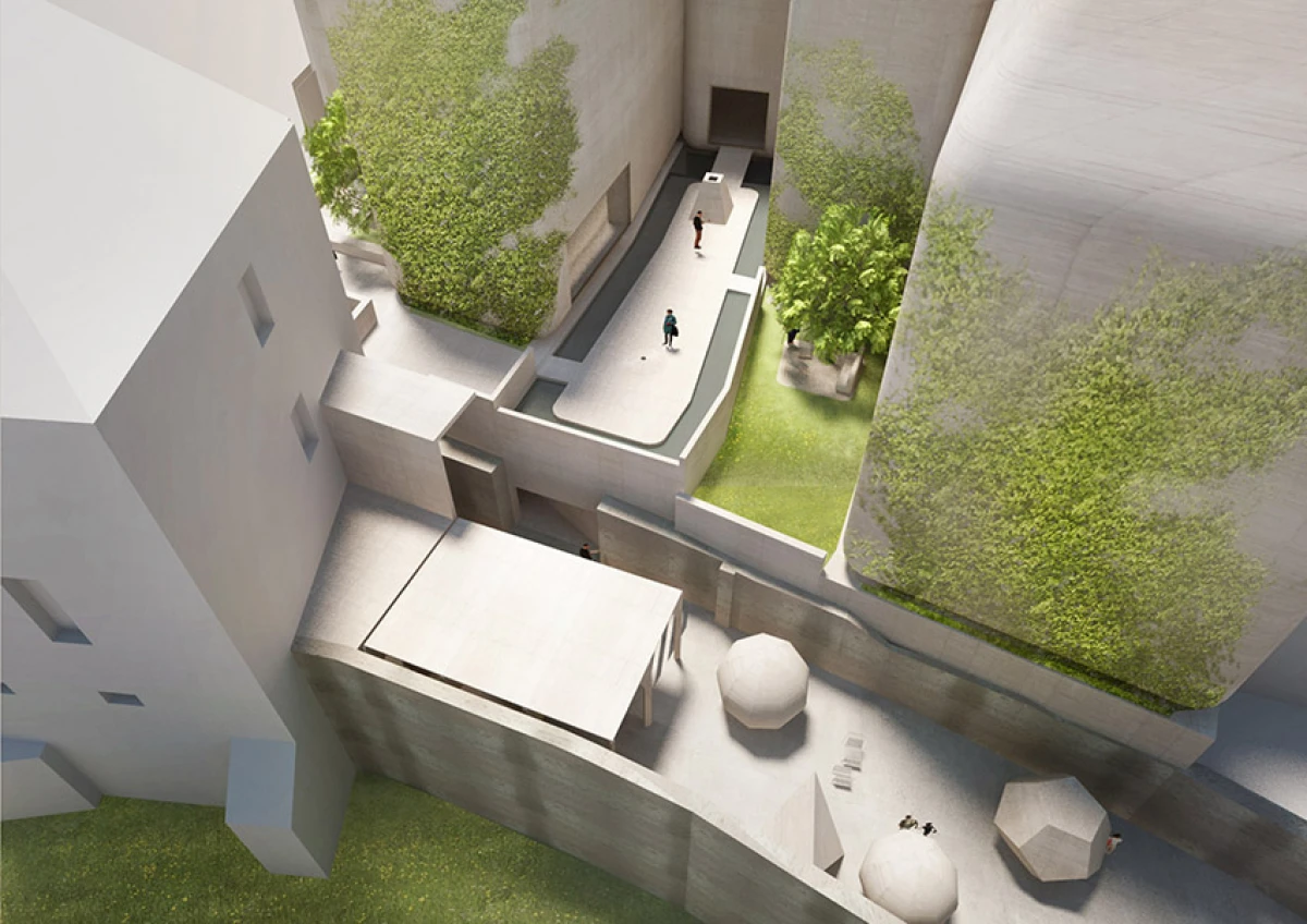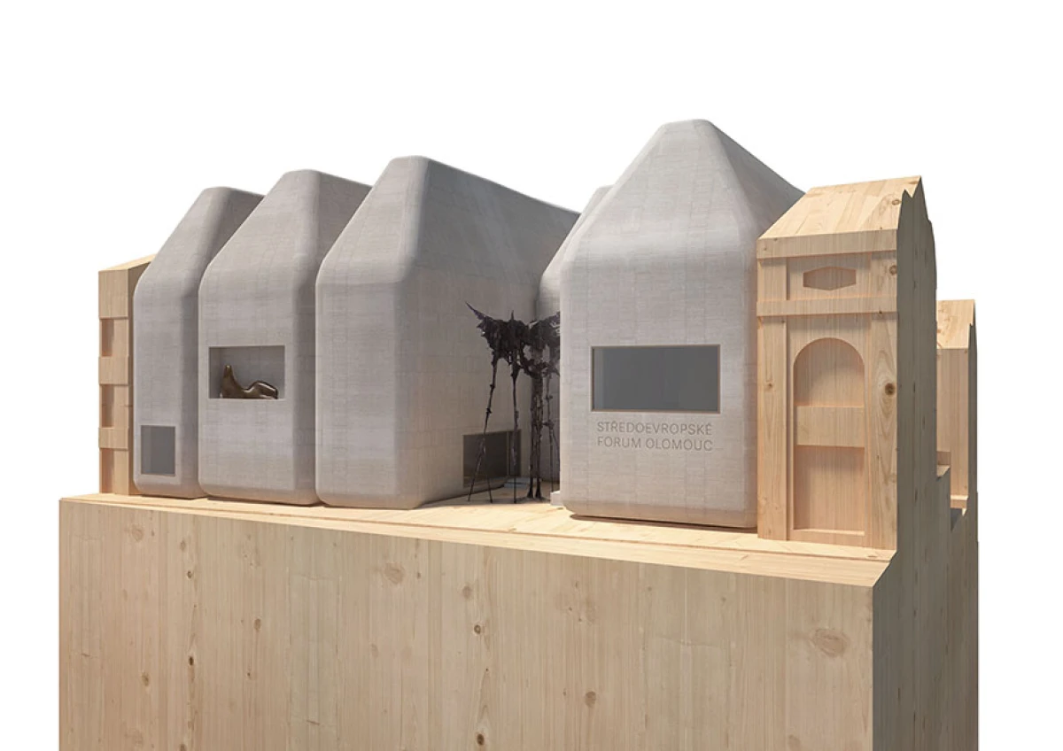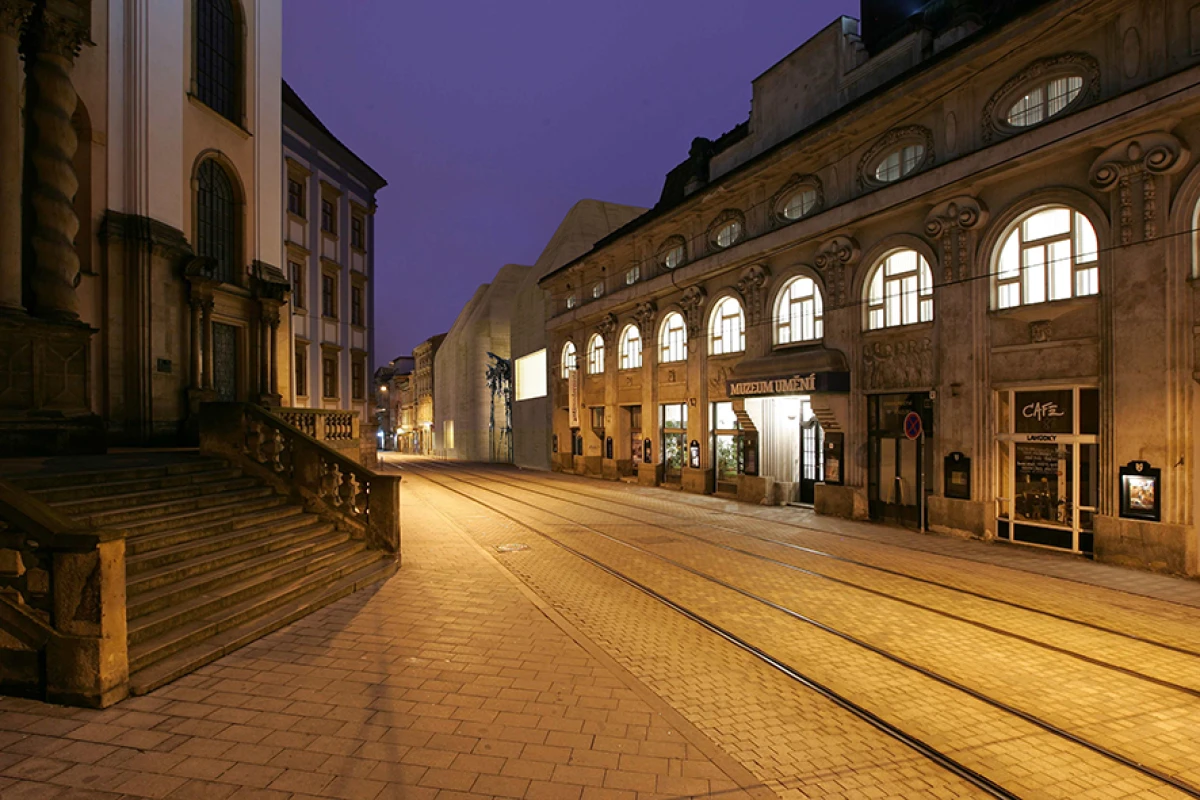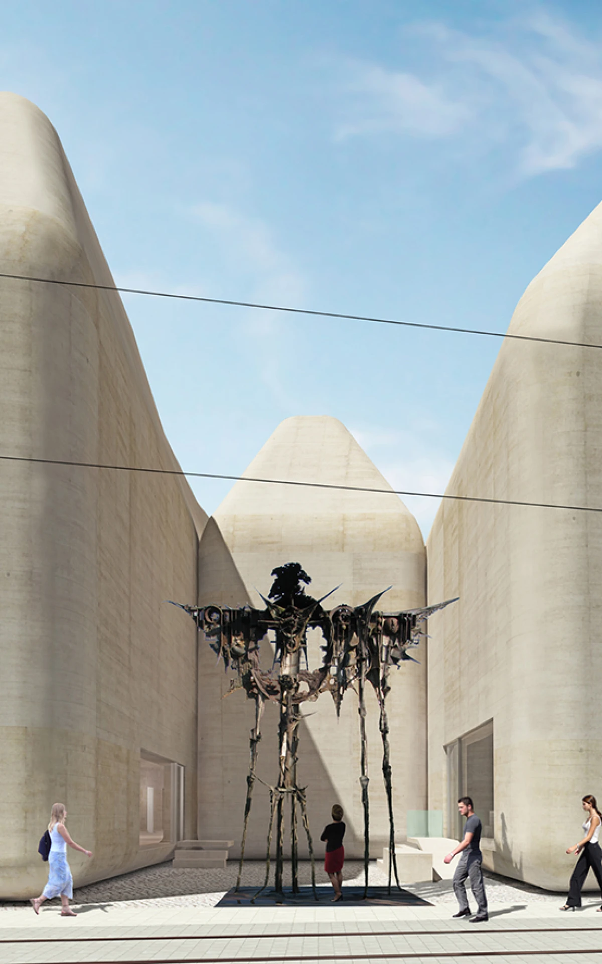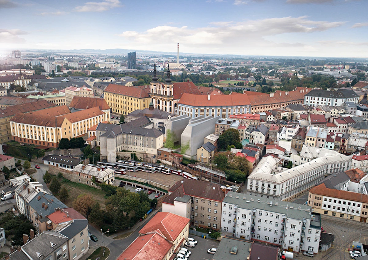 Řešení proluky v sousedství Muzea umění a v bezprostřední návaznosti na dominantu kostela Panny Marie Sněžné, je nesnadným úkolem. Jedná se o nejužší místo ve středu historické části Olomouce, které v sobě snoubí dva světy. Na jedné straně je to drobné měřítko středověké parcelace, na straně druhé zde začíná velké měřítko paláců, církevních a vojenských objektů Předhradí. Napětí z různých velikostí vyvolává řadu otázek: Jak se postavit k tomuto místu, které bylo zastavěno pěti samostatnými domy? Zopakovat situaci před stržením historických objektů v roce 1969 nebo vstoupit razantněji do tohoto prostředí a navázat naopak na reprezentační stavby. Koncepce se nakonec pokouší propojit inspiraci z obou měřítek, z obou protikladných světů. Drobnější velikost se uplatňuje respektováním všech pěti parcel. Opakováním stejné výšky říms i střech u jednotlivých domů se řada sceluje a vzniká tak dojem jednoho areálu, který navazuje na přilehlý objekt Muzea umění, tedy na velké měřítko. Rozčlenění nového muzea do jednotlivých objektů není formálním aktem, jenž by pouze předstíral kulisu pěti staveb, ale díky nutnému oddělení jednotlivých funkcí muzea se forma rozdělení nabízela automaticky. Rozdílná délka jednotlivých domů reaguje na různou velikost požadovaných funkcí. Ustoupením jednoho z objektů z řady domů důsledně sledujících původní uliční čáru do pozadí, vznikne nástupní piazzeta, která je nezbytná pro možnost vytvoření důstojného vstupu ve stísněných podmínkách nejužšího místa historického jádra. Velmi důležitým aspektem projektu je horní osvětlení sálů. Díky odříznutí vrchní části valbových střech se do vnitřních útrob každého objektu dostává přirozené denní světlo. Zvláště v prostoru knihovny je zřejmá inspirace podobně laděnými sály ať již z nerealizovaných vizí francouzských revolučních klasicistů, jako byl Boullèe a Ledoux nebo realizovanými knihovními prostorami z 18. a 19. století. I v případech, kdy je do jednotlivého objektu vkládáno patro, je přesto v nižším podlaží zajištěno denní osvětlení. Tento trik je uskutečněn vložením menšího domu, kolem kterého může světlo obtékat. Ve dvou případech se tak objevuje téma „domu v domě“, kde jsou zajištěny vhodné podmínky k vystavování na stěnách, a přitom v obou podlažích získáváme vrchní světlo. Veškeré sociální a technické zázemí, ale i schodiště a výtah je umístěno do dutých obvodových stěn domů. Podstatnou součástí celkového konceptu je materiálové řešení, které je stejně jako i konstrukce pojednáno z pohledového betonu, který je světle probarven. Beton díky tomu získává charakter podobající se umělému kameni. Tato úprava by měla konvenovat s fasádou Muzea umění, jež má fasádu z obdobně barevného umělého kamene.
