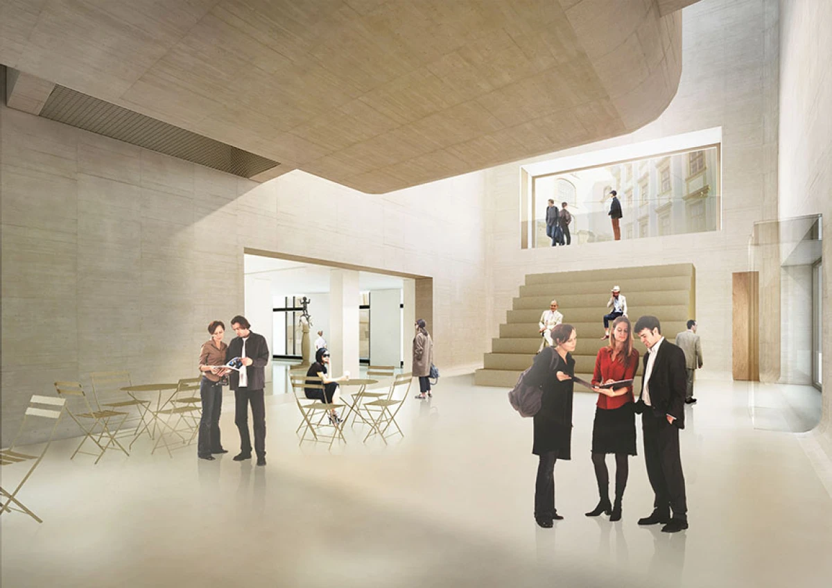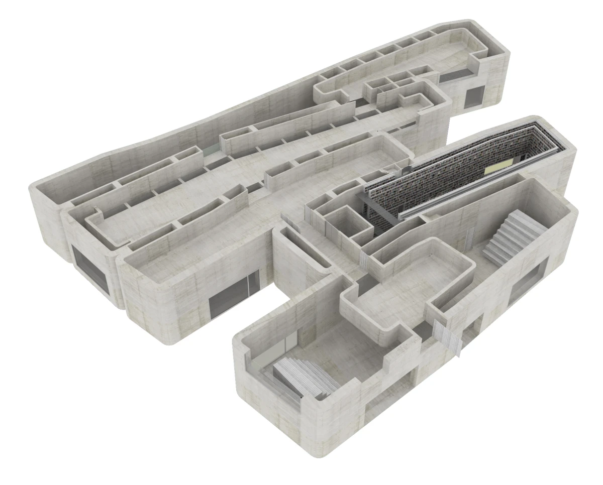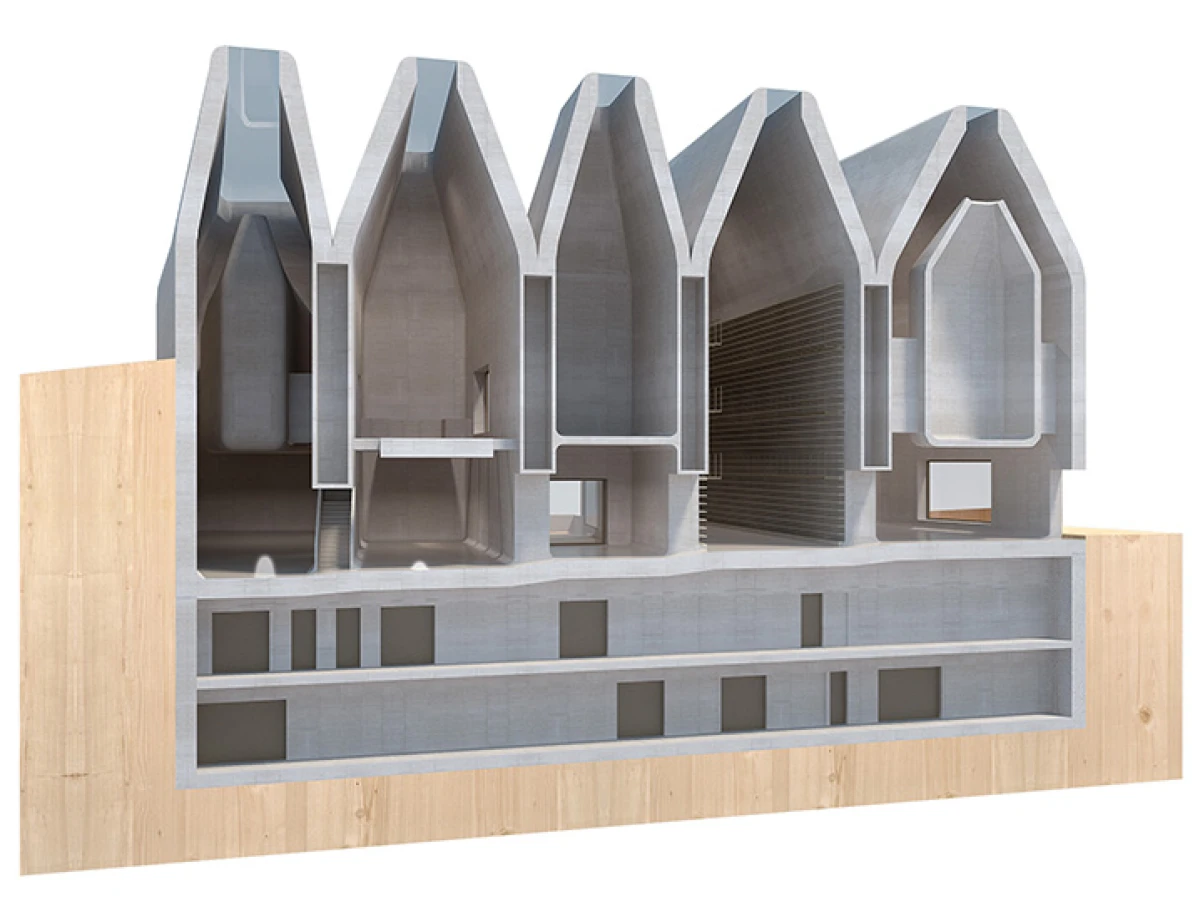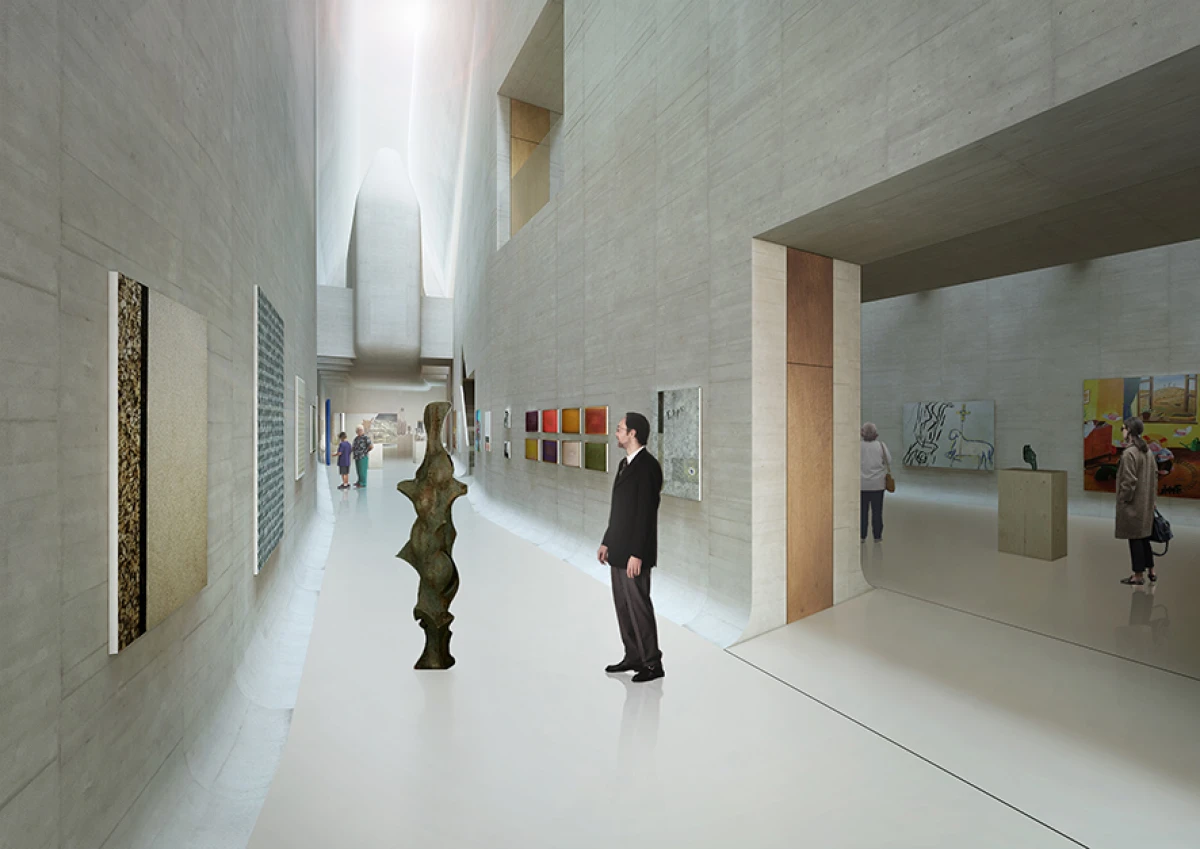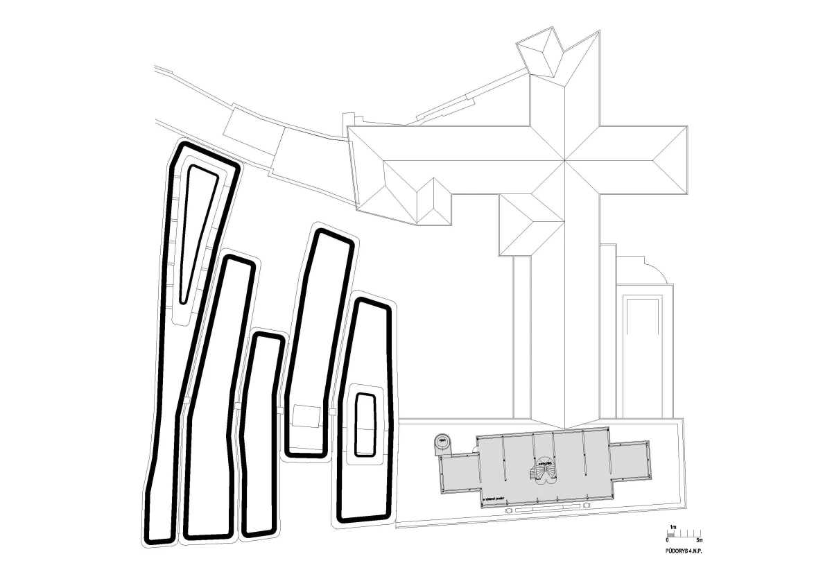 Řešení proluky v sousedství Muzea umění a v bezprostřední návaznosti na dominantu kostela Panny Marie Sněžné, je nesnadným úkolem. Jedná se o nejužší místo ve středu historické části Olomouce, které v sobě snoubí dva světy. Na jedné straně je to drobné měřítko středověké parcelace, na straně druhé zde začíná velké měřítko paláců, církevních a vojenských objektů Předhradí. Napětí z různých velikostí vyvolává řadu otázek: Jak se postavit k tomuto místu, které bylo zastavěno pěti samostatnými domy? Zopakovat situaci před stržením historických objektů v roce 1969 nebo vstoupit razantněji do tohoto prostředí a navázat naopak na reprezentační stavby. Koncepce se nakonec pokouší propojit inspiraci z obou měřítek, z obou protikladných světů. Drobnější velikost se uplatňuje respektováním všech pěti parcel. Opakováním stejné výšky říms i střech u jednotlivých domů se řada sceluje a vzniká tak dojem jednoho areálu, který navazuje na přilehlý objekt Muzea umění, tedy na velké měřítko. Rozčlenění nového muzea do jednotlivých objektů není formálním aktem, jenž by pouze předstíral kulisu pěti staveb, ale díky nutnému oddělení jednotlivých funkcí muzea se forma rozdělení nabízela automaticky. Rozdílná délka jednotlivých domů reaguje na různou velikost požadovaných funkcí. Ustoupením jednoho z objektů z řady domů důsledně sledujících původní uliční čáru do pozadí, vznikne nástupní piazzeta, která je nezbytná pro možnost vytvoření důstojného vstupu ve stísněných podmínkách nejužšího místa historického jádra. Velmi důležitým aspektem projektu je horní osvětlení sálů. Díky odříznutí vrchní části valbových střech se do vnitřních útrob každého objektu dostává přirozené denní světlo. Zvláště v prostoru knihovny je zřejmá inspirace podobně laděnými sály ať již z nerealizovaných vizí francouzských revolučních klasicistů, jako byl Boullèe a Ledoux nebo realizovanými knihovními prostorami z 18. a 19. století. I v případech, kdy je do jednotlivého objektu vkládáno patro, je přesto v nižším podlaží zajištěno denní osvětlení. Tento trik je uskutečněn vložením menšího domu, kolem kterého může světlo obtékat. Ve dvou případech se tak objevuje téma „domu v domě“, kde jsou zajištěny vhodné podmínky k vystavování na stěnách, a přitom v obou podlažích získáváme vrchní světlo. Veškeré sociální a technické zázemí, ale i schodiště a výtah je umístěno do dutých obvodových stěn domů. Podstatnou součástí celkového konceptu je materiálové řešení, které je stejně jako i konstrukce pojednáno z pohledového betonu, který je světle probarven. Beton díky tomu získává charakter podobající se umělému kameni. Tato úprava by měla konvenovat s fasádou Muzea umění, jež má fasádu z obdobně barevného umělého kamene.