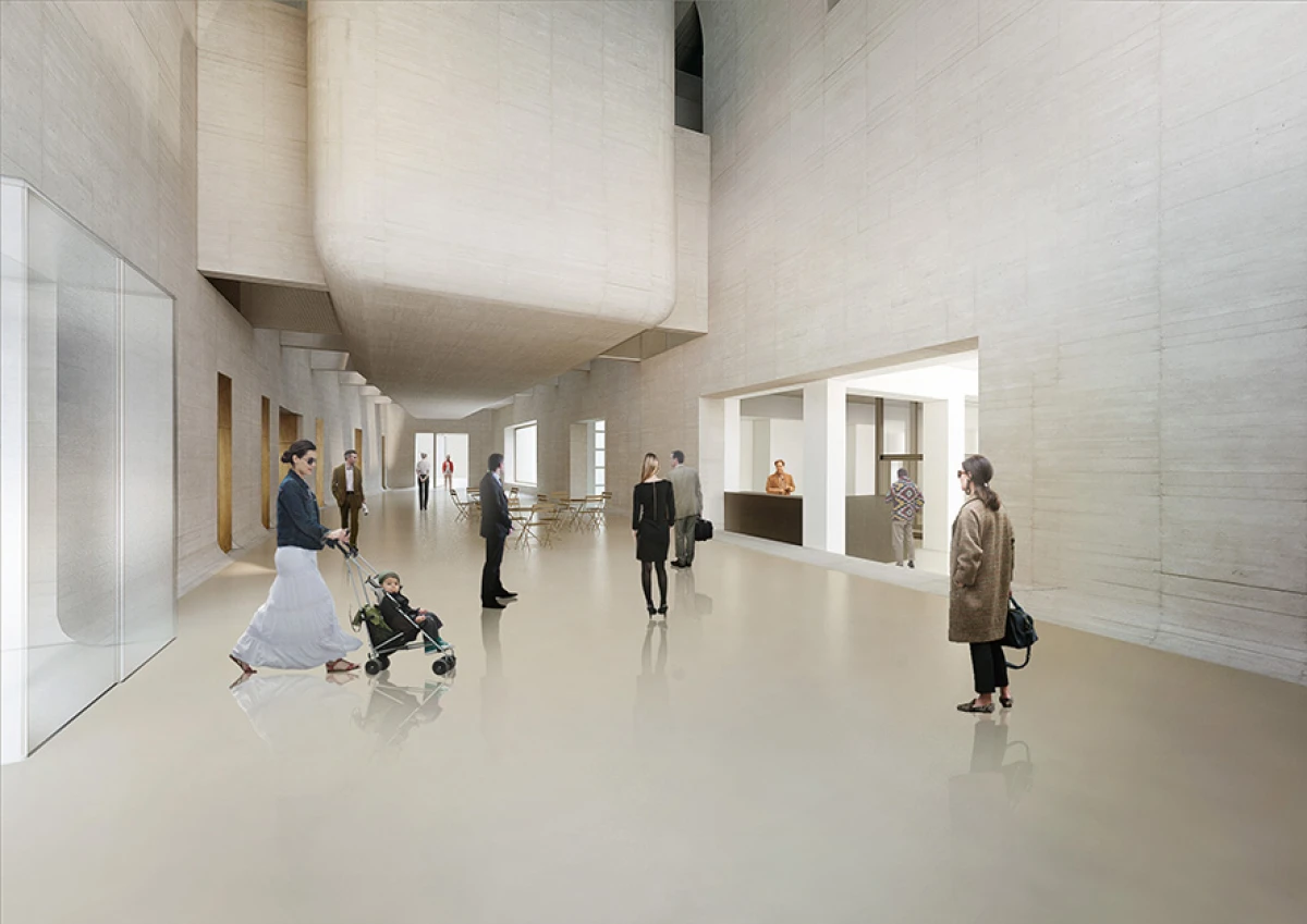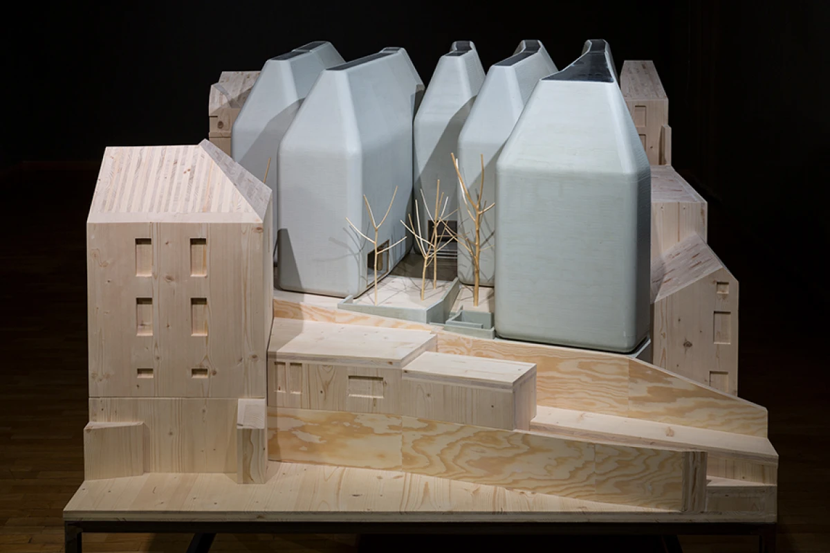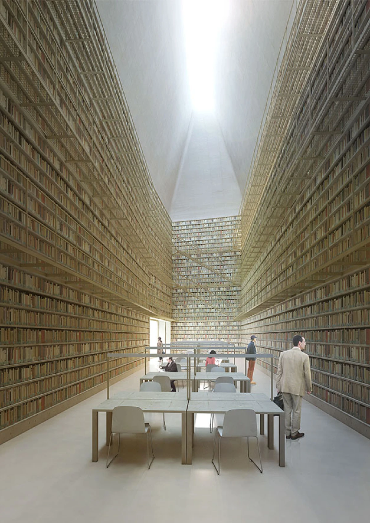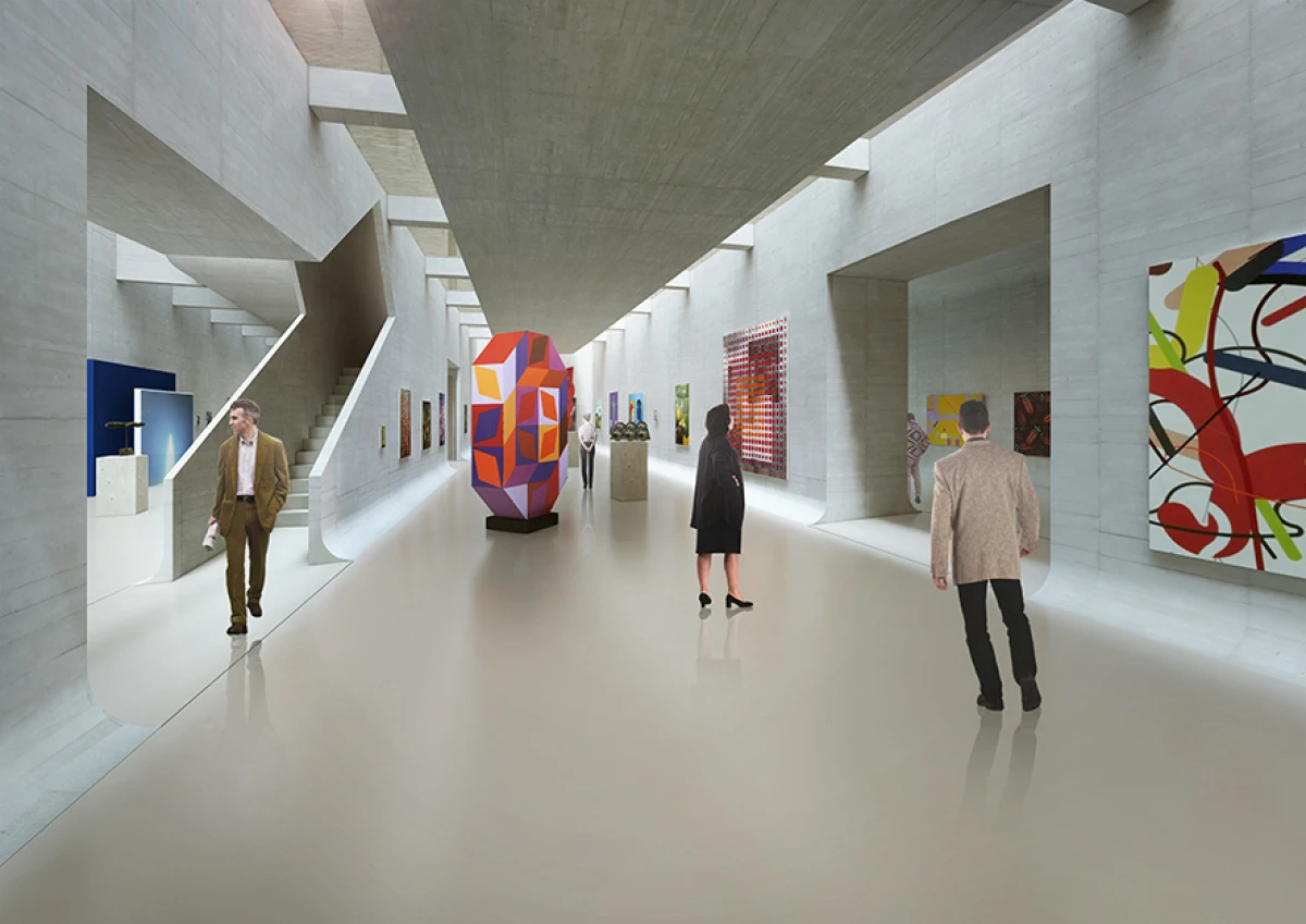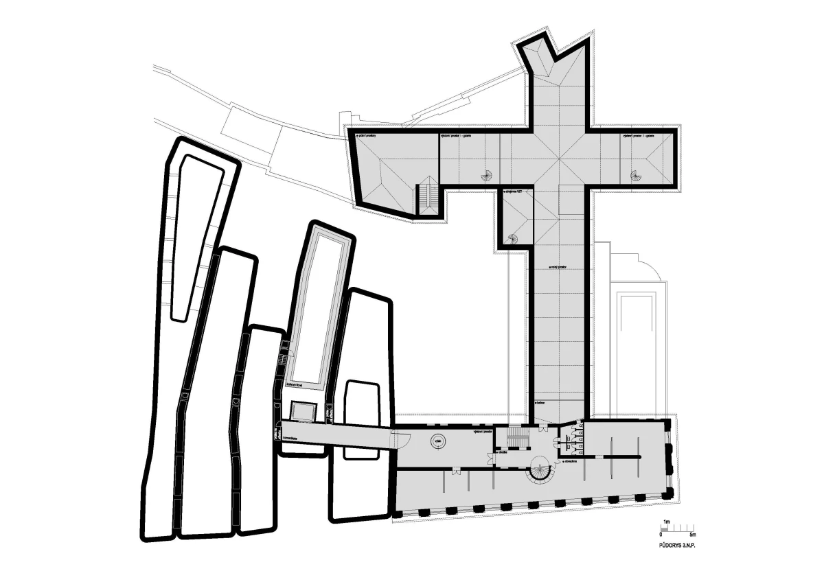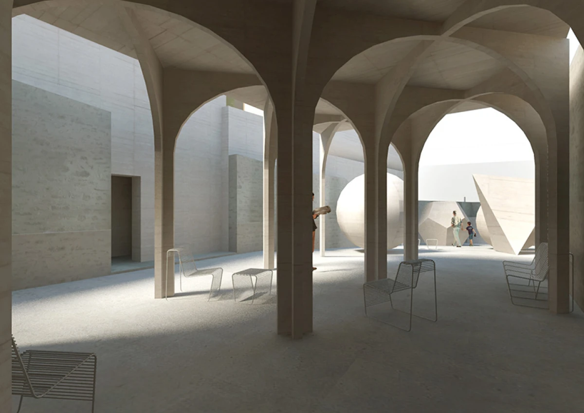 Řešení proluky v sousedství Muzea umění a v bezprostřední návaznosti na dominantu kostela Panny Marie Sněžné, je nesnadným úkolem. Jedná se o nejužší místo ve středu historické části Olomouce, které v sobě snoubí dva světy. Na jedné straně je to drobné měřítko středověké parcelace, na straně druhé zde začíná velké měřítko paláců, církevních a vojenských objektů Předhradí. Napětí z různých velikostí vyvolává řadu otázek: Jak se postavit k tomuto místu, které bylo zastavěno pěti samostatnými domy? Zopakovat situaci před stržením historických objektů v roce 1969 nebo vstoupit razantněji do tohoto prostředí a navázat naopak na reprezentační stavby. Koncepce se nakonec pokouší propojit inspiraci z obou měřítek, z obou protikladných světů. Drobnější velikost se uplatňuje respektováním všech pěti parcel. Opakováním stejné výšky říms i střech u jednotlivých domů se řada sceluje a vzniká tak dojem jednoho areálu, který navazuje na přilehlý objekt Muzea umění, tedy na velké měřítko. Rozčlenění nového muzea do jednotlivých objektů není formálním aktem, jenž by pouze předstíral kulisu pěti staveb, ale díky nutnému oddělení jednotlivých funkcí muzea se forma rozdělení nabízela automaticky. Rozdílná délka jednotlivých domů reaguje na různou velikost požadovaných funkcí. Ustoupením jednoho z objektů z řady domů důsledně sledujících původní uliční čáru do pozadí, vznikne nástupní piazzeta, která je nezbytná pro možnost vytvoření důstojného vstupu ve stísněných podmínkách nejužšího místa historického jádra. Velmi důležitým aspektem projektu je horní osvětlení sálů. Díky odříznutí vrchní části valbových střech se do vnitřních útrob každého objektu dostává přirozené denní světlo. Zvláště v prostoru knihovny je zřejmá inspirace podobně laděnými sály ať již z nerealizovaných vizí francouzských revolučních klasicistů, jako byl Boullèe a Ledoux nebo realizovanými knihovními prostorami z 18. a 19. století. I v případech, kdy je do jednotlivého objektu vkládáno patro, je přesto v nižším podlaží zajištěno denní osvětlení. Tento trik je uskutečněn vložením menšího domu, kolem kterého může světlo obtékat. Ve dvou případech se tak objevuje téma „domu v domě“, kde jsou zajištěny vhodné podmínky k vystavování na stěnách, a přitom v obou podlažích získáváme vrchní světlo. Veškeré sociální a technické zázemí, ale i schodiště a výtah je umístěno do dutých obvodových stěn domů. Podstatnou součástí celkového konceptu je materiálové řešení, které je stejně jako i konstrukce pojednáno z pohledového betonu, který je světle probarven. Beton díky tomu získává charakter podobající se umělému kameni. Tato úprava by měla konvenovat s fasádou Muzea umění, jež má fasádu z obdobně barevného umělého kamene.