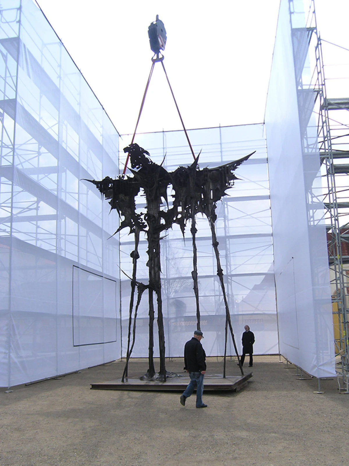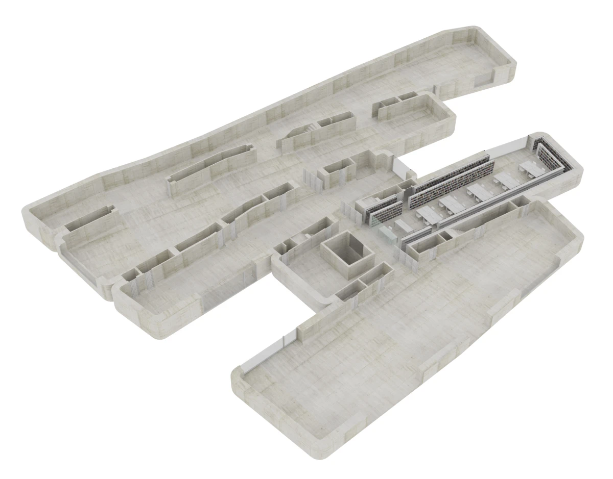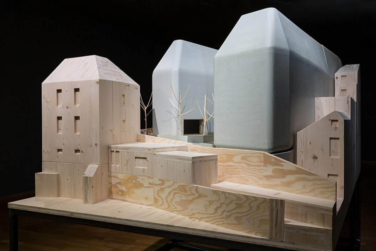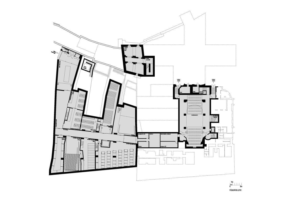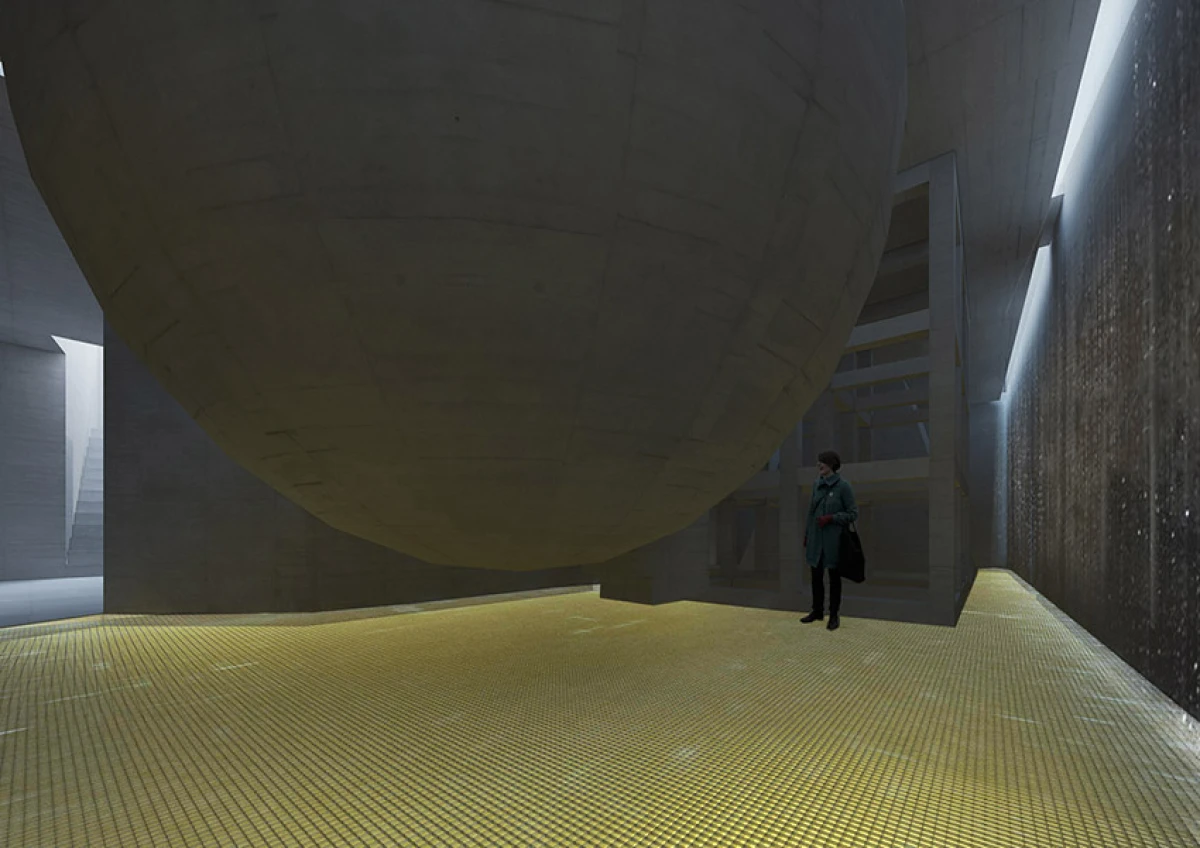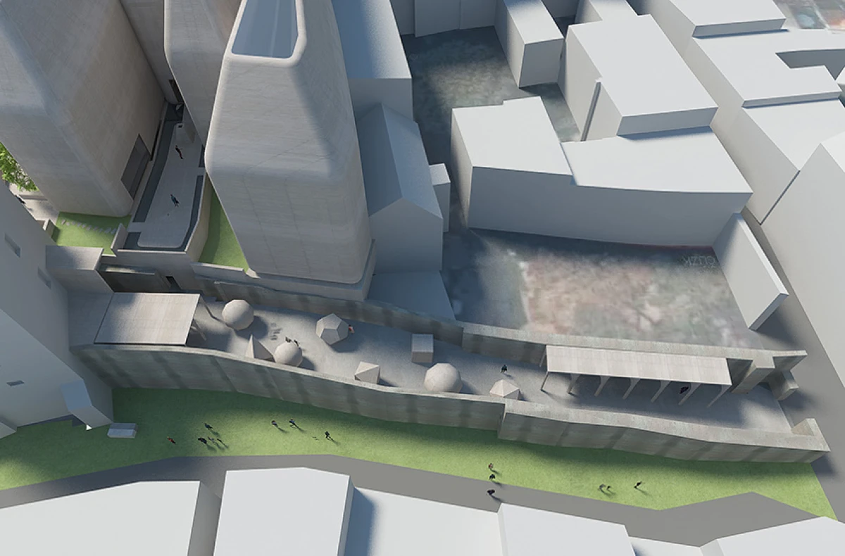 Řešení proluky v sousedství Muzea umění a v bezprostřední návaznosti na dominantu kostela Panny Marie Sněžné, je nesnadným úkolem. Jedná se o nejužší místo ve středu historické části Olomouce, které v sobě snoubí dva světy. Na jedné straně je to drobné měřítko středověké parcelace, na straně druhé zde začíná velké měřítko paláců, církevních a vojenských objektů Předhradí. Napětí z různých velikostí vyvolává řadu otázek: Jak se postavit k tomuto místu, které bylo zastavěno pěti samostatnými domy? Zopakovat situaci před stržením historických objektů v roce 1969 nebo vstoupit razantněji do tohoto prostředí a navázat naopak na reprezentační stavby. Koncepce se nakonec pokouší propojit inspiraci z obou měřítek, z obou protikladných světů. Drobnější velikost se uplatňuje respektováním všech pěti parcel. Opakováním stejné výšky říms i střech u jednotlivých domů se řada sceluje a vzniká tak dojem jednoho areálu, který navazuje na přilehlý objekt Muzea umění, tedy na velké měřítko. Rozčlenění nového muzea do jednotlivých objektů není formálním aktem, jenž by pouze předstíral kulisu pěti staveb, ale díky nutnému oddělení jednotlivých funkcí muzea se forma rozdělení nabízela automaticky. Rozdílná délka jednotlivých domů reaguje na různou velikost požadovaných funkcí. Ustoupením jednoho z objektů z řady domů důsledně sledujících původní uliční čáru do pozadí, vznikne nástupní piazzeta, která je nezbytná pro možnost vytvoření důstojného vstupu ve stísněných podmínkách nejužšího místa historického jádra. Velmi důležitým aspektem projektu je horní osvětlení sálů. Díky odříznutí vrchní části valbových střech se do vnitřních útrob každého objektu dostává přirozené denní světlo. Zvláště v prostoru knihovny je zřejmá inspirace podobně laděnými sály ať již z nerealizovaných vizí francouzských revolučních klasicistů, jako byl Boullèe a Ledoux nebo realizovanými knihovními prostorami z 18. a 19. století. I v případech, kdy je do jednotlivého objektu vkládáno patro, je přesto v nižším podlaží zajištěno denní osvětlení. Tento trik je uskutečněn vložením menšího domu, kolem kterého může světlo obtékat. Ve dvou případech se tak objevuje téma „domu v domě“, kde jsou zajištěny vhodné podmínky k vystavování na stěnách, a přitom v obou podlažích získáváme vrchní světlo. Veškeré sociální a technické zázemí, ale i schodiště a výtah je umístěno do dutých obvodových stěn domů. Podstatnou součástí celkového konceptu je materiálové řešení, které je stejně jako i konstrukce pojednáno z pohledového betonu, který je světle probarven. Beton díky tomu získává charakter podobající se umělému kameni. Tato úprava by měla konvenovat s fasádou Muzea umění, jež má fasádu z obdobně barevného umělého kamene.