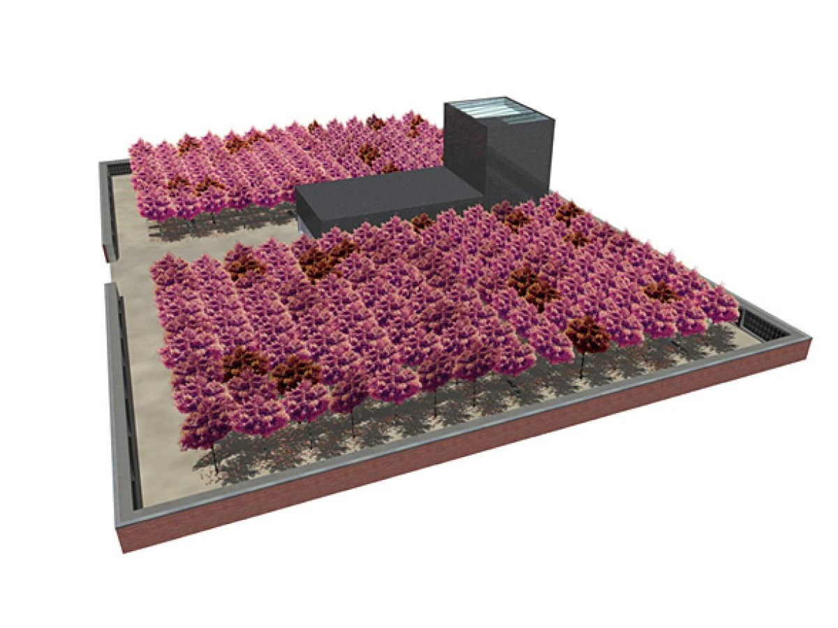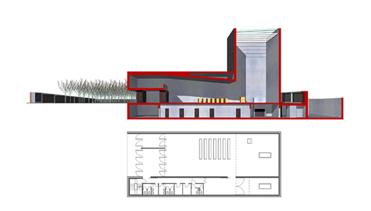 Nová smuteční síň dotváří celkovou urbanistickou koncepci areálu stávajícího hřbitova, a navazuje osově na protilehlou kapli. Podlouhlý tvar zvoleného řešení představuje cestu, zakončenou věží s horním světlem dopadajícím do hlavního prostoru s vystavenou rakví. Krematorium pro nás znamená vizi objektu, minimalistické sochy, která ve svých útrobách nerozptyluje pozornost návštěvníka a dává vyniknout smutečnímu obřadu. Vnější zdi smuteční obřadní síně jsou navrženy z broušeného černého terazza. Nedílnou součástí celého řešení je smuteční park, který představuje bosket z obou podélných stran obřadní síně. Bosket v tomto případě vytváří možnost příjemného odpočinku ve stínu stromů, ale i jistou monumentálnost sloupů – stromů, které tak představují pomyslný přírodní chrám ohraničený po celém obvodu zdí kolumbária.