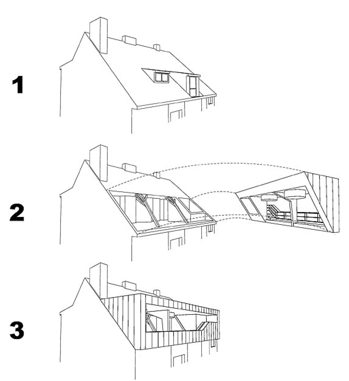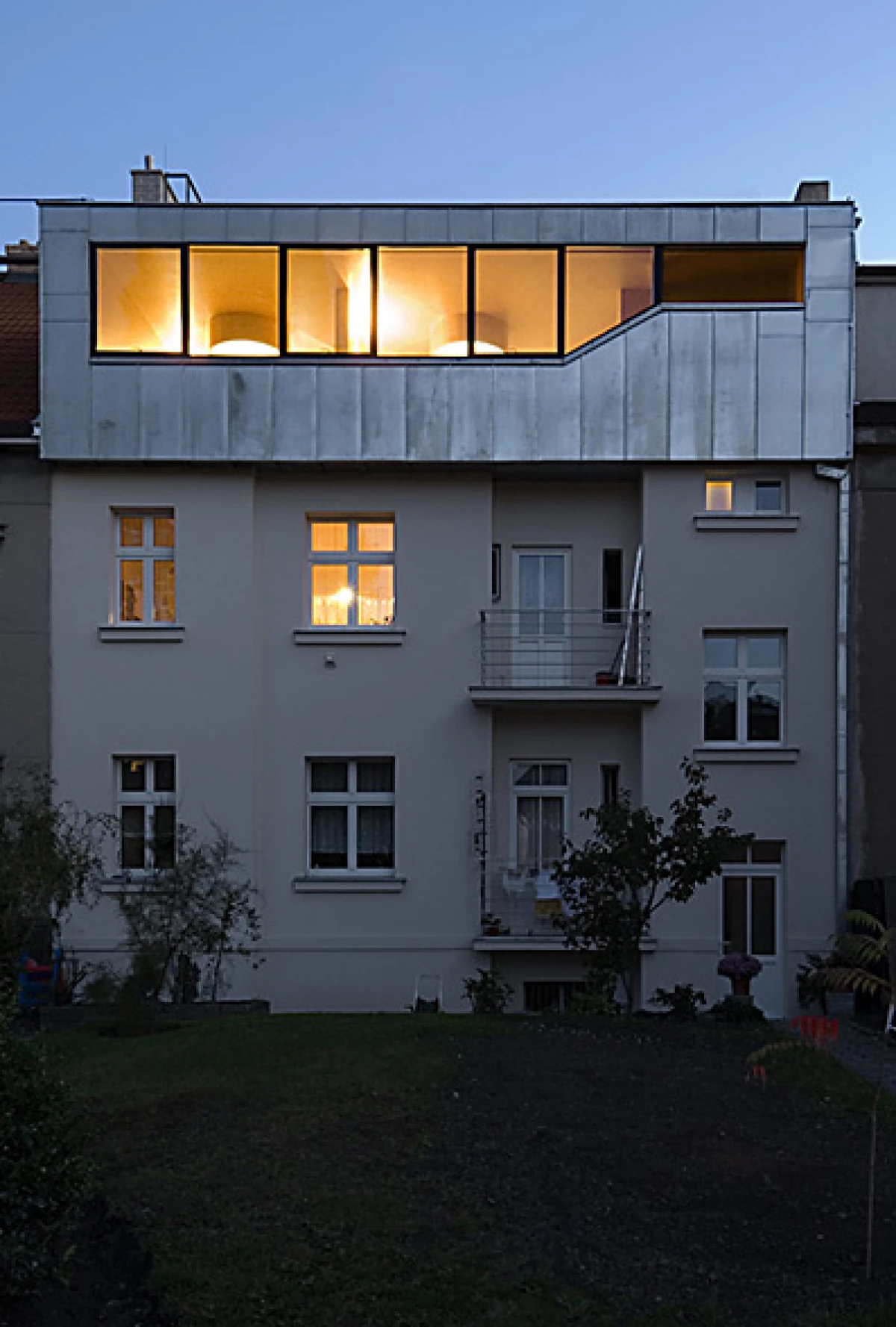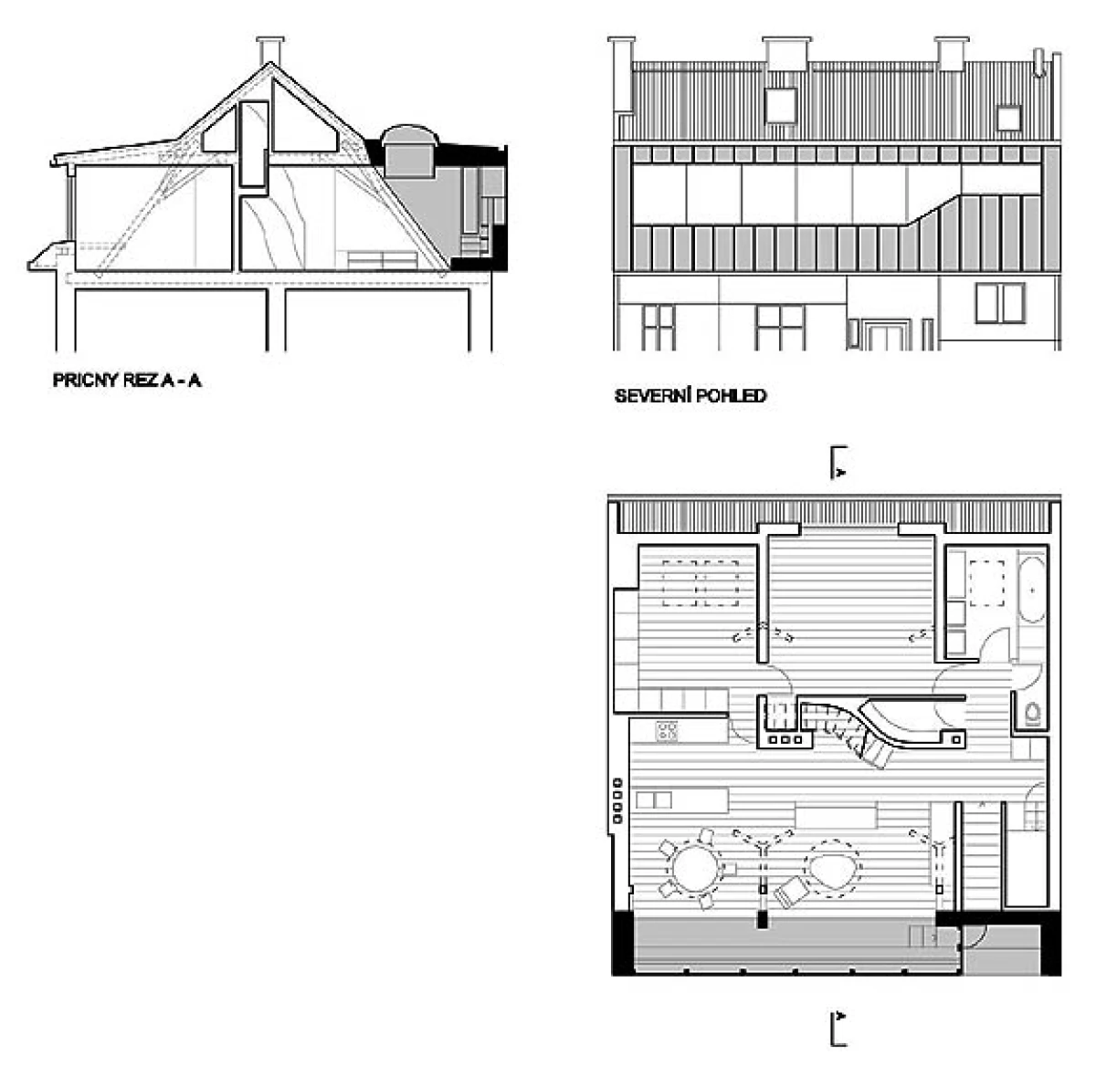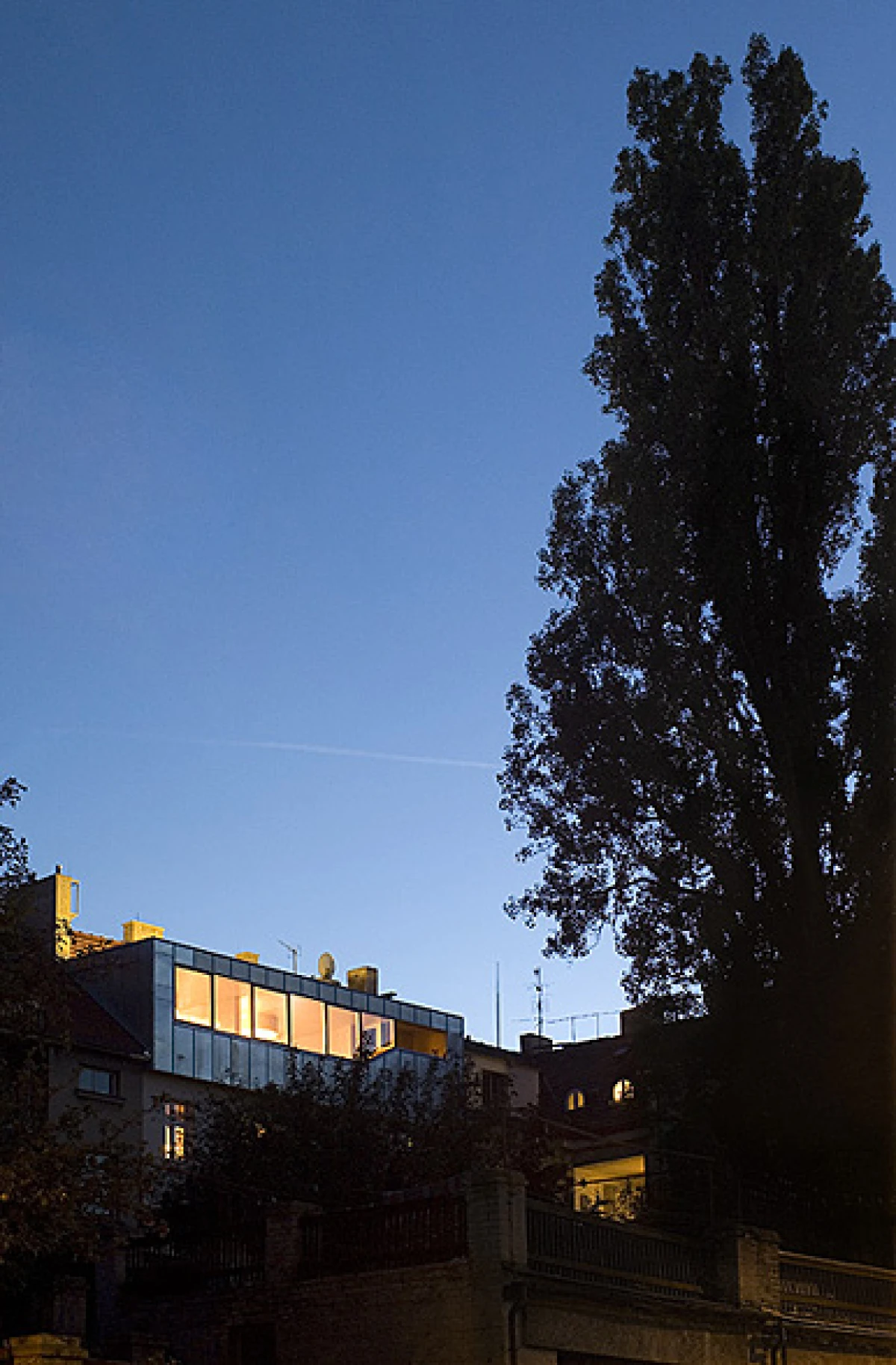 Stávající půdní prostor řadového rodinného domu z třicátých let 20. století nevyhovoval svojí dispozicí novým nárokům majitele. Rozhodli jsme se o razantní řešení, které jednak vylepšuje funkční uspořádání podkroví a zároveň výrazně zvětšuje celkovou půdorysnou plochu bytu. Ke stávajícímu krovu je přisazena nová hmota s rovnou střechou předstupující přes půdorys celého domu. Nová hmota masky je propsaná i do interiéru, včetně prořízlého hledí, které reaguje na výškové uspořádání vnitřku. Velký průzor hledí je obrácen severním směrem na Prahu. Díky střešním světlíkům umístěným nad jídelním a konferenčním stolem je do obývacího prostoru přivedeno jižní světlo. Stará část podkroví je ponechána v bílé barvě s dubovou podlahou. Nová maska je z OSB desek, krytá z vnější části titanzinkovým plechem. Další vložené prvky, jako je koupelna, wc, kuchyně a nábytek, jsou barevně odlišeny od původního podkroví.