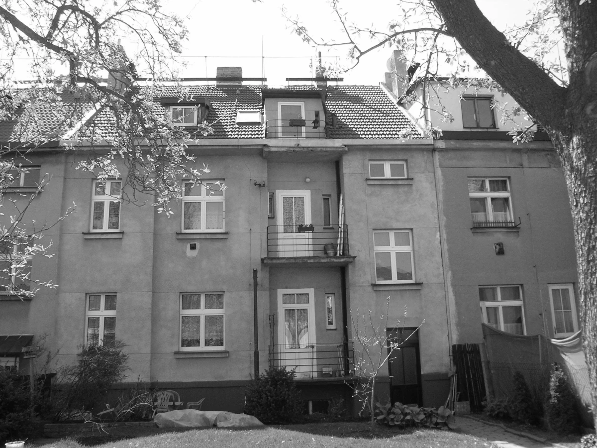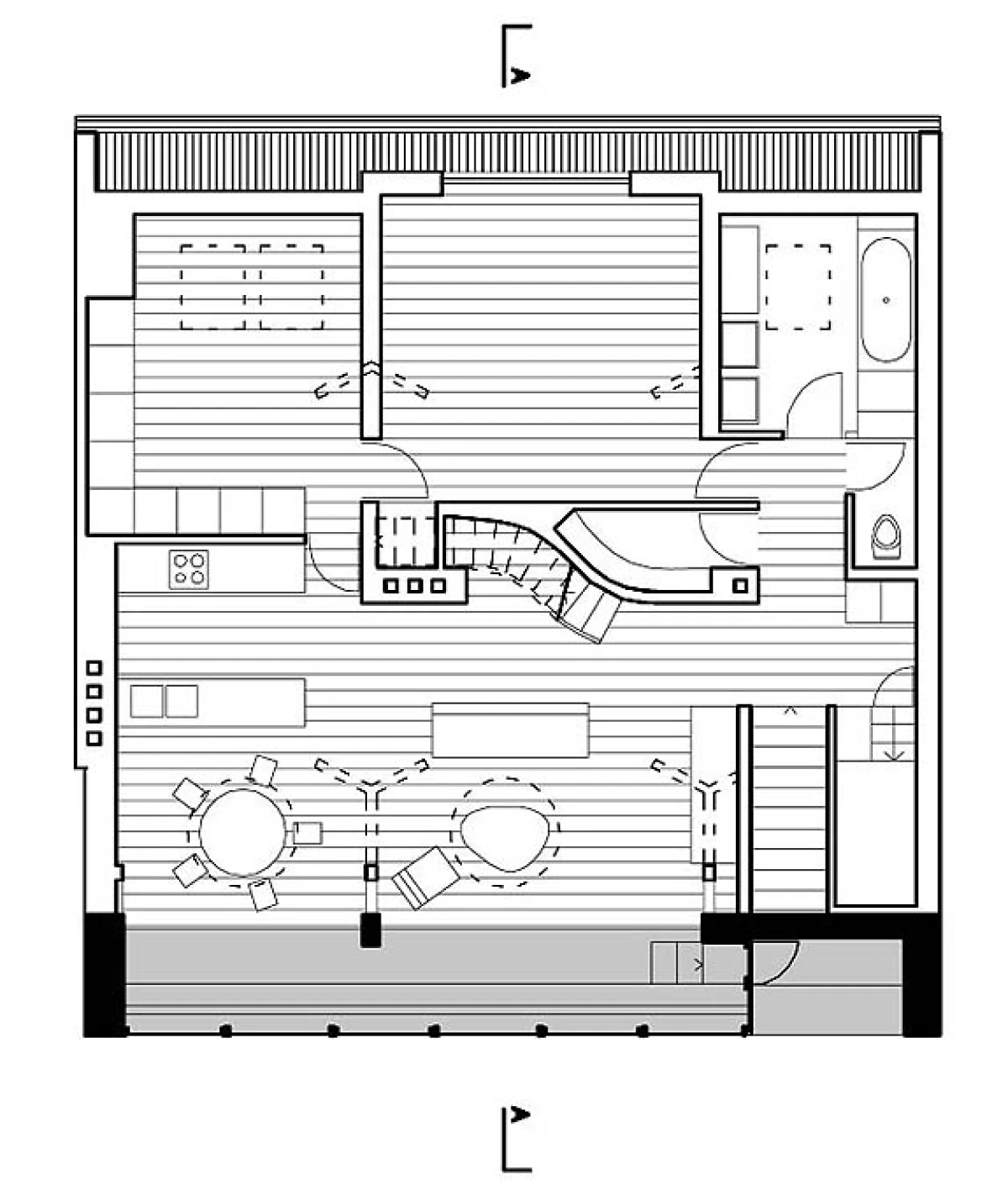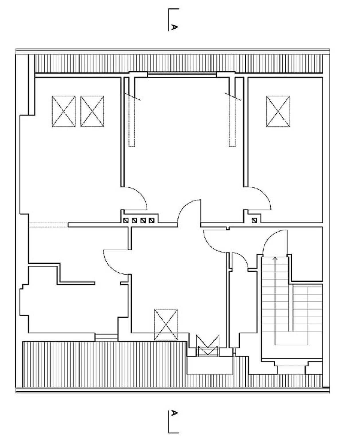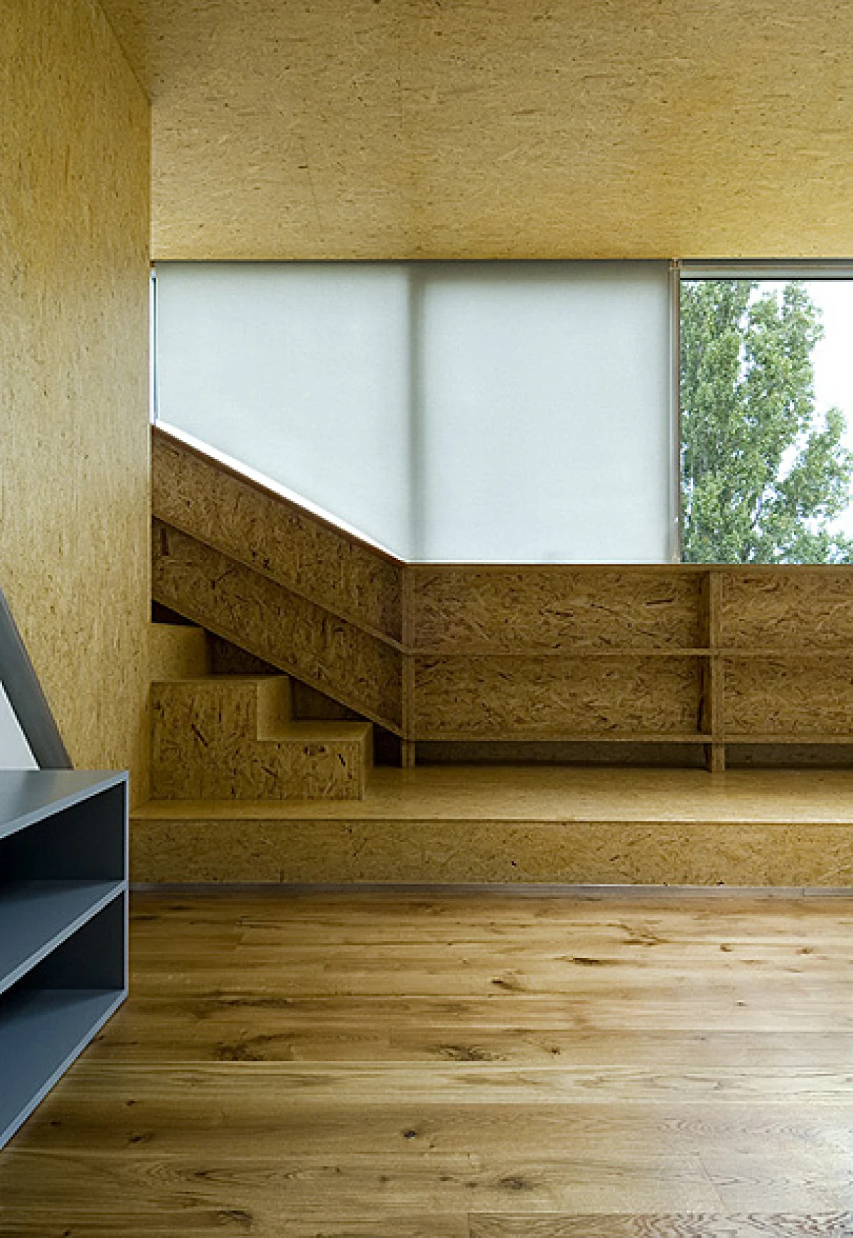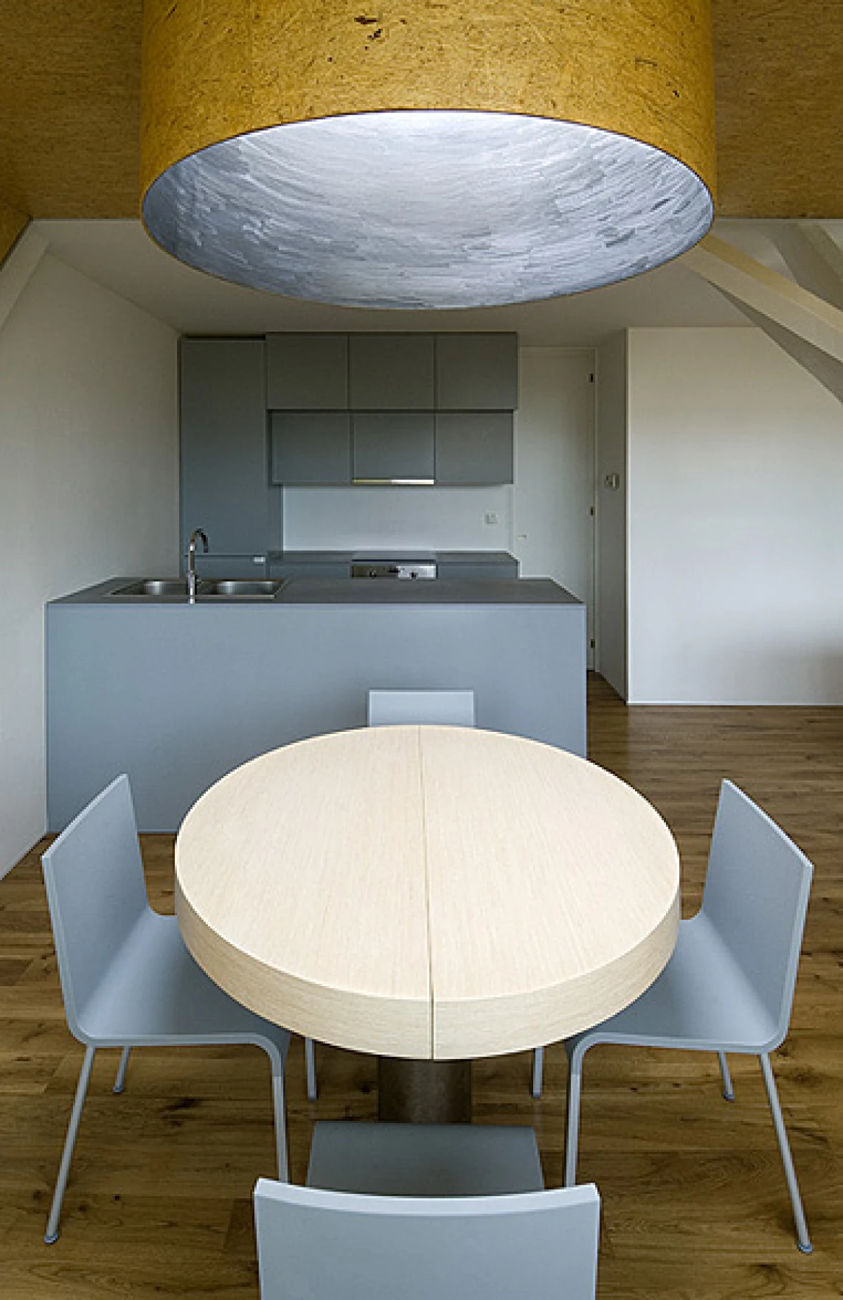 Stávající půdní prostor řadového rodinného domu z třicátých let 20. století nevyhovoval svojí dispozicí novým nárokům majitele. Rozhodli jsme se o razantní řešení, které jednak vylepšuje funkční uspořádání podkroví a zároveň výrazně zvětšuje celkovou půdorysnou plochu bytu. Ke stávajícímu krovu je přisazena nová hmota s rovnou střechou předstupující přes půdorys celého domu. Nová hmota masky je propsaná i do interiéru, včetně prořízlého hledí, které reaguje na výškové uspořádání vnitřku. Velký průzor hledí je obrácen severním směrem na Prahu. Díky střešním světlíkům umístěným nad jídelním a konferenčním stolem je do obývacího prostoru přivedeno jižní světlo. Stará část podkroví je ponechána v bílé barvě s dubovou podlahou. Nová maska je z OSB desek, krytá z vnější části titanzinkovým plechem. Další vložené prvky, jako je koupelna, wc, kuchyně a nábytek, jsou barevně odlišeny od původního podkroví.