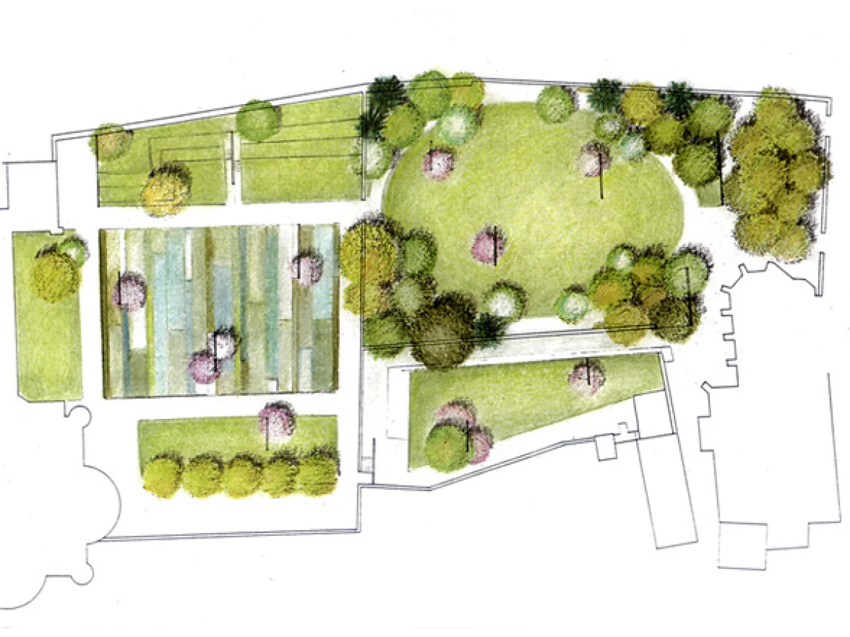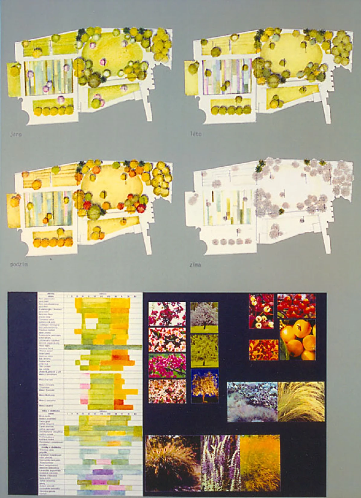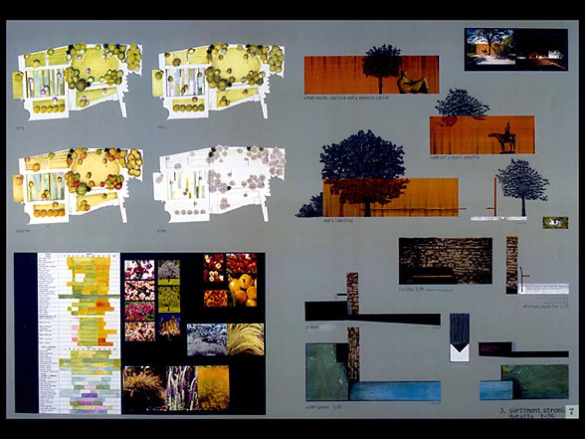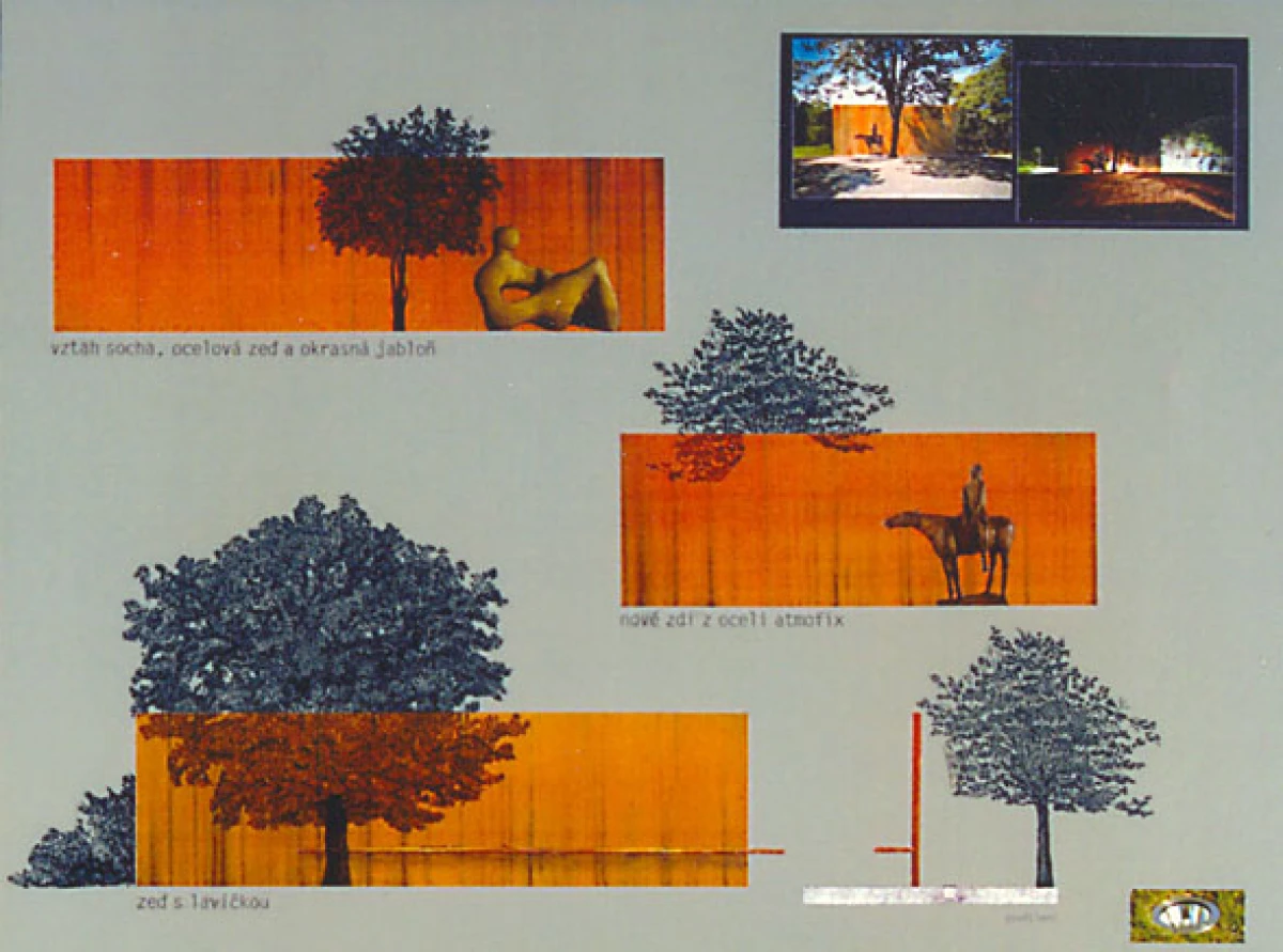 Návrh respektuje stávající opukové zdi, které se uchovaly od 18. století do dnešní doby. Prostory, které tyto zdi vymezují považujeme za jednotlivé "pokoje" (sály). Do každého ze tří sálů vkládáme jiný geometrický tvar t.j. obdélník, ovál a lichoběžník. Tím dostávají jednotlivé části parku odlišnou atmosféru. Celý park je propojen nepravidelně rozmístěnými solitérními zdmi, které prostupují všemi "pokoji" a scelují jeho geometrii. Tyto stěny z oceli atmofix jsou využity jako pozadí pro výtvarné objekty, na některých jsou umístěny dřevěné lavice nebo jsou součástí nově koncipovaných stavebních konstrukcí. Zdi jsou orientovány ve směru sever - jih. Zpravidla má každá zeď i svůj strom - okrasnou jabloň. Hlavní vstupní prostor u proboštského kostela je prakticky čtvrtým "pokojem", do kterého není vložen nový geometrický tvar.
