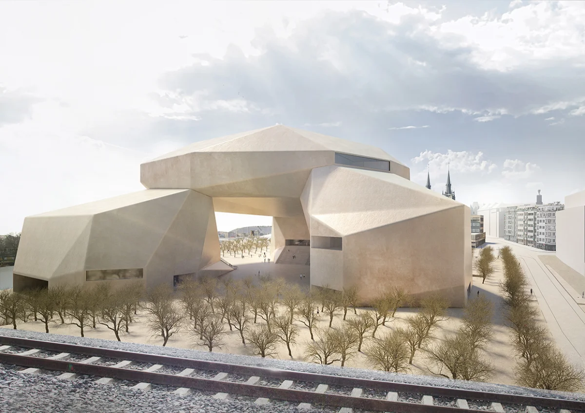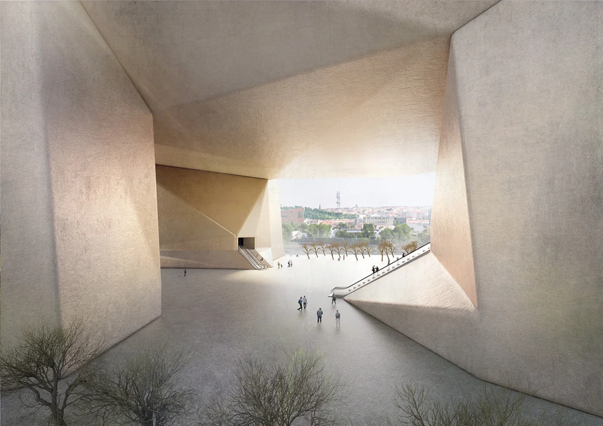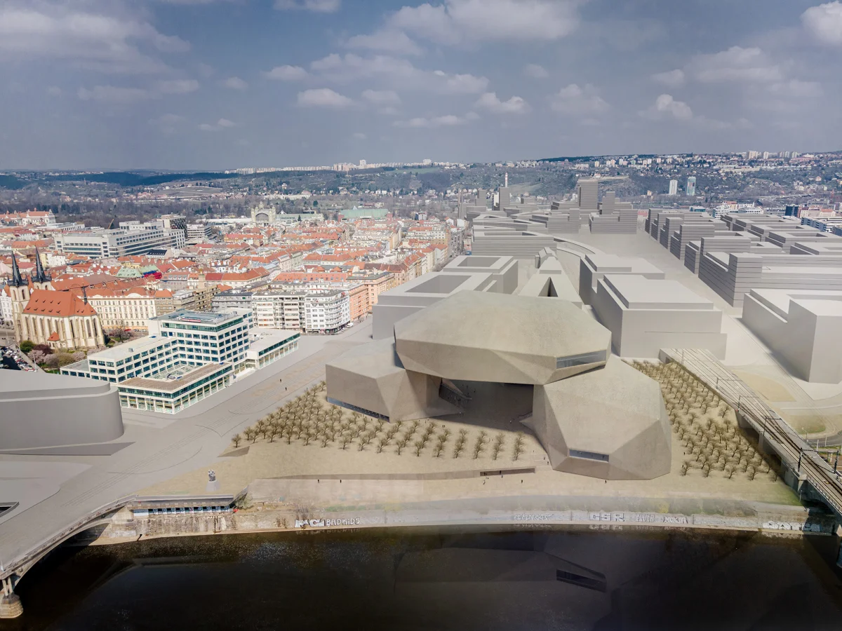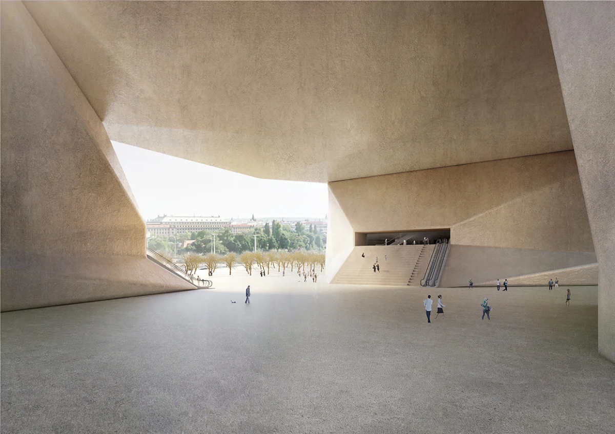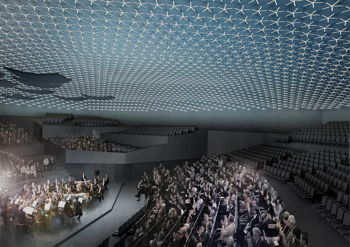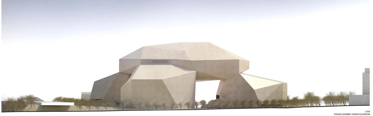 Naším cílem je vytvořit novou identitu místa. Člověk měl odnepaměti touhu zastřešit prostor. Nejlepším dokladem jsou megalitické stavby – dolmeny. Koncepce dolmenu má vyjadřovat monumentalitu, kterou vnímáme především v její duchovní hodnotě. Navrhujeme tak náměstí jako zastřešený prostor, nad kterým se vznáší koncertní sál. Poskytuje svobodu, ale zároveň budí respekt. Málokterá světová filharmonie má kolem sebe živý veřejný prostor. Jakým způsobem docílit živého náměstí při zachování klidného a soustředěného prostředí koncertní haly? Tato otázka nás provázela při přemýšlení nad konceptem stavby. Řešíme ji vyzdvižením hlavního sálu. Náměstí je chráněno od rušného okolí třemi podporami, na kterých je hlavní sál posazen. Každá z podpor rovněž obsahuje sál. Pomyslně tedy tři sály nesou na svých bedrech velký sál. Na náměstí jsou situovány hlavní vstupy do filharmonie a do jednotlivých sálů, dále se zde nachází restaurace, obchody, kavárna a je tu možné pořádat drobná hudební vystoupení v otevřeném amfiteátru, kde je také situován hlavní vchod. Navržené rozmístění „kamenů“ zohledňuje řadu problematických tras, které tudy vedou. Jednou z nich je trasa průjezdné komunikace, jež je vedena pod navrženou platformou. Stejně tak reagujeme ustoupením jednotlivých objektů trase metra, kdy není možné hlubinné založení v místě tubusu. Tím je vymezen veřejný prostor na povrchu navržené platformy, který je věnován čistě pěším. Hlavní sál představující vnitřní jádro chce být nástrojem. Jeho geometrie se utvářela na základě akustických parametrů. Následně jsme ho uzavřeli do vnější skořápky, jež jej chrání před hlukem z okolí. Jádro a skořápka představují jedno těleso. To, co vnímáme z exteriéru jako obrovský kámen, nacházíme v interiéru v podobě jádra. Stejně jako u lískového ořechu se jádro podobá skořápce. Prostoru hlavního sálu dominuje modré pozadí, které směrem k pódiu a hledišti přechází do tmavě modré. Stropu vévodí umělé osvětlení v podobě stylizovaných hvězd. Naší inspirací se staly historické výmalby kleneb kaplí a kostelů, jež pracují s hvězdnou oblohou. Ostatní sály jsou v interiéru rovněž barevně pojednané. Použité materiály podporují celkový koncept návrhu. Novostavba je kompletně pojata jako odlitek z monolitického železobetonu. Beton uvažujeme probarvený, sametově hnědý, s vysokým leskem, kdy by se do bednění vkládaly speciální lesklé fólie. Betonový povrch všech vložených sálů chceme ze strany foyeru opatřit hrubým pemrlováním. Tím docílíme kontrastu mezi hladkým, lesklým povrchem fasády a hrubým vsazeným jádrem, které představují samotné sály.