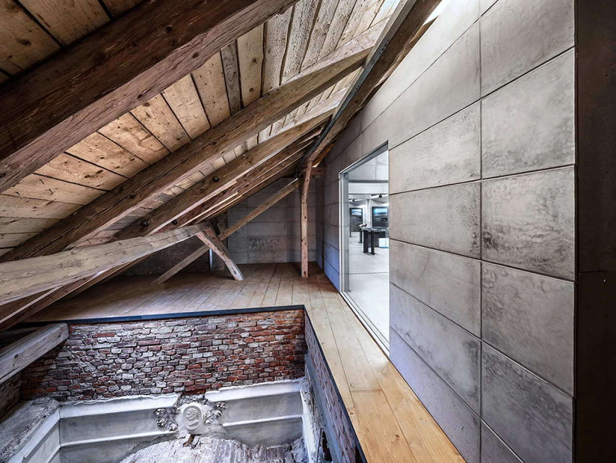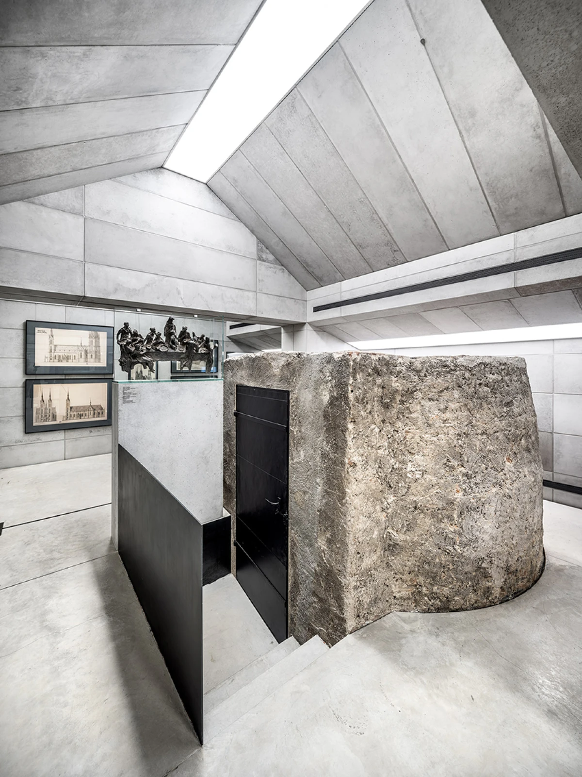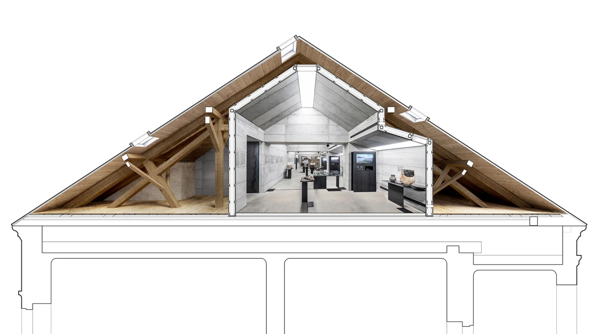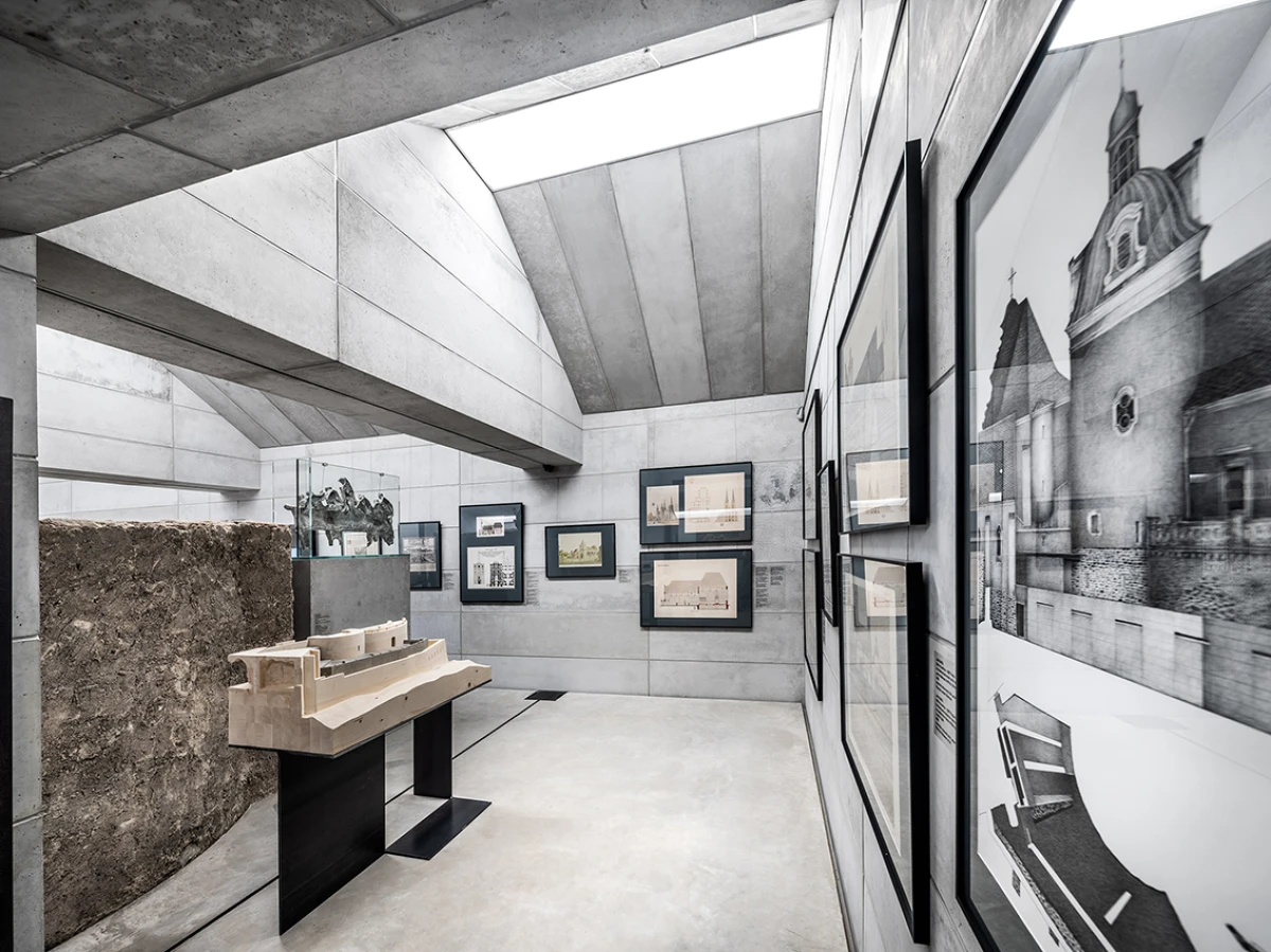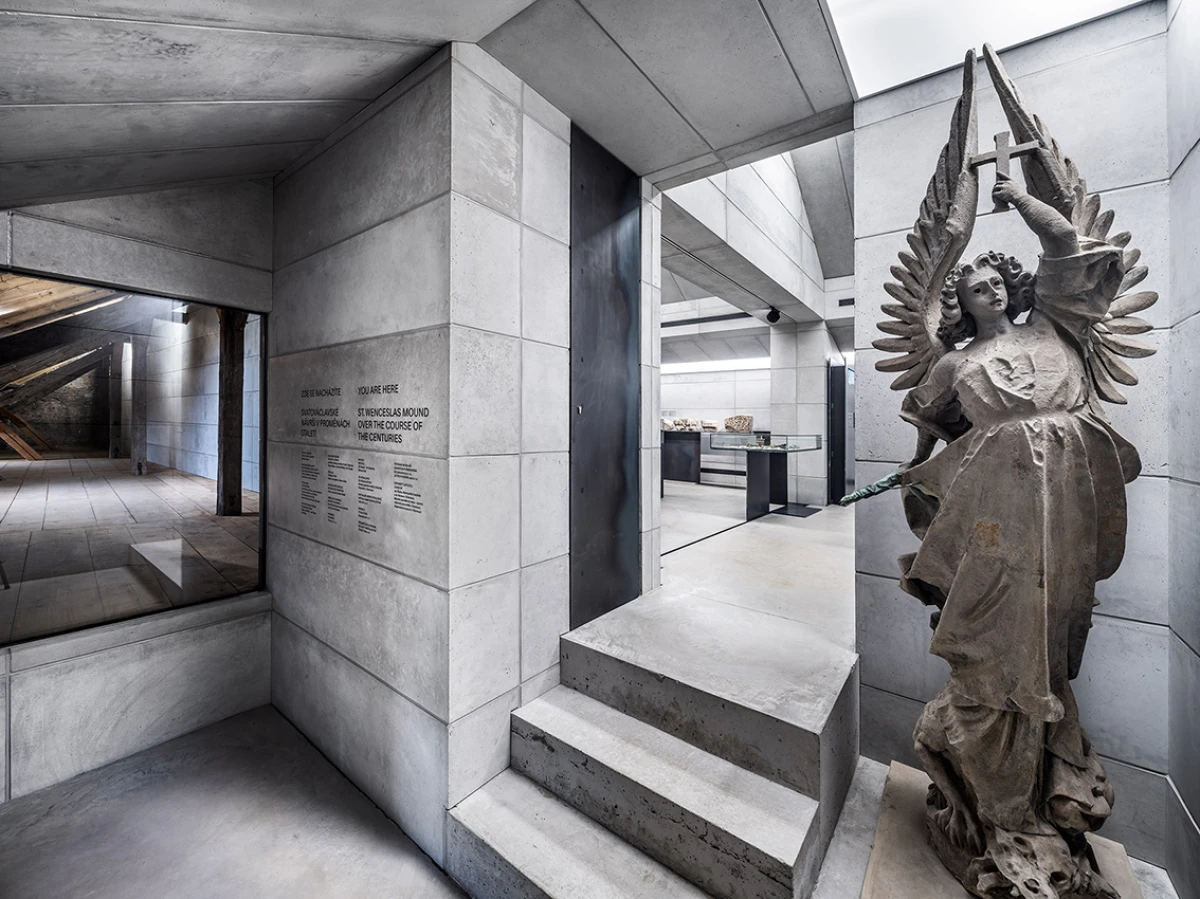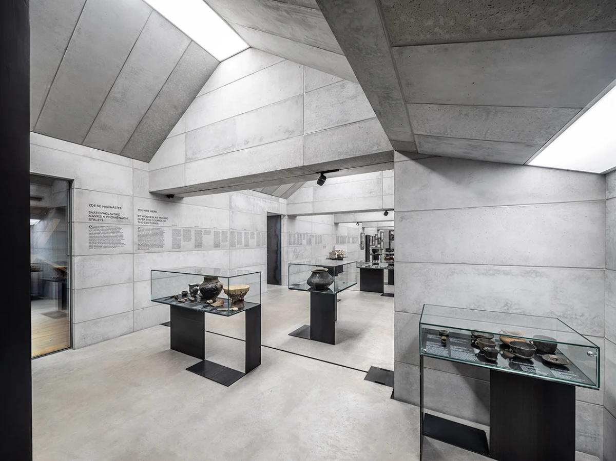 Návrh nového výstavního sálu v podkroví kapitulního děkanství navazuje na úpravy z let 1998‒2006, kdy vzniklo Arcidiecézní muzeum Olomouc. Při jeho promýšlení jsme si kladli otázku míry zásahů do stávajícího podkroví. Nepřišlo nám vhodné izolovat dřevěné konstrukce, proto jsme zamítli standardní zateplení půdního prostoru. Naše koncepce respektuje dochované konstrukce, které ponecháváme v původním stavu, včetně krytiny. Do prostoru vkládáme betonový objekt s vrchním osvětlením, jenž má dostatek svislých stěn pro vystavování. Přejímá geometrii zkoseného podkroví s tím, že si udržuje odstup od historických konstrukcí. Jedná se o jakousi matrjošku, kdy je menší dům vsazený do většího. Objekt jsme navrhovali, jako by byl umístěn ve venkovním prostředí. Jediné, co jsme nemuseli řešit, byla izolace proti vodě – tu zajišťuje stávající střecha. Všechny obvodové konstrukce nového objektu splňují tepelně-technické parametry. Zároveň jsme do nich integrovali veškeré technologie jako vytápění, vzduchotechniku či osvětlení. Samotný půdní prostor se obešel bez nových technologií a izolací. Nové tedy odpovídá naší době a staré si uchovává patinu i atmosféru. V podkroví nalezneme stálou expozici mapující historii svatováclavského návrší od pravěku po současnost. Do té jsme navrhli kovové sokly pro exponáty a stojany pro virtuální procházky návrším. Z výstavního sálu lze proskleným otvorem spatřit vrchní část klenby, jež je zajímavým dokladem pestrého vývoje děkanství. Dalším prosklením je pak možné nahlédnout do zbylé části podkroví, ponechané ve stávajícím stavu, kde se také dají vystavovat některé exponáty. Na stálou expozici navazuje edukační místnost se zázemím a skladem.