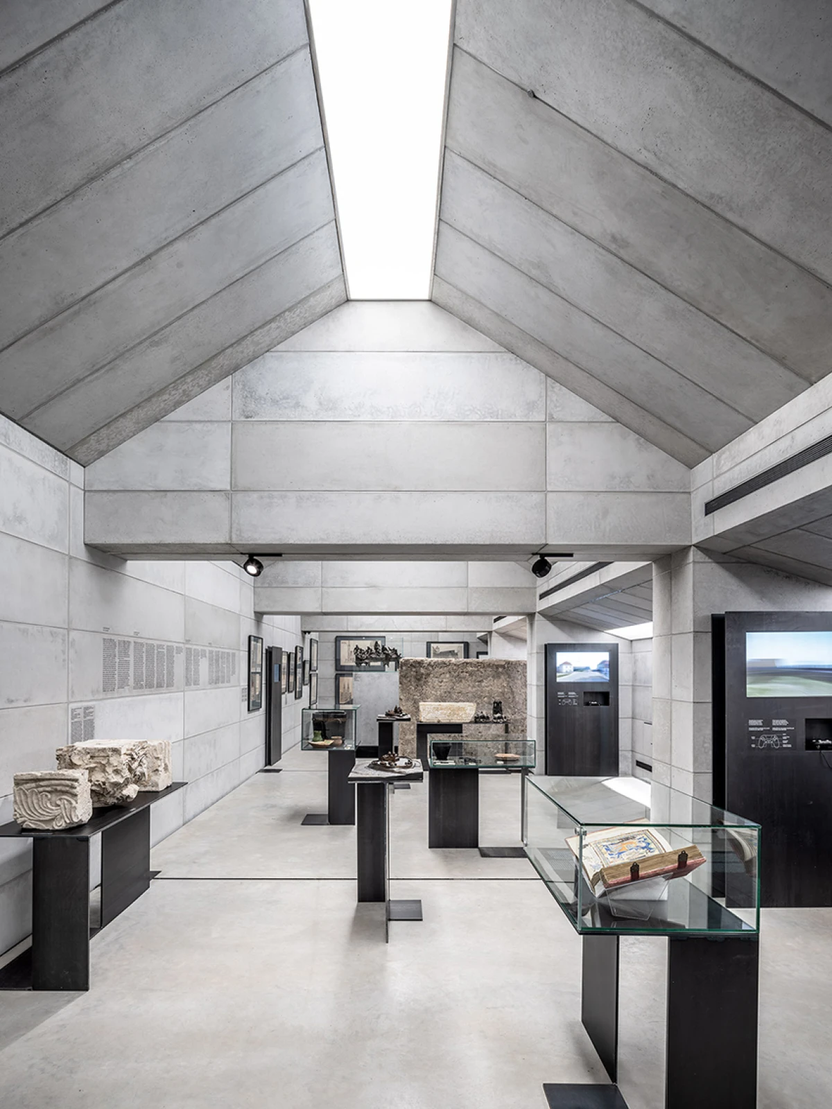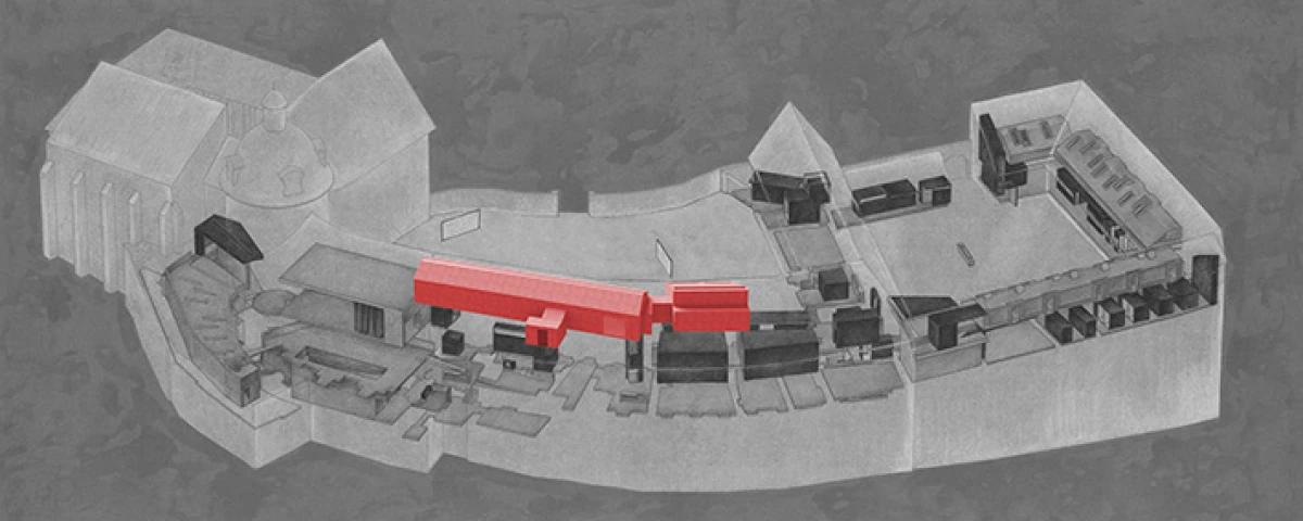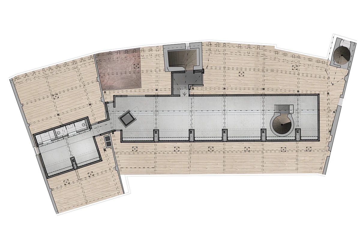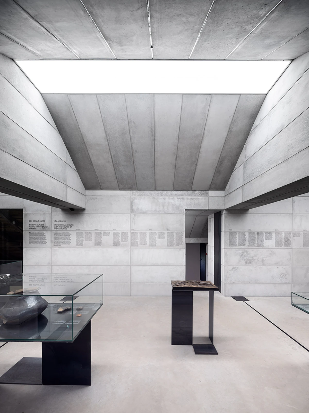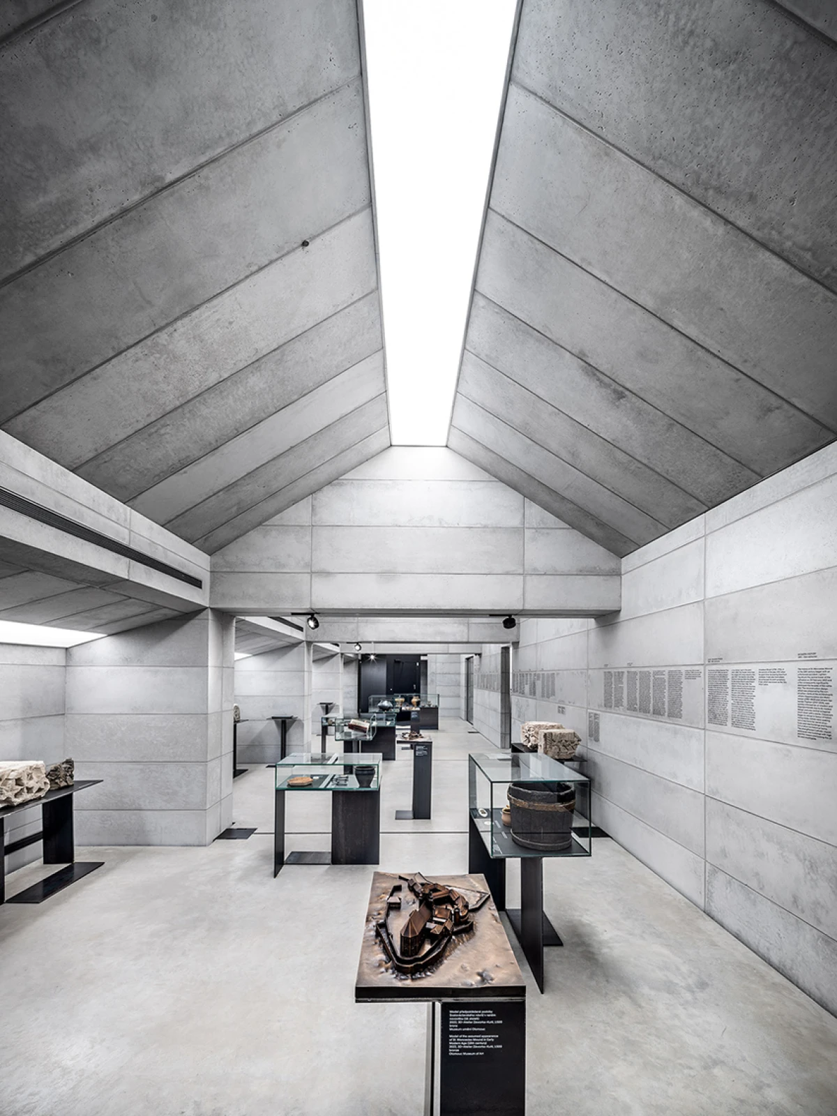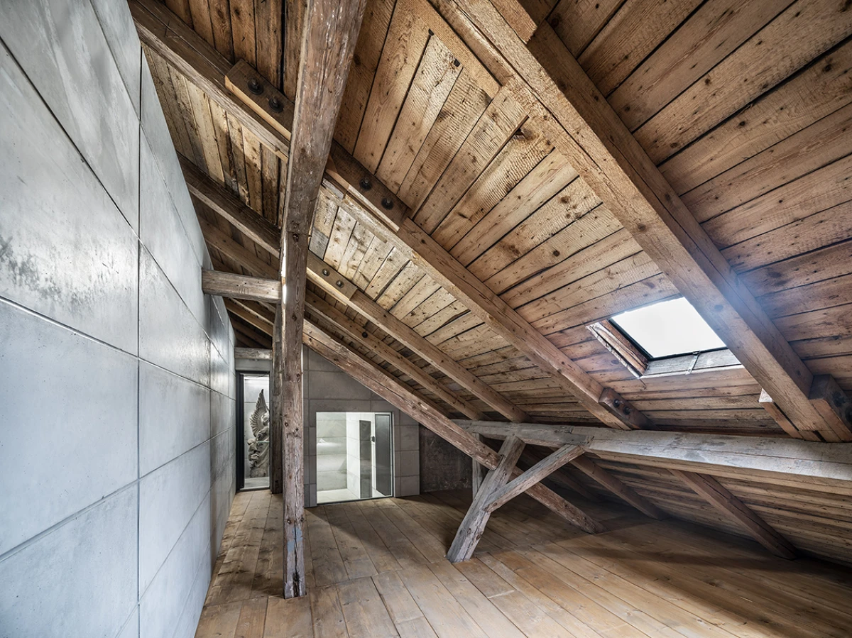 Návrh nového výstavního sálu v podkroví kapitulního děkanství navazuje na úpravy z let 1998‒2006, kdy vzniklo Arcidiecézní muzeum Olomouc. Při jeho promýšlení jsme si kladli otázku míry zásahů do stávajícího podkroví. Nepřišlo nám vhodné izolovat dřevěné konstrukce, proto jsme zamítli standardní zateplení půdního prostoru. Naše koncepce respektuje dochované konstrukce, které ponecháváme v původním stavu, včetně krytiny. Do prostoru vkládáme betonový objekt s vrchním osvětlením, jenž má dostatek svislých stěn pro vystavování. Přejímá geometrii zkoseného podkroví s tím, že si udržuje odstup od historických konstrukcí. Jedná se o jakousi matrjošku, kdy je menší dům vsazený do většího. Objekt jsme navrhovali, jako by byl umístěn ve venkovním prostředí. Jediné, co jsme nemuseli řešit, byla izolace proti vodě – tu zajišťuje stávající střecha. Všechny obvodové konstrukce nového objektu splňují tepelně-technické parametry. Zároveň jsme do nich integrovali veškeré technologie jako vytápění, vzduchotechniku či osvětlení. Samotný půdní prostor se obešel bez nových technologií a izolací. Nové tedy odpovídá naší době a staré si uchovává patinu i atmosféru. V podkroví nalezneme stálou expozici mapující historii svatováclavského návrší od pravěku po současnost. Do té jsme navrhli kovové sokly pro exponáty a stojany pro virtuální procházky návrším. Z výstavního sálu lze proskleným otvorem spatřit vrchní část klenby, jež je zajímavým dokladem pestrého vývoje děkanství. Dalším prosklením je pak možné nahlédnout do zbylé části podkroví, ponechané ve stávajícím stavu, kde se také dají vystavovat některé exponáty. Na stálou expozici navazuje edukační místnost se zázemím a skladem.